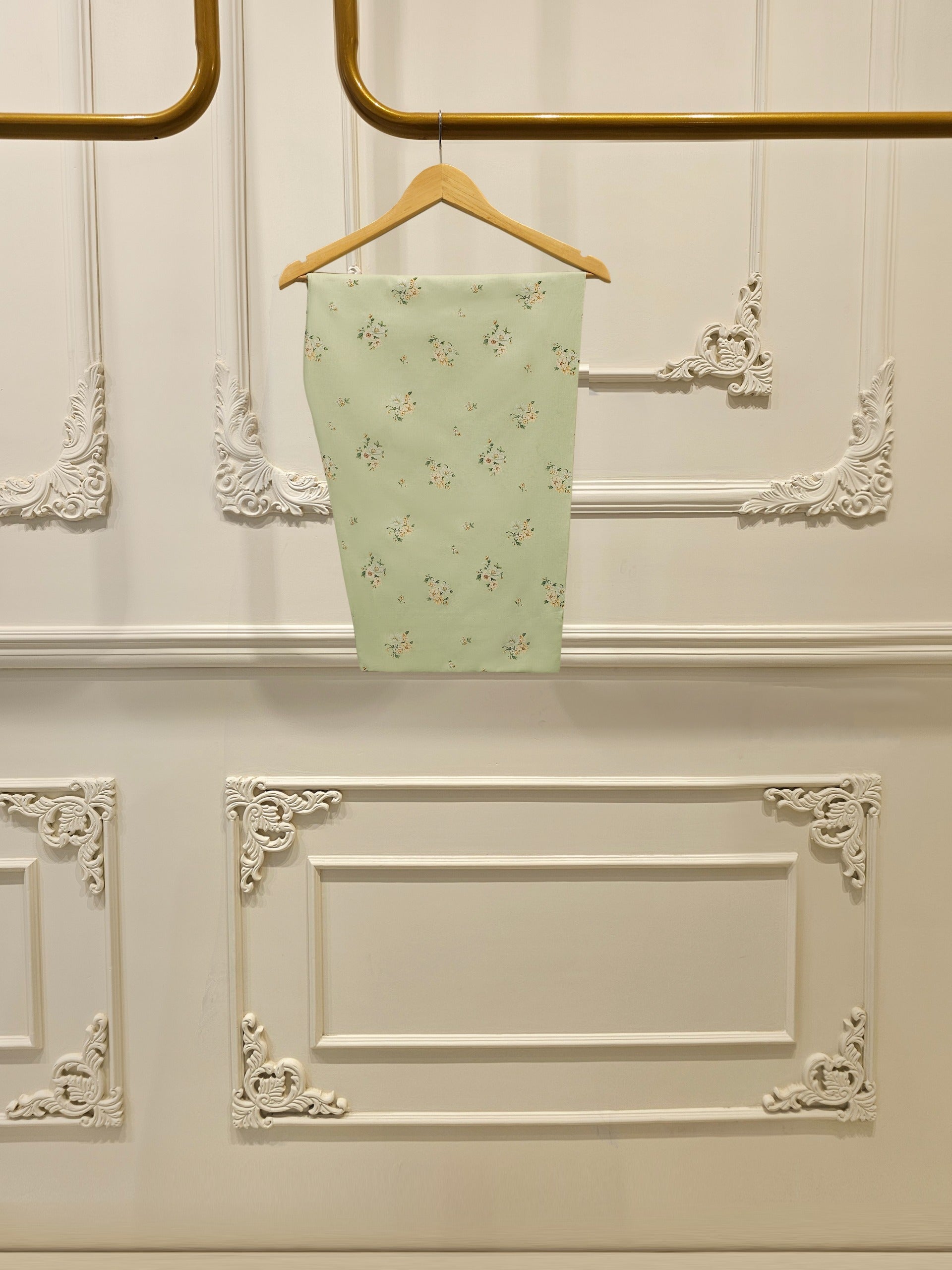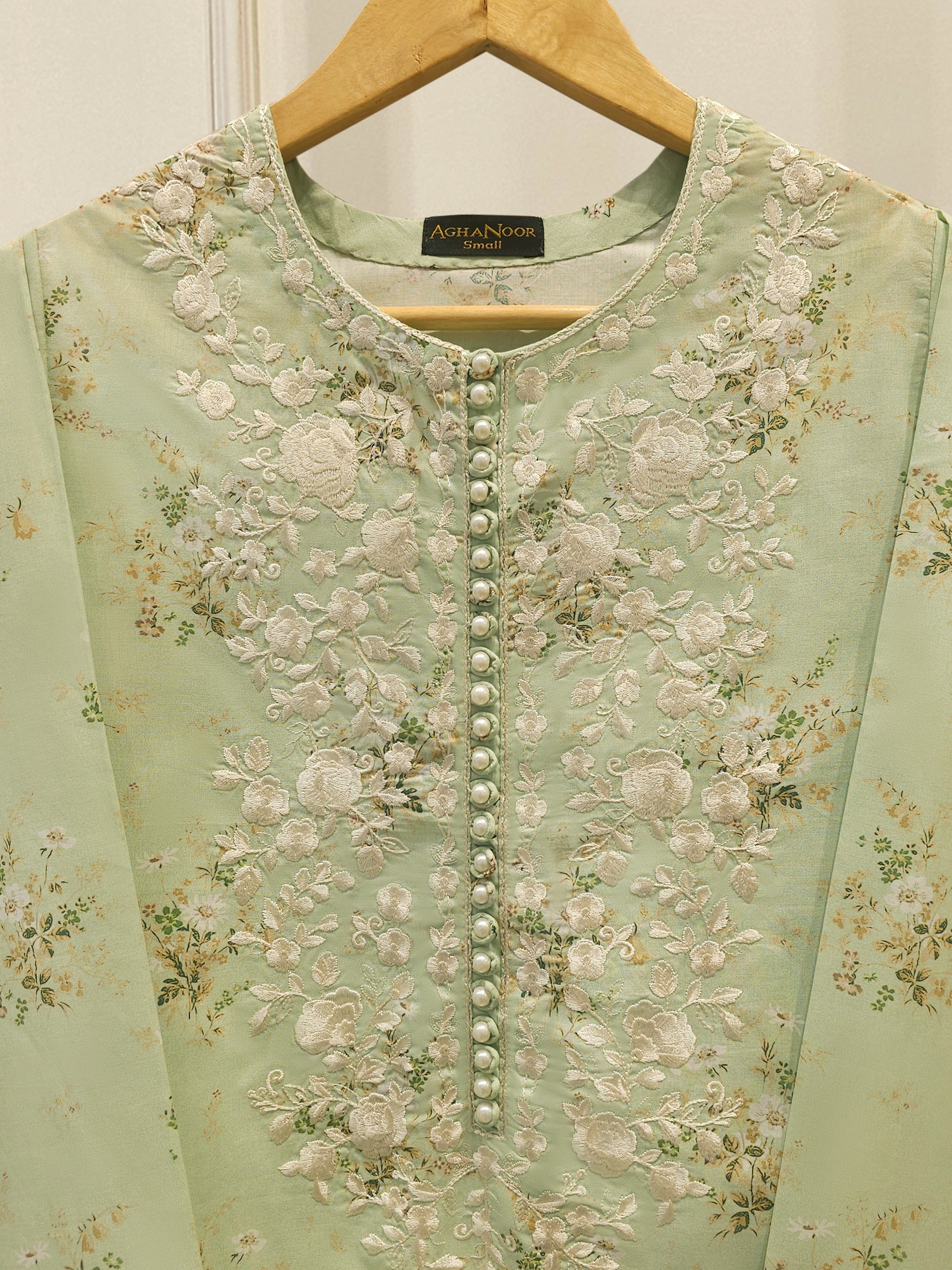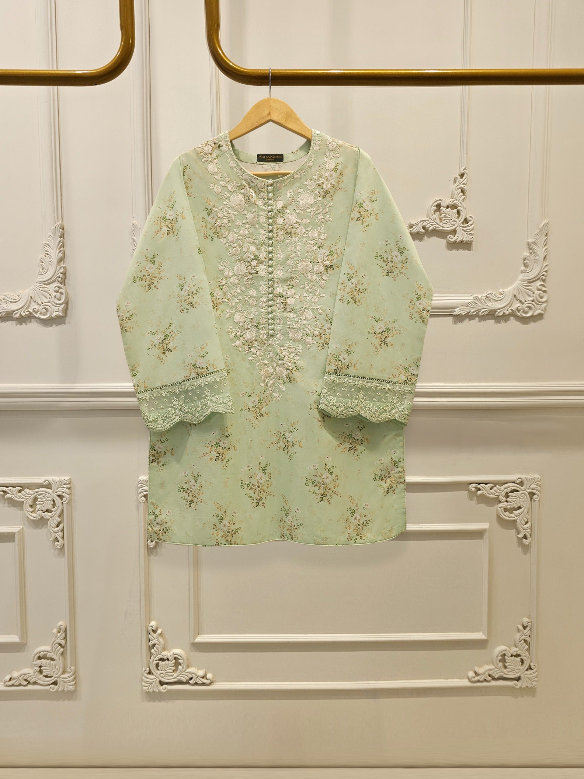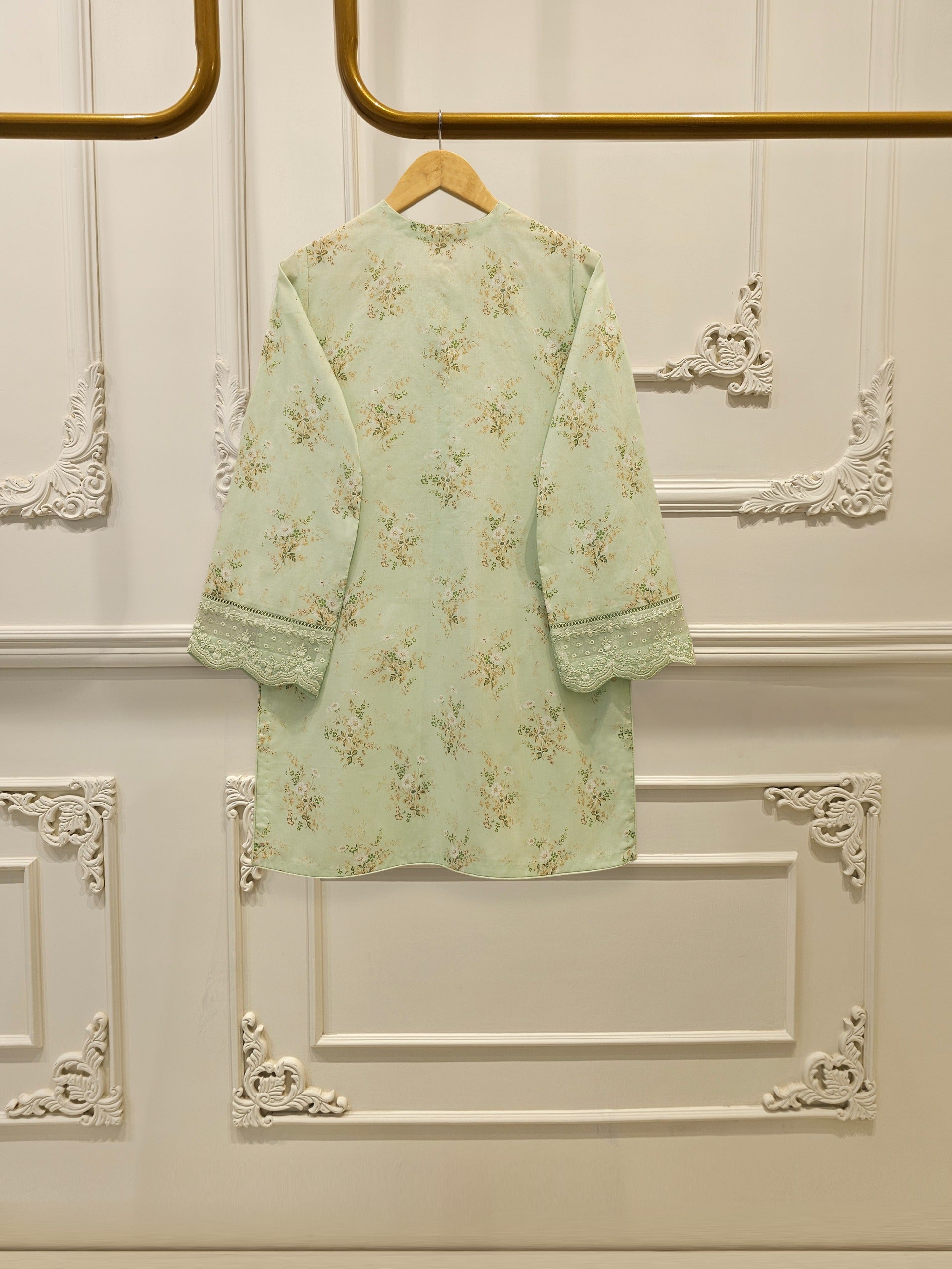 Elevate your summer wardrobe with this beautifully crafted mint green lawn shirt, featuring intricate Chikan Kari work on the sleeves and daman. Designed for timeless elegance, this piece blends breathable lawn fabric with traditional craftsmanship, perfect for festive occasions or casual sophistication. Pair it with pants for a complete look.
