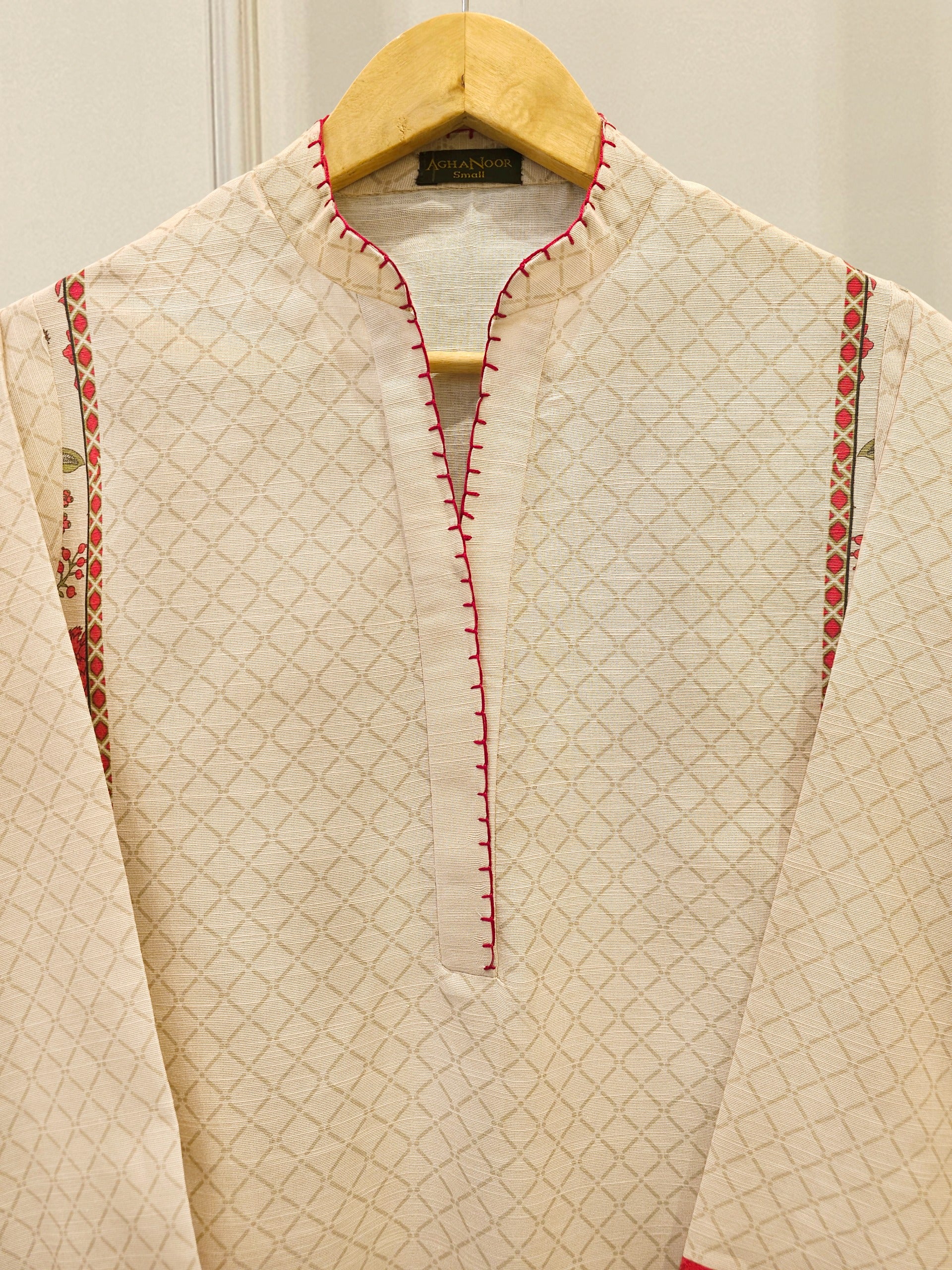 Beige printed khaddar suit features a rich, traditional design on a warm, textured fabric ideal for cooler weather. The intricate prints add a touch of elegance, while the soft yet durable khaddar material ensures comfort and style for everyday wear or casual gatherings. Perfect for autumn and winter seasons.