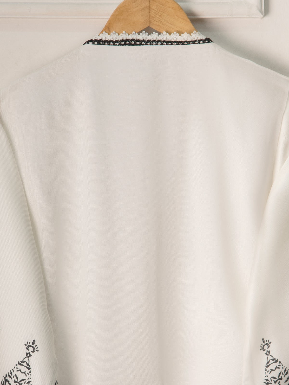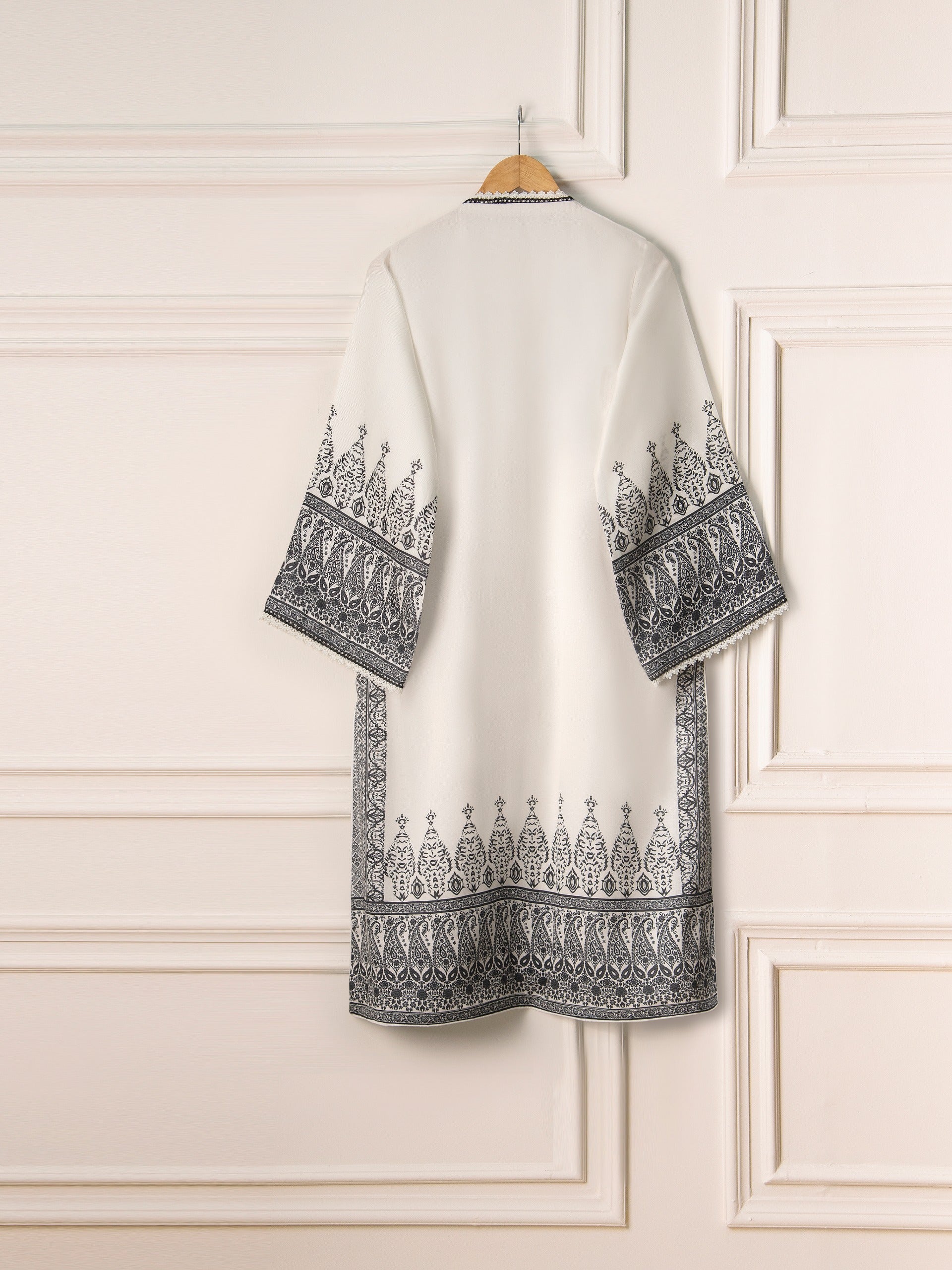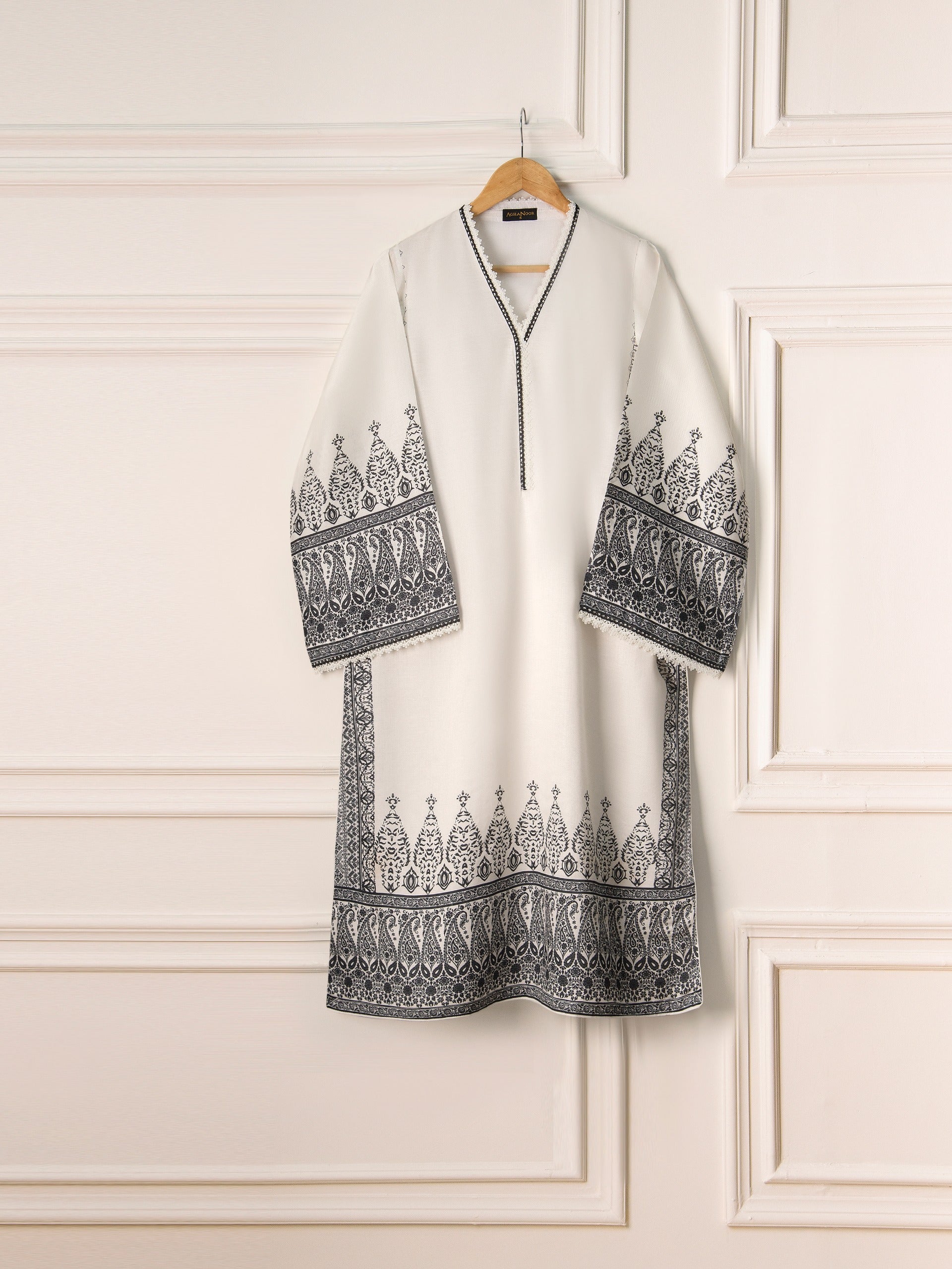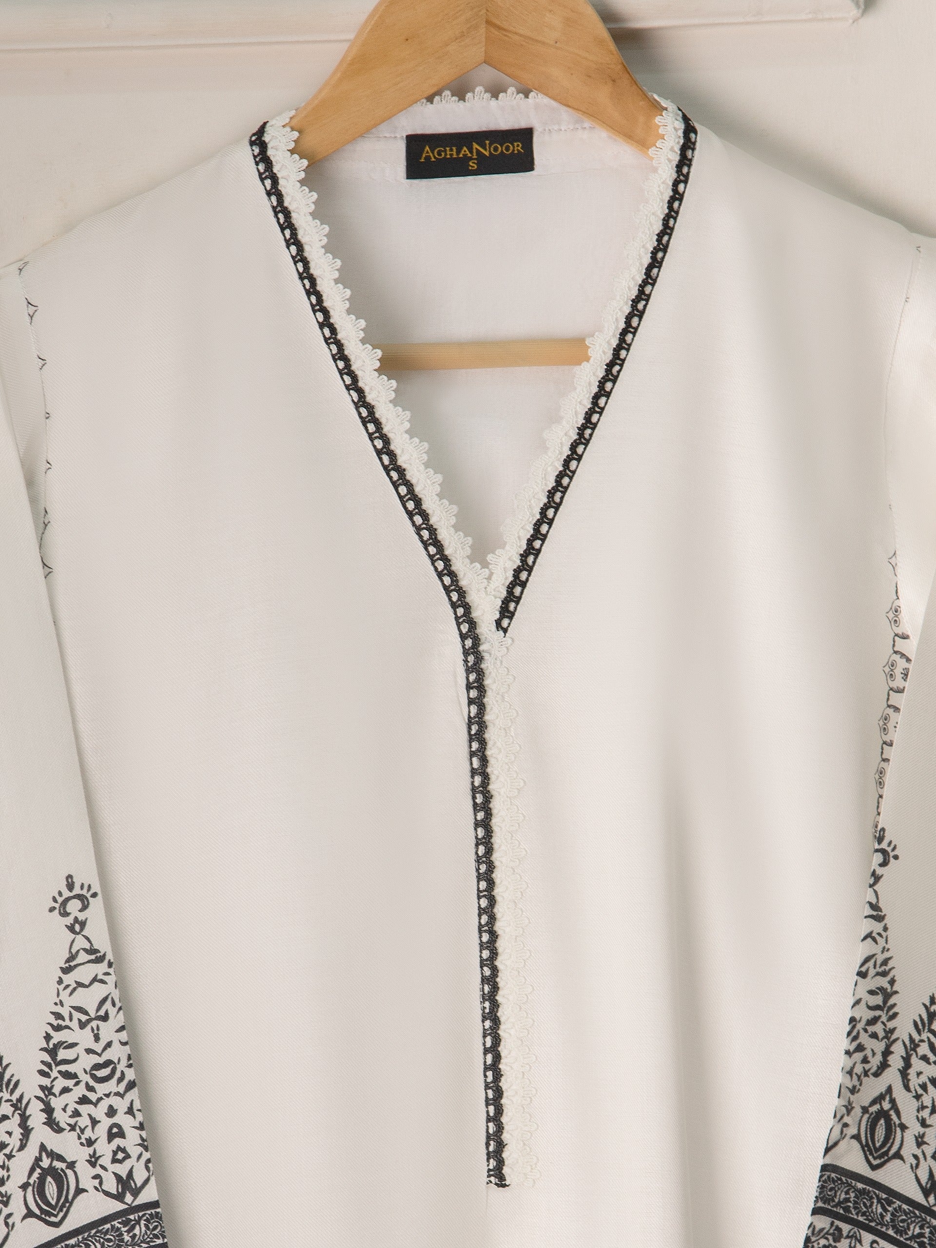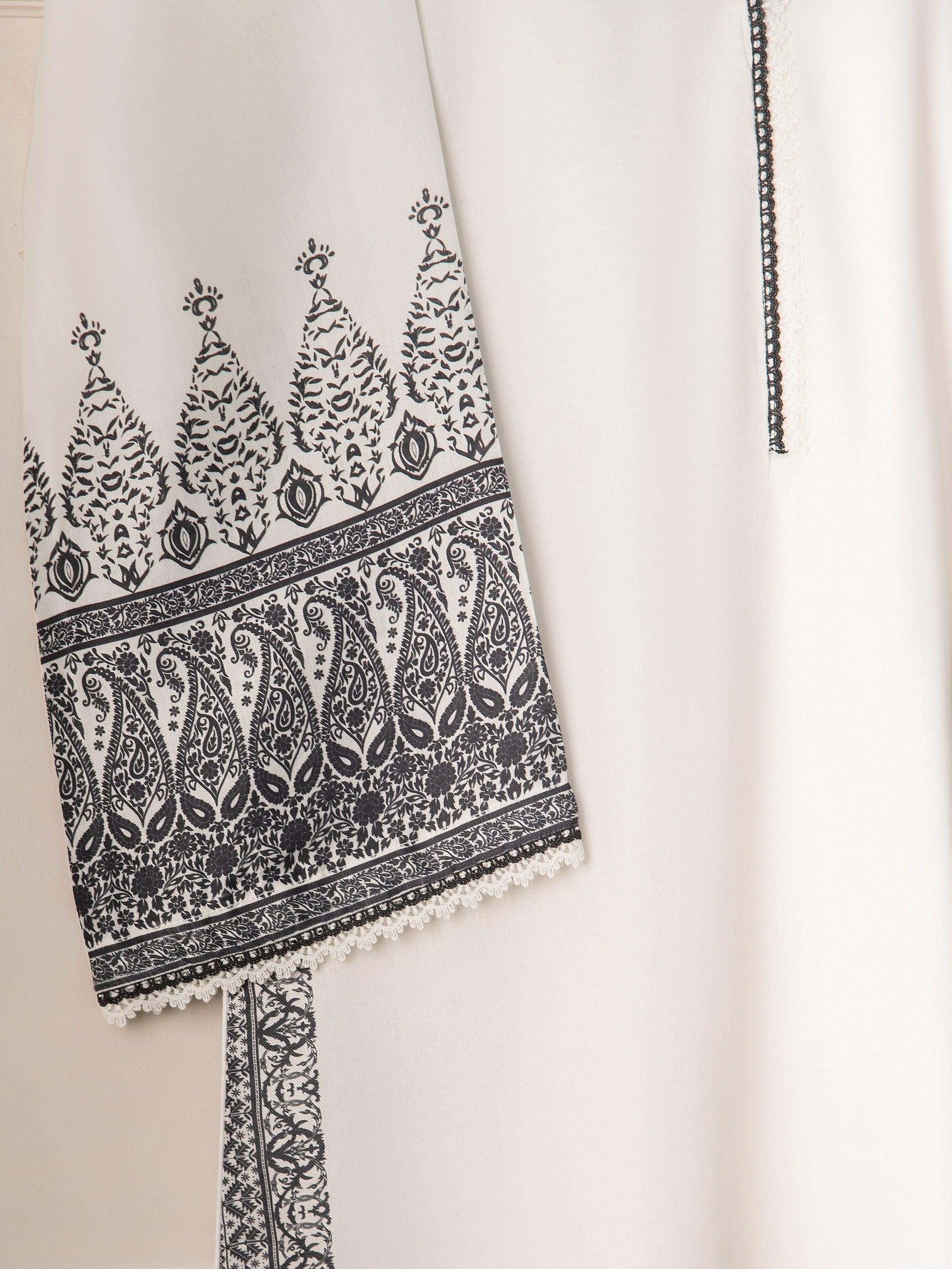 Embrace the festivities of the season in style with our white two-piece accented with intricate print. Our exquisite suit is crafted in marina fabric, printing elegance and grace. The ensemble is paired with dupatta.