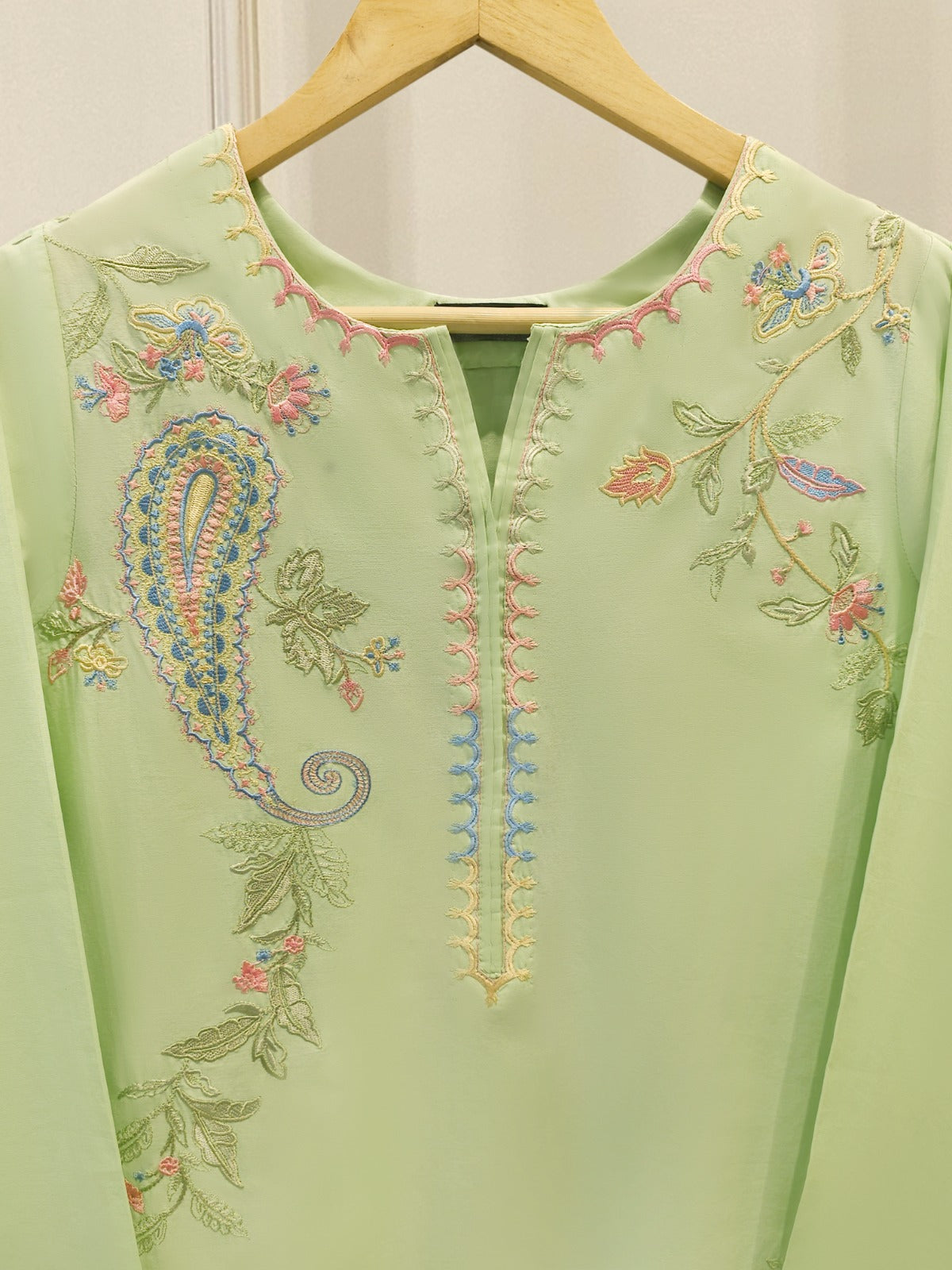 Elevate your summer wardrobe with this beautifully crafted pista green cambric shirt, featuring intricate Chikan Kari work on the sleeves and daman. Designed for timeless elegance, this piece blends breathable lawn fabric with traditional craftsmanship, perfect for festive occasions or casual sophistication. Pair it with pants for a complete look.