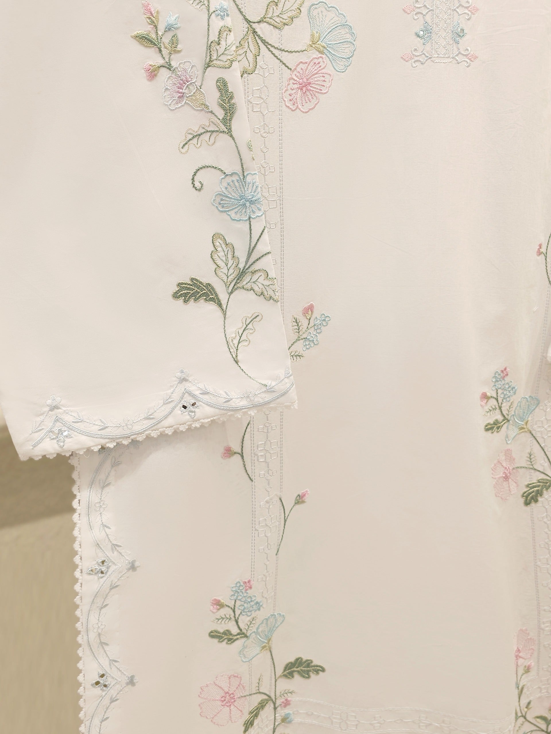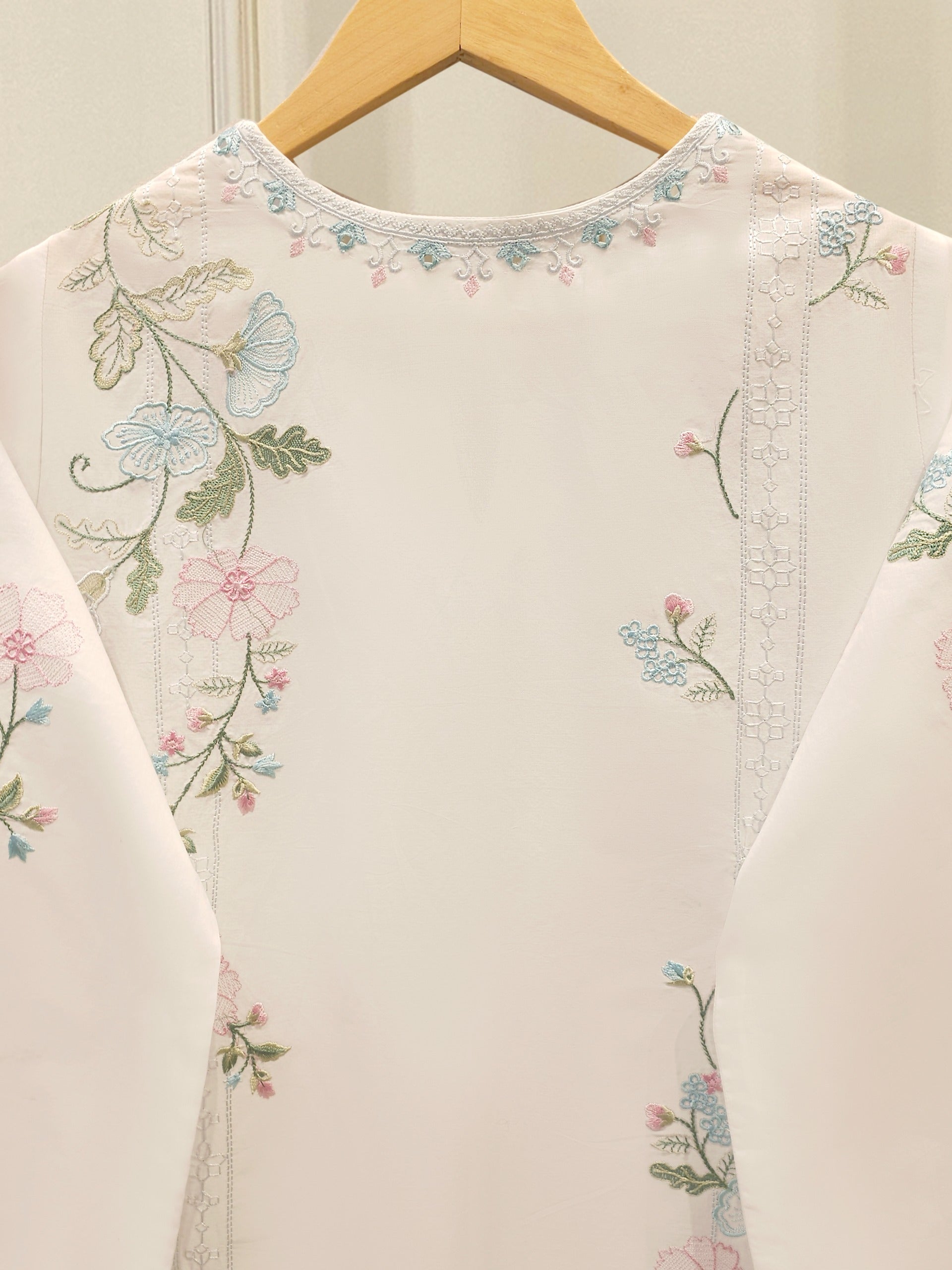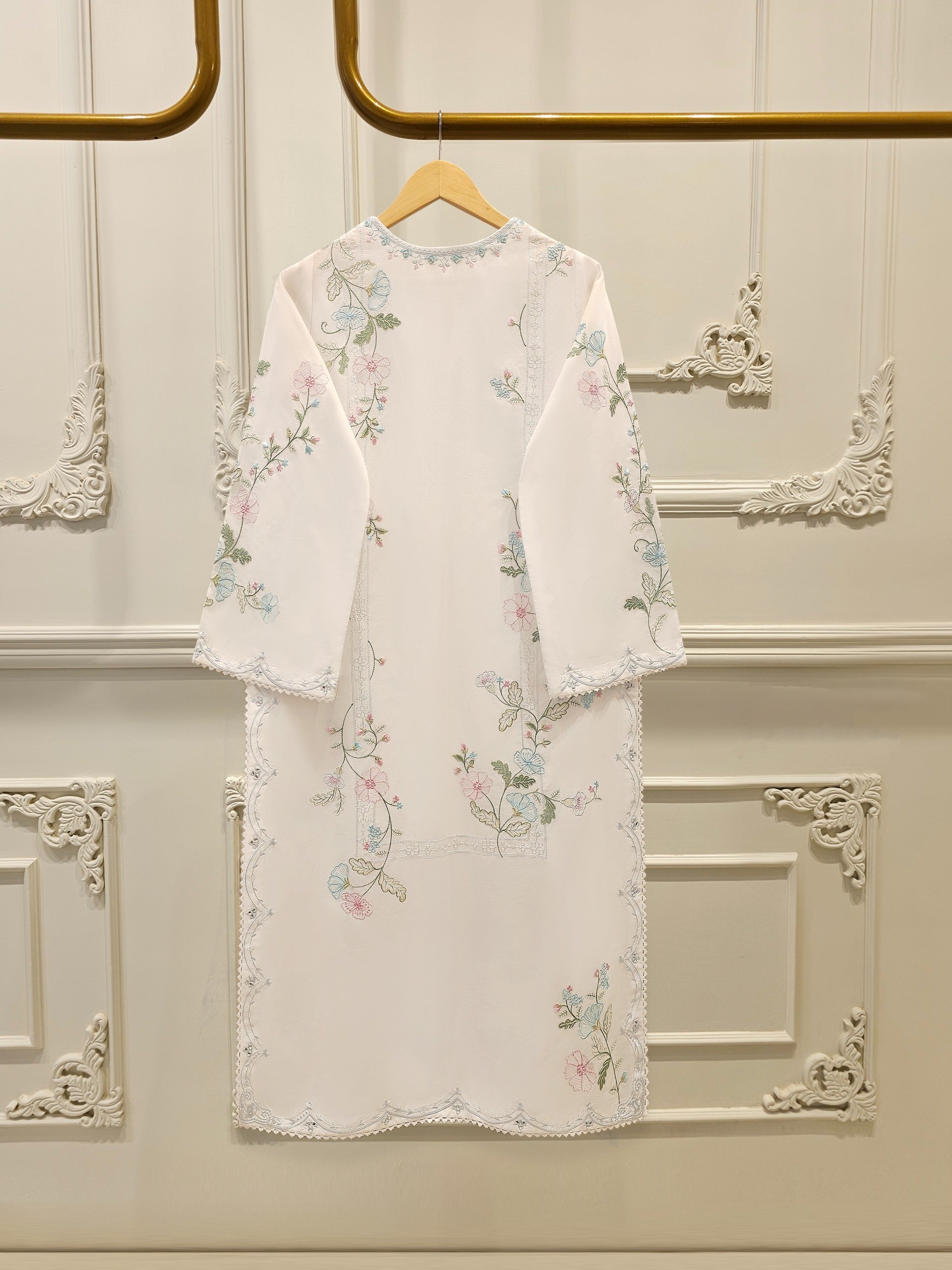 Elevate your summer wardrobe with this beautifully crafted off white lawn shirt, featuring intricate Chikan Kari work on the sleeves and daman. Designed for timeless elegance, this piece blends breathable lawn fabric with traditional craftsmanship, perfect for festive occasions or casual sophistication. Pair it with pants for a complete look.