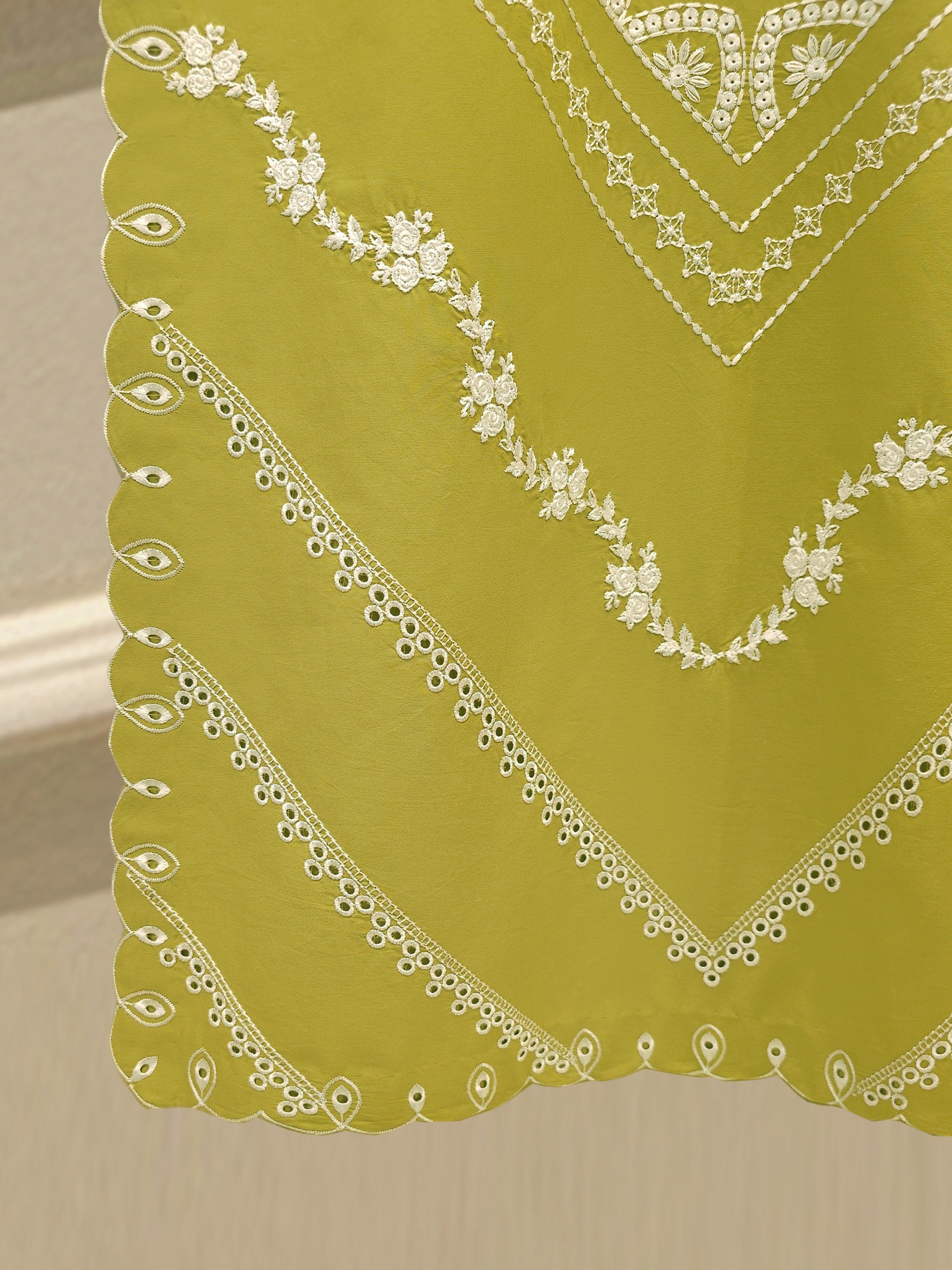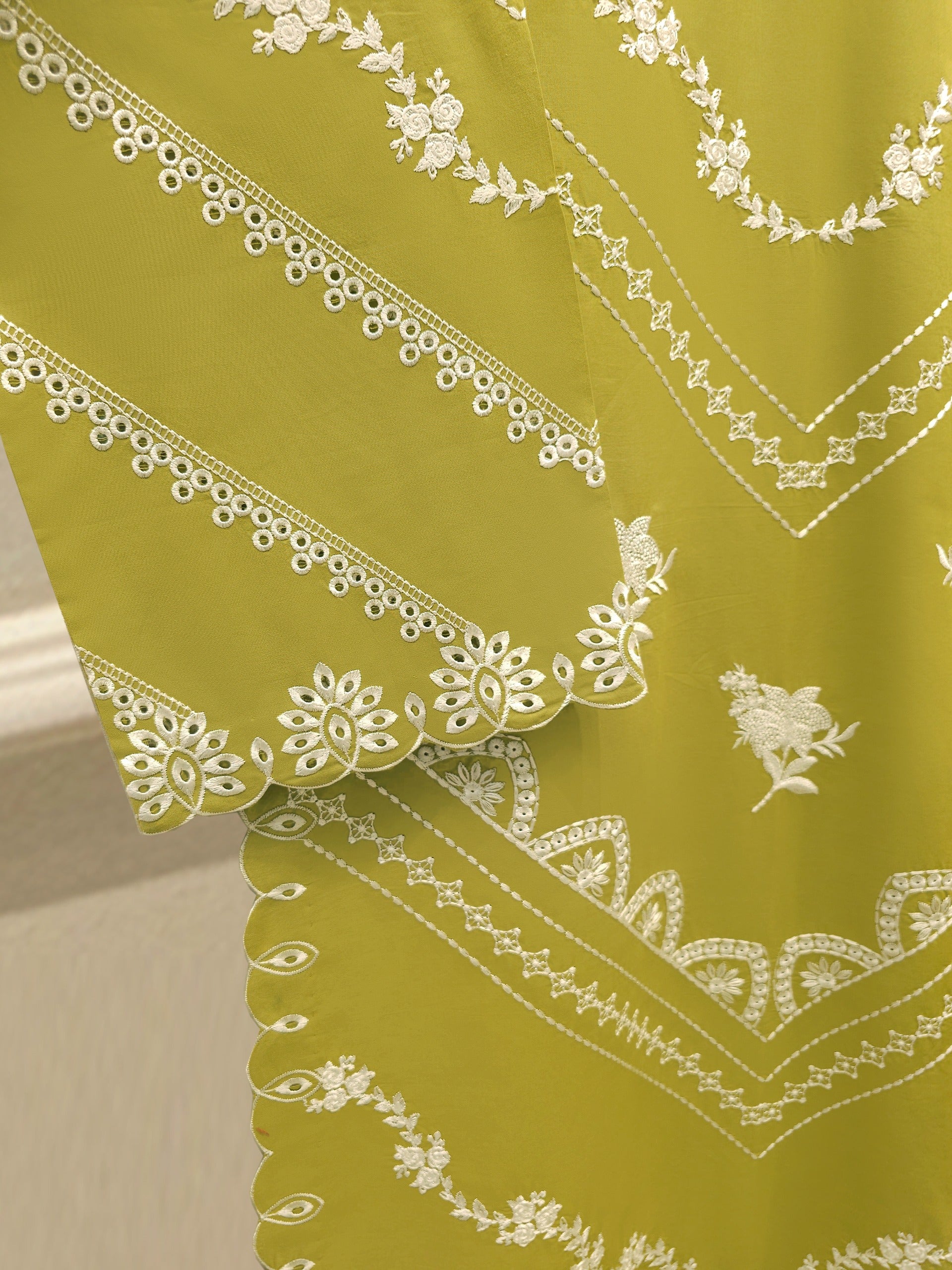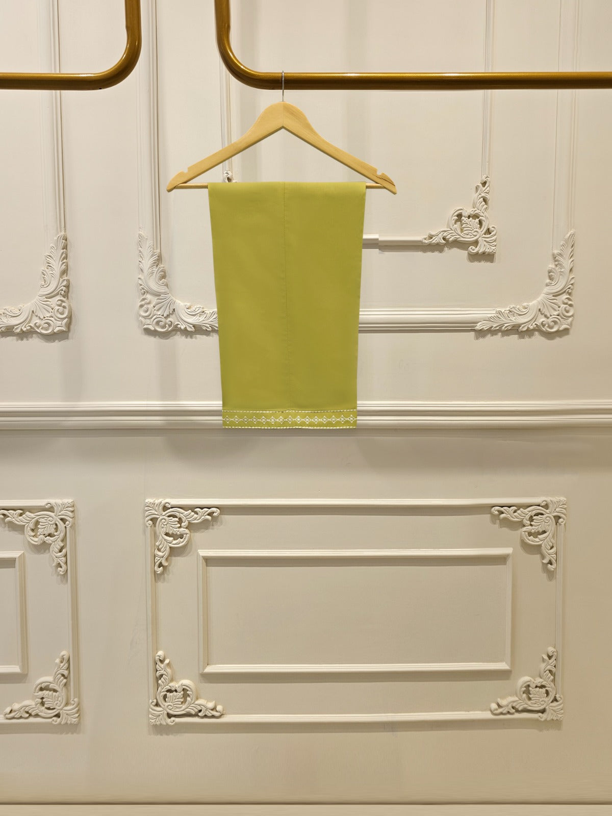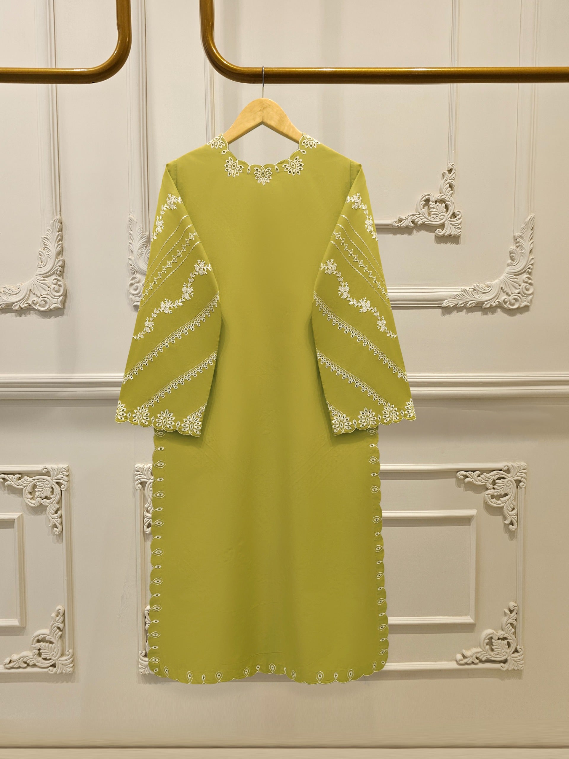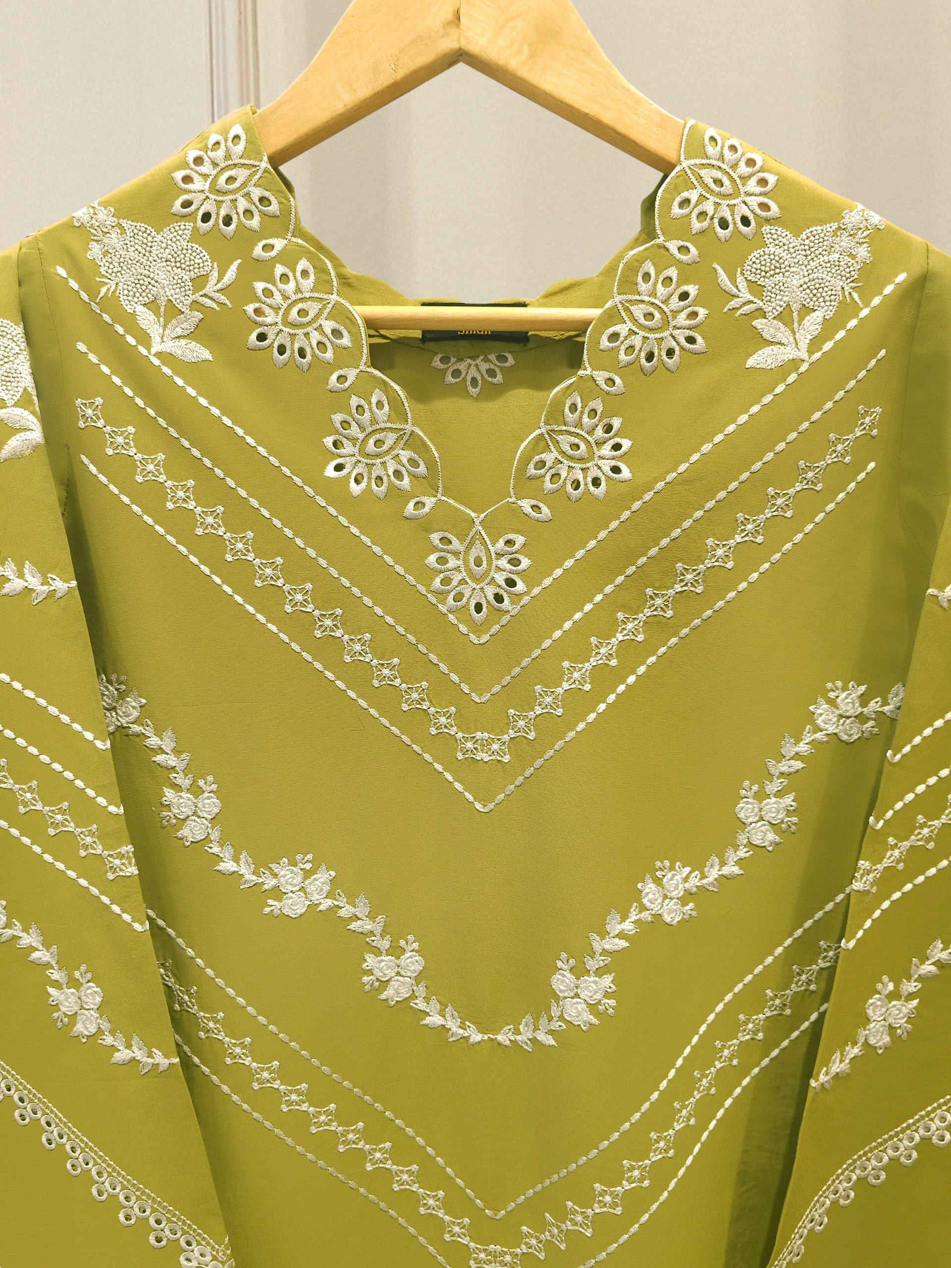 Elevate your summer wardrobe with this beautifully crafted dhani green cambric shirt, featuring intricate Chikan Kari work on the sleeves and daman. Designed for timeless elegance, this piece blends breathable lawn fabric with traditional craftsmanship, perfect for festive occasions or casual sophistication. Pair it with pants for a complete look.