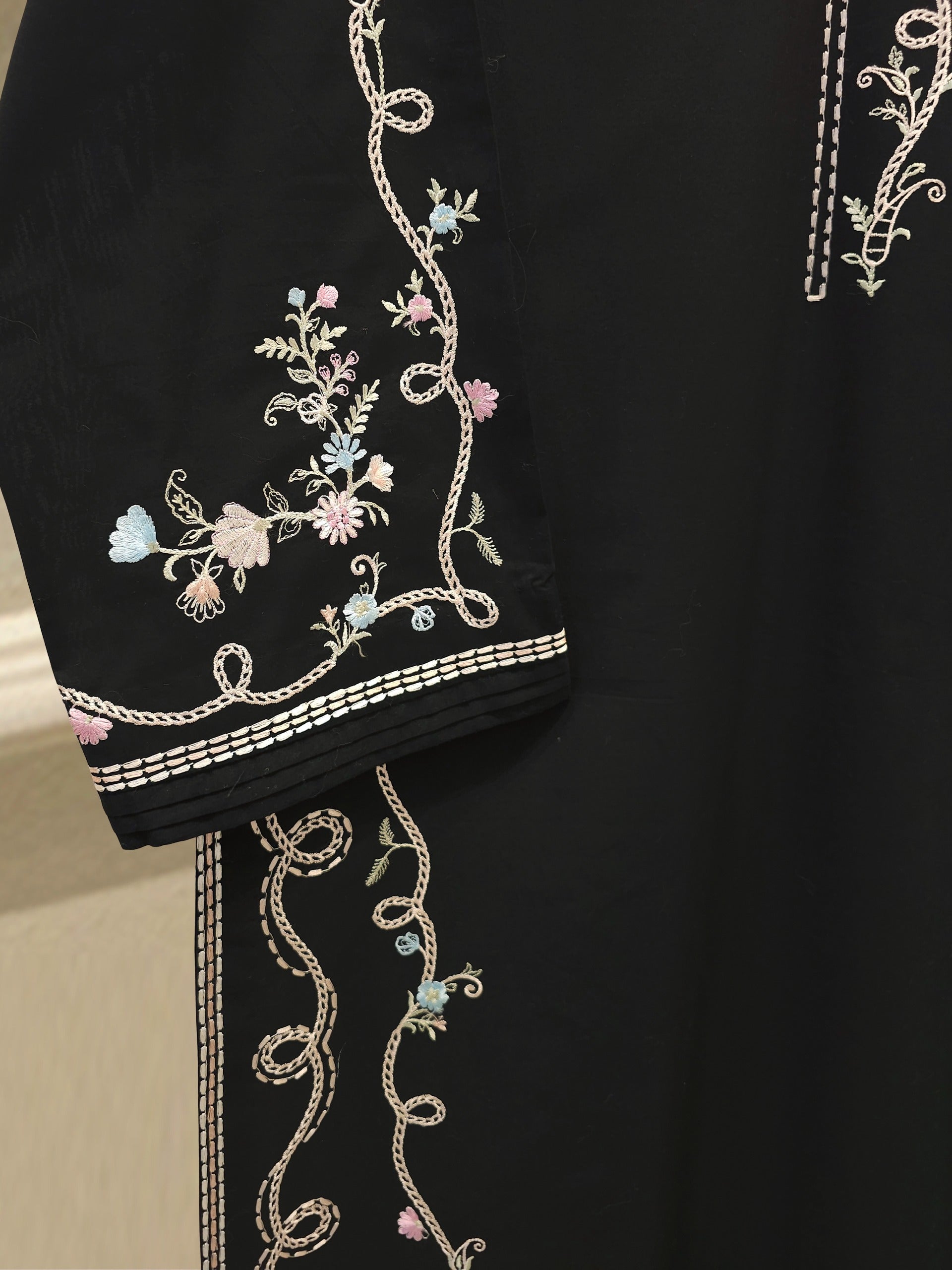 Elevate your summer wardrobe with this beautifully crafted black cambric shirt, featuring intricate Chikan Kari work on the sleeves and daman. Designed for timeless elegance, this piece blends breathable lawn fabric with traditional craftsmanship, perfect for festive occasions or casual sophistication. Pair it with pants for a complete look.