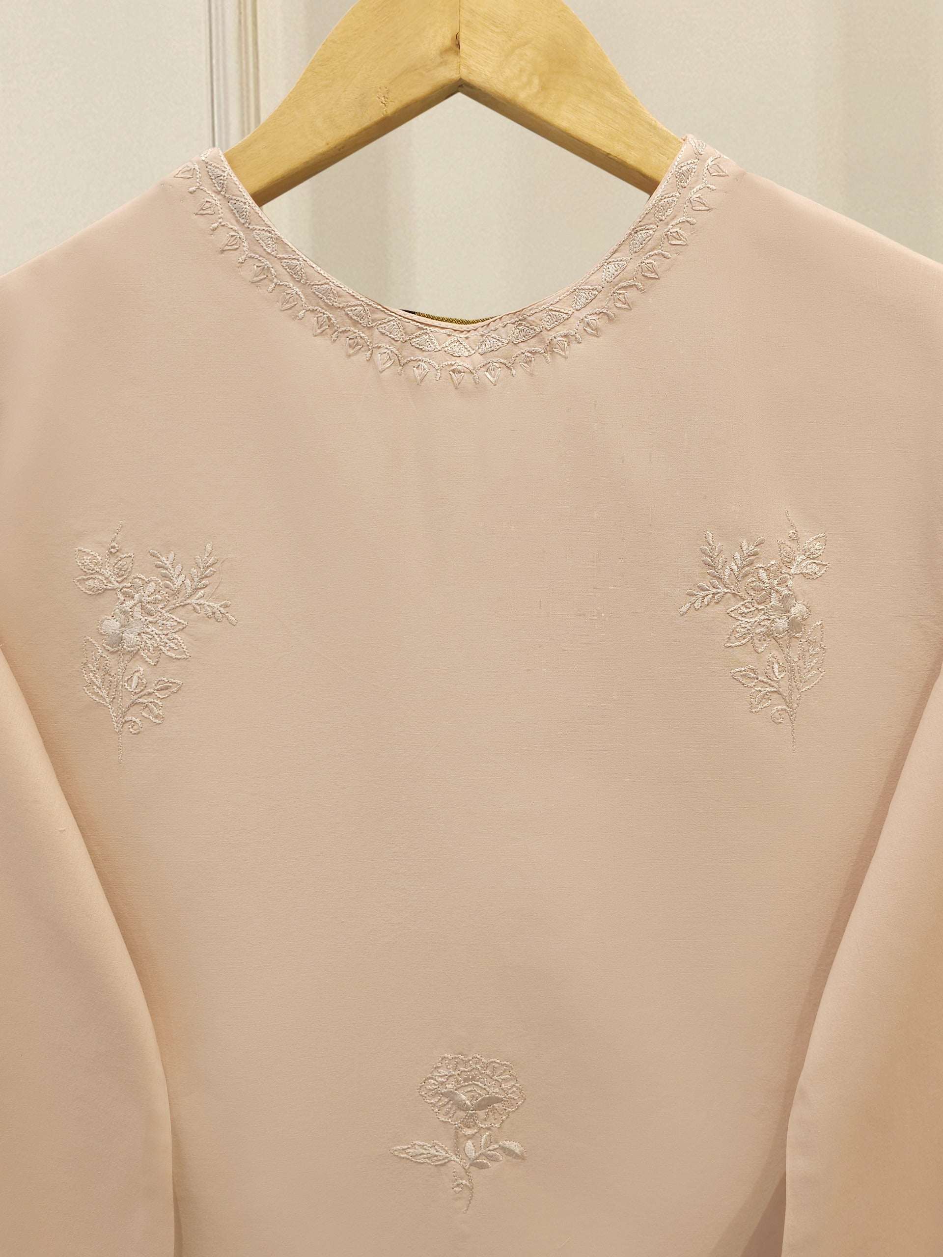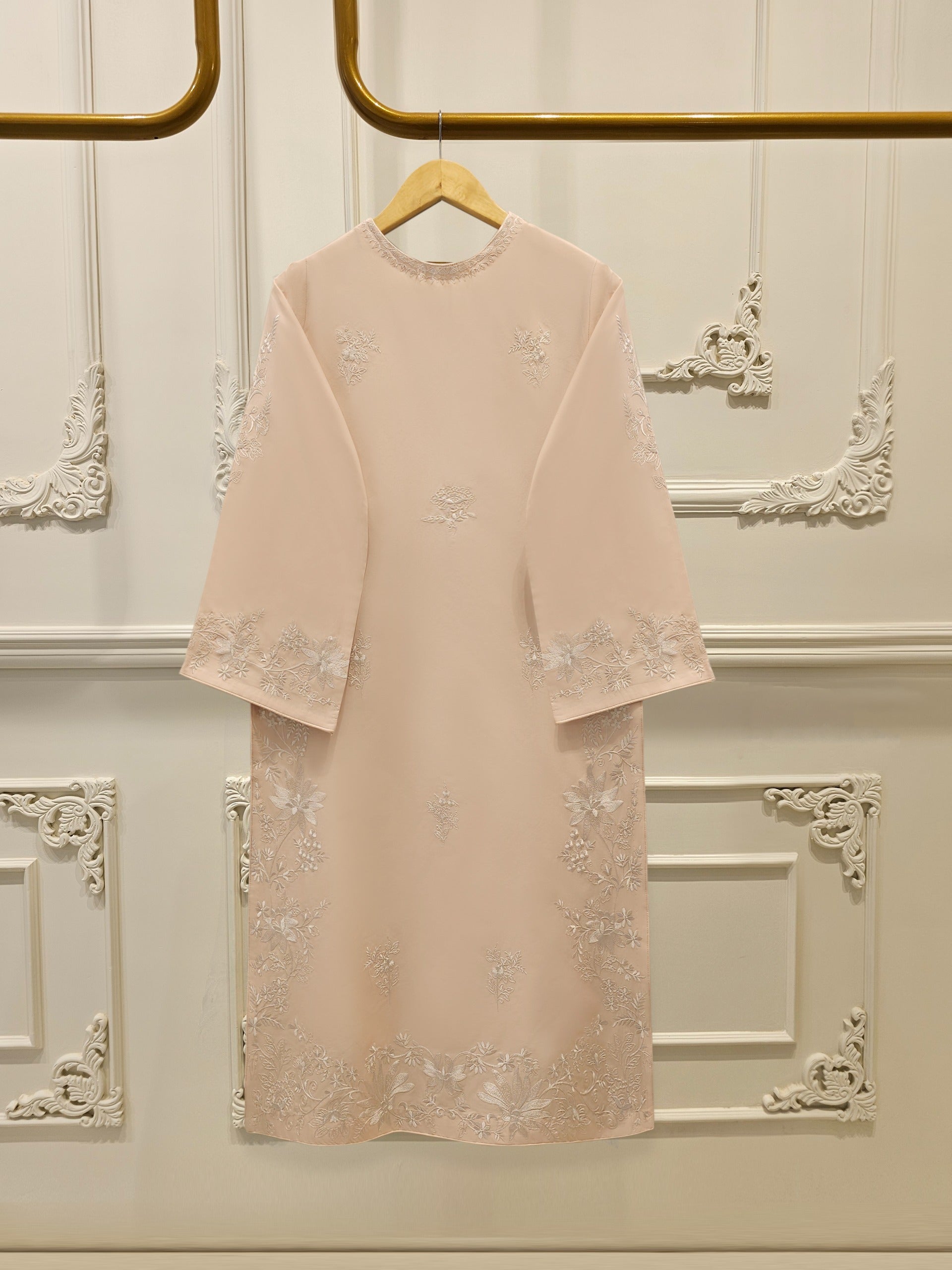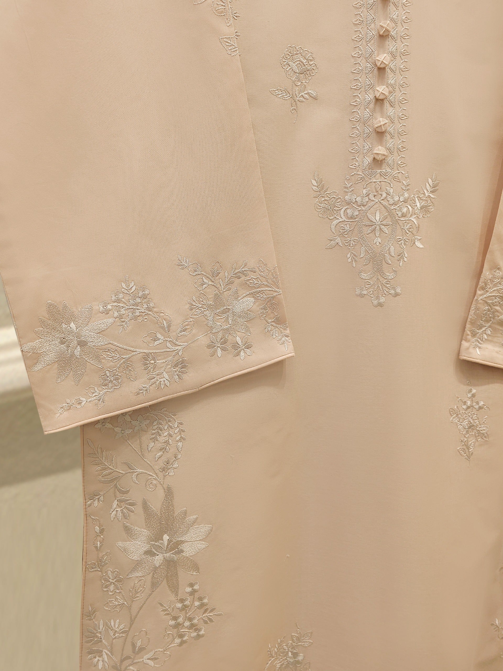 Elevate your summer wardrobe with this beautifully crafted cream cambric shirt, featuring intricate Chikan Kari work on the sleeves and daman. Designed for timeless elegance, this piece blends breathable lawn fabric with traditional craftsmanship, perfect for festive occasions or casual sophistication. Pair it with pants for a complete look.