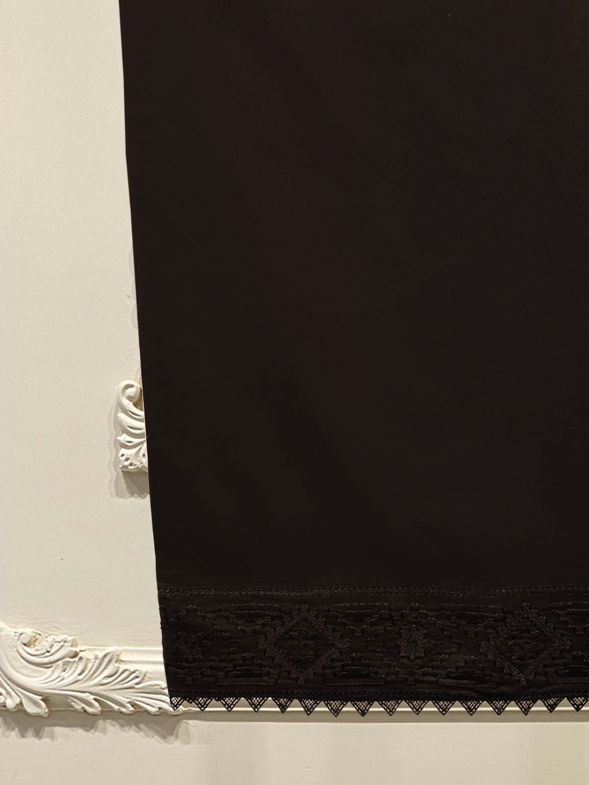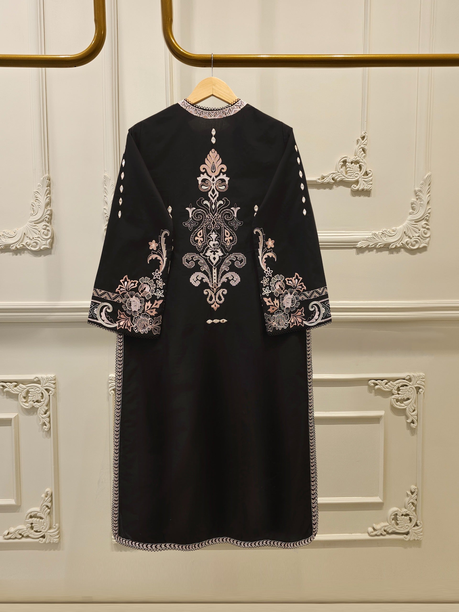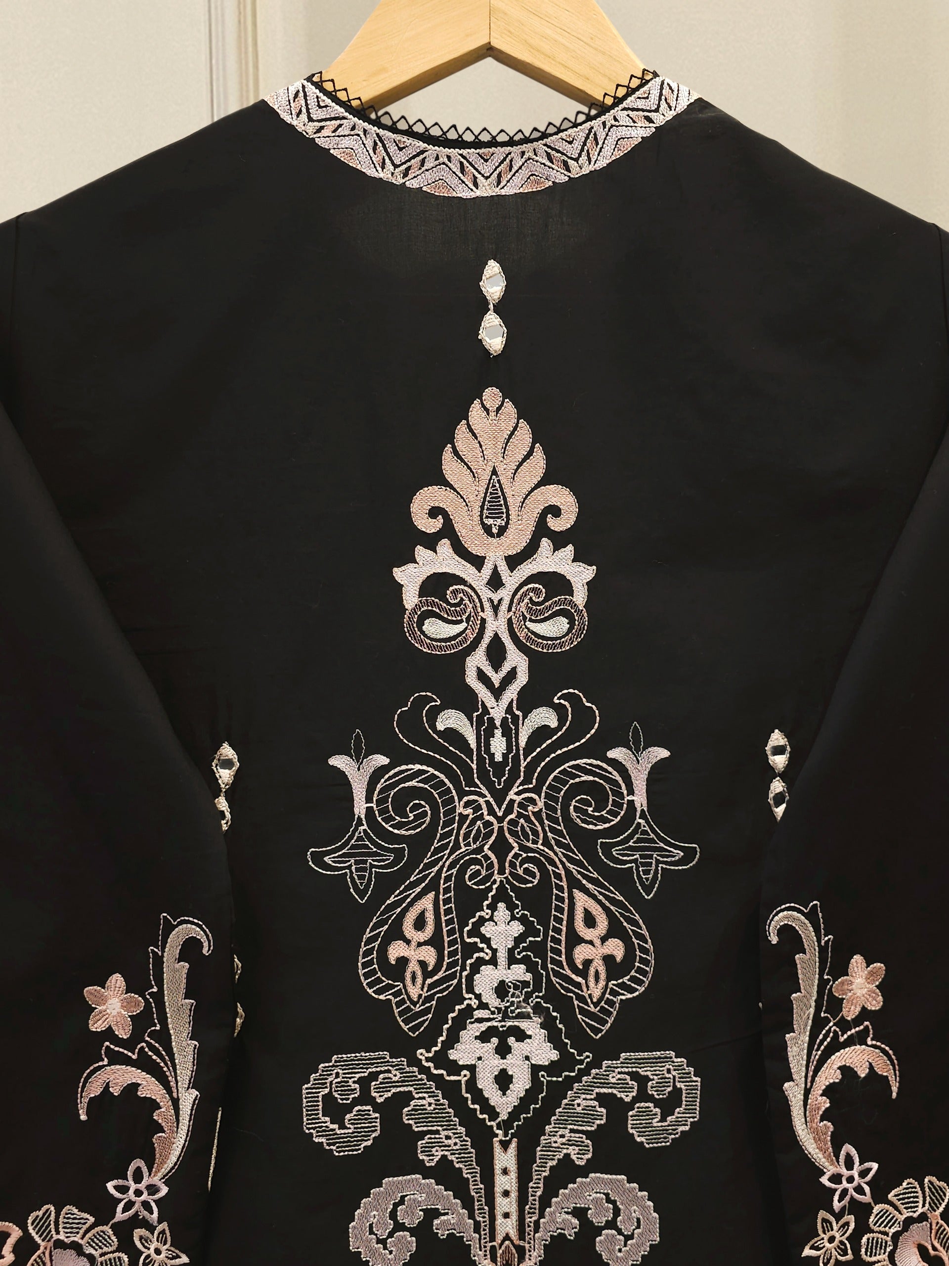 Elevate your summer wardrobe with this beautifully crafted black cambric shirt, featuring intricate Chikan Kari work on the sleeves and daman. Designed for timeless elegance, this piece blends breathable lawn fabric with traditional craftsmanship, perfect for festive occasions or casual sophistication. Pair it with pants for a complete look.