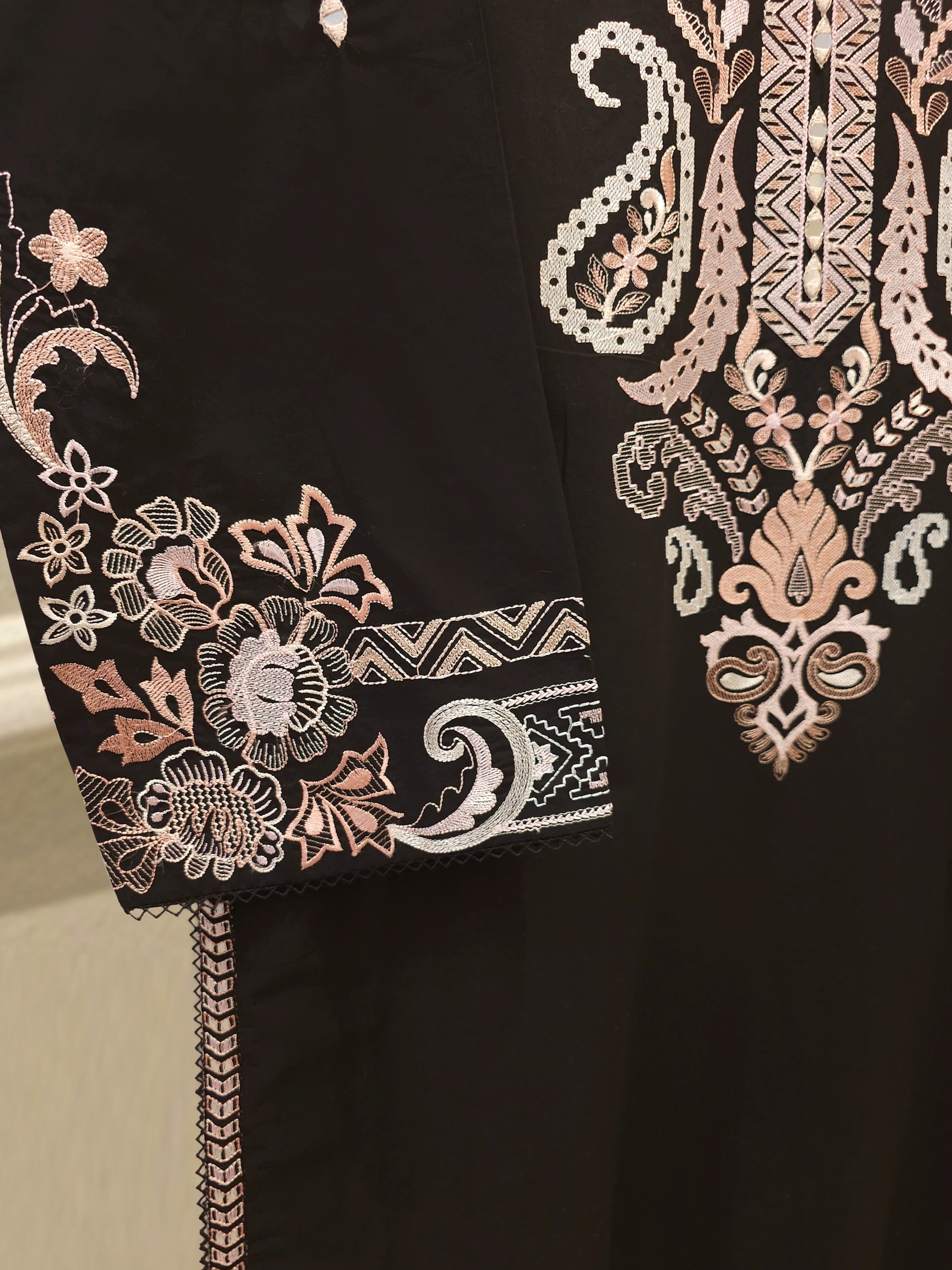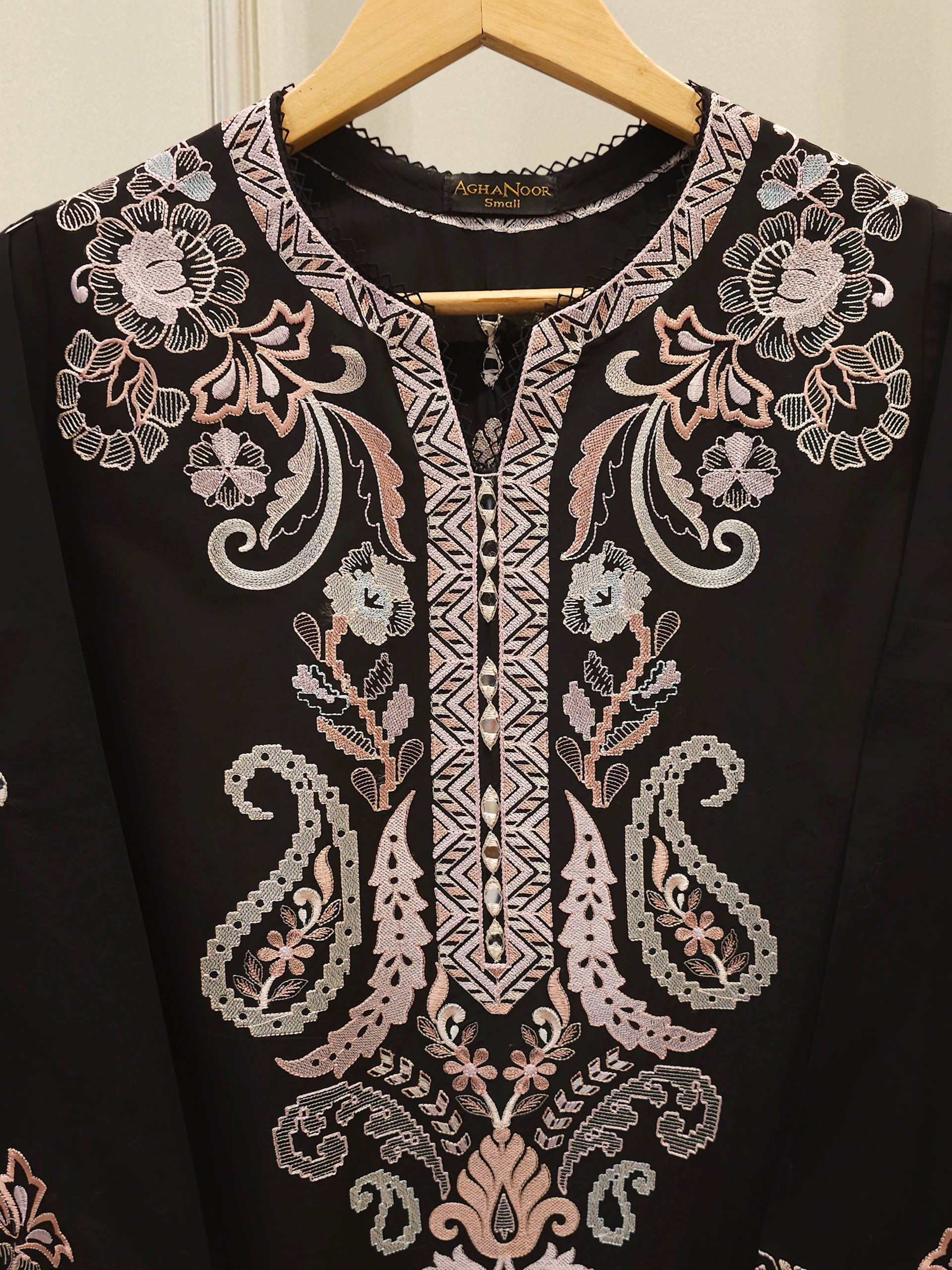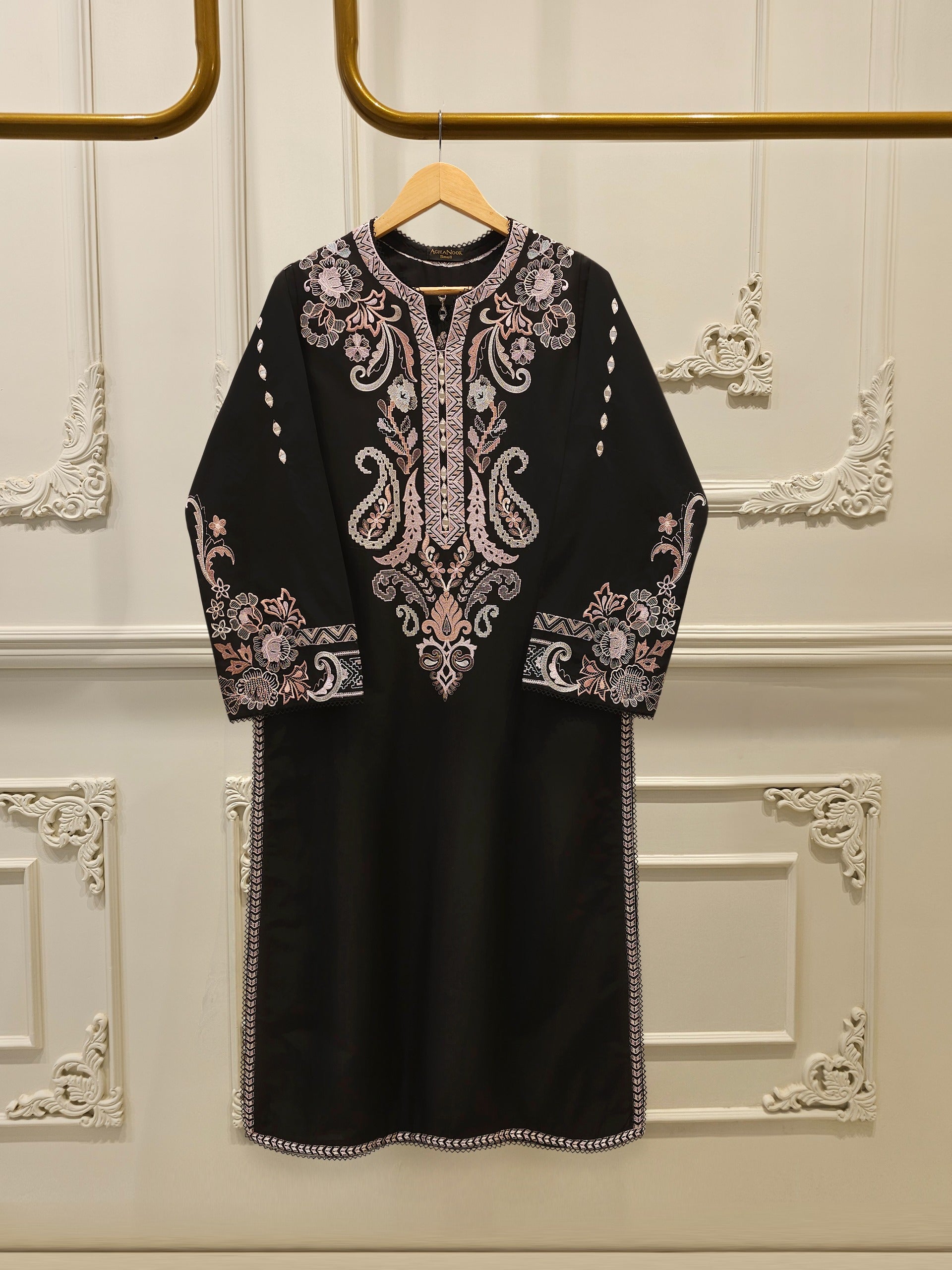 Elevate your summer wardrobe with this beautifully crafted black cambric shirt, featuring intricate Chikan Kari work on the sleeves and daman. Designed for timeless elegance, this piece blends breathable lawn fabric with traditional craftsmanship, perfect for festive occasions or casual sophistication. Pair it with pants for a complete look.