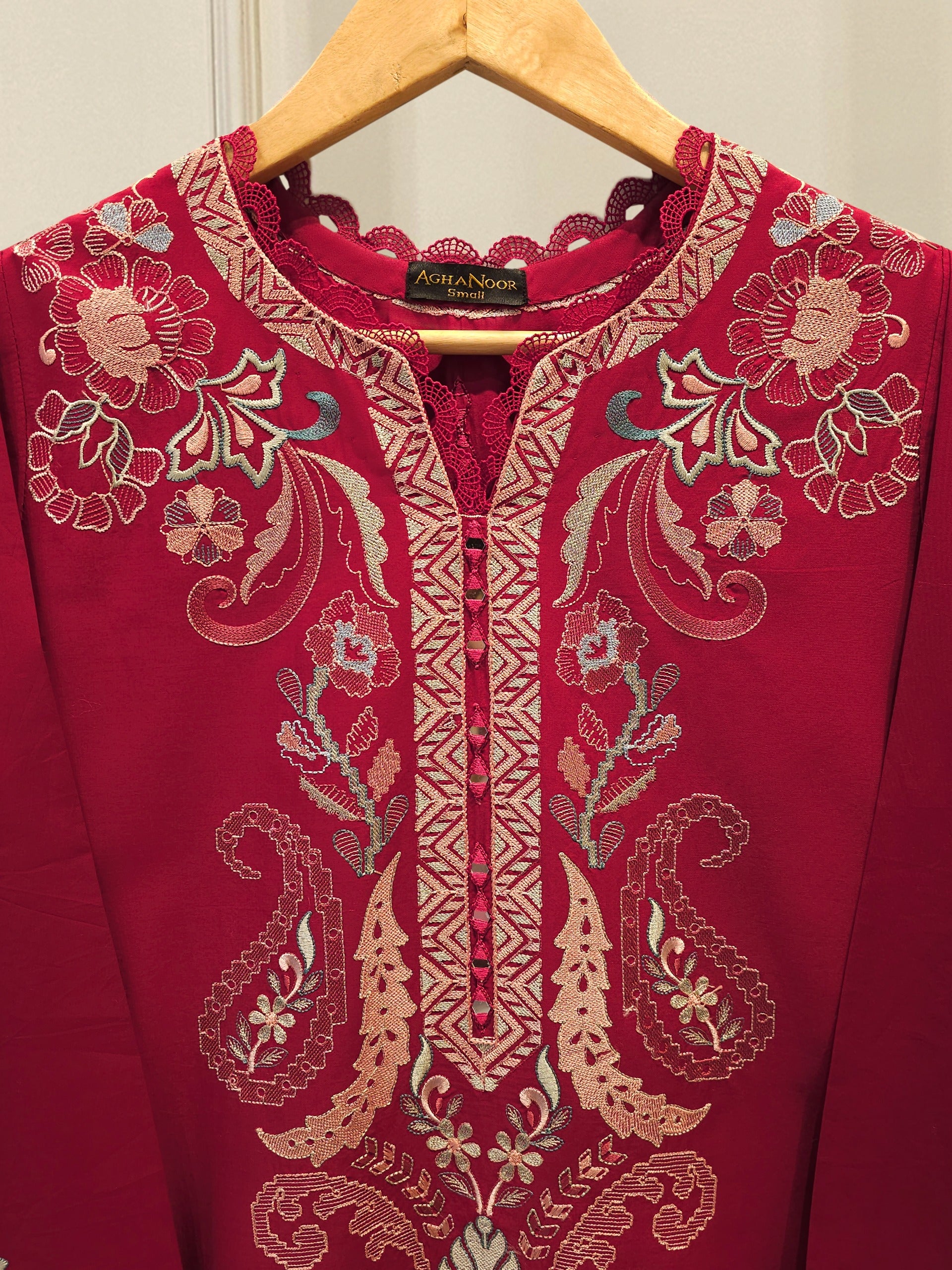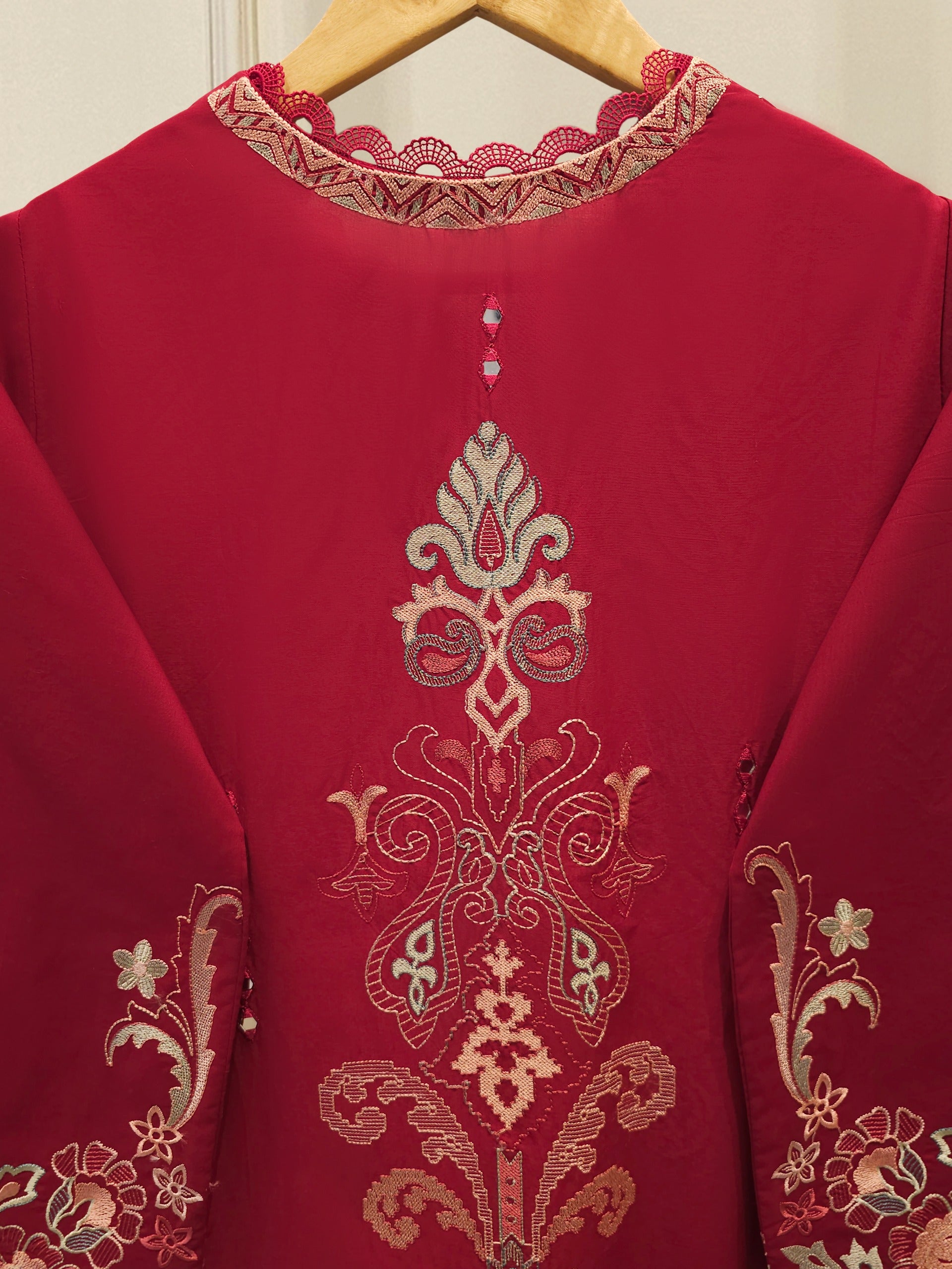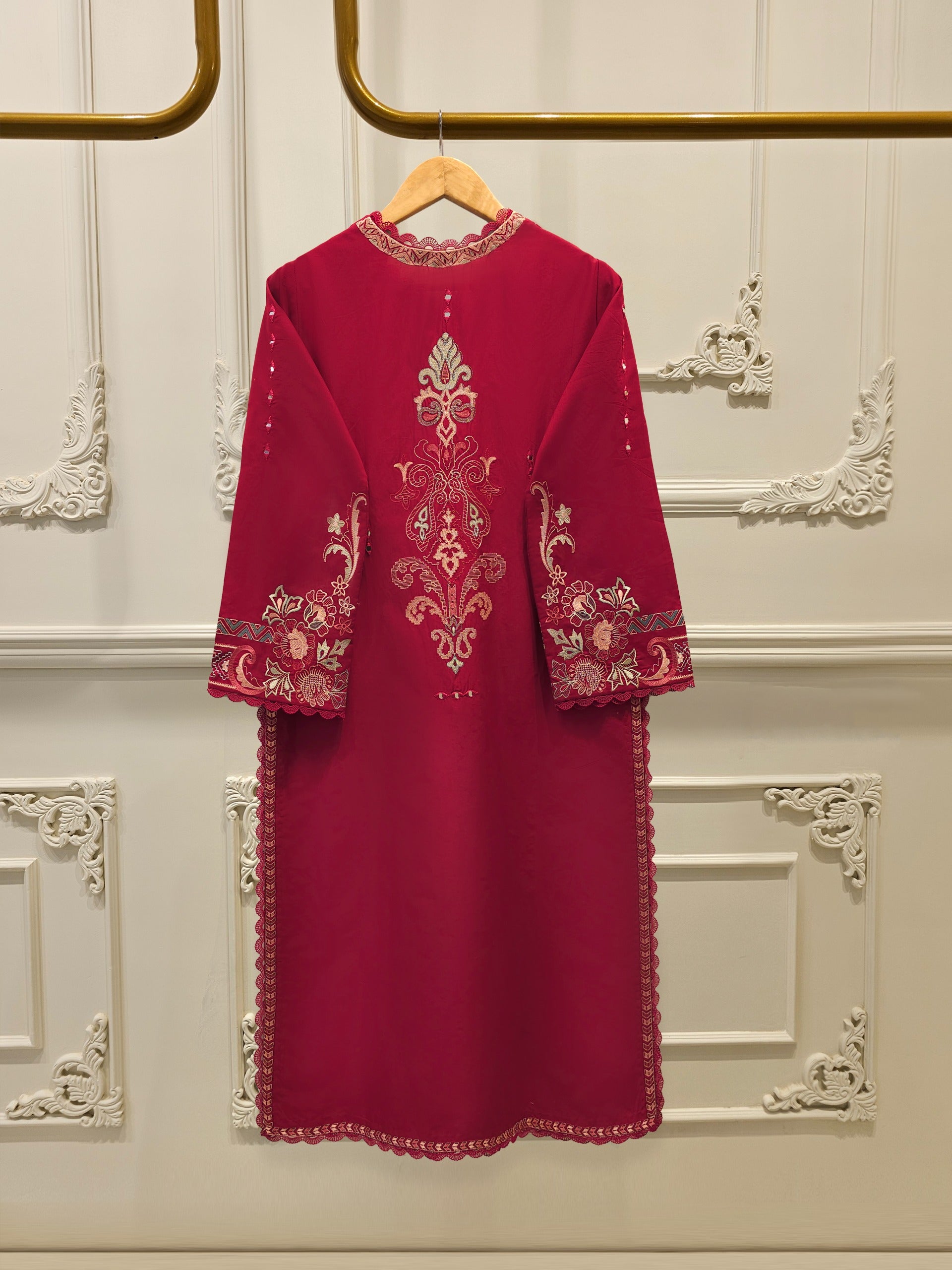 Elevate your summer wardrobe with this beautifully crafted red cambric shirt, featuring intricate Chikan Kari work on the sleeves and daman. Designed for timeless elegance, this piece blends breathable lawn fabric with traditional craftsmanship, perfect for festive occasions or casual sophistication. Pair it with pants for a complete look.