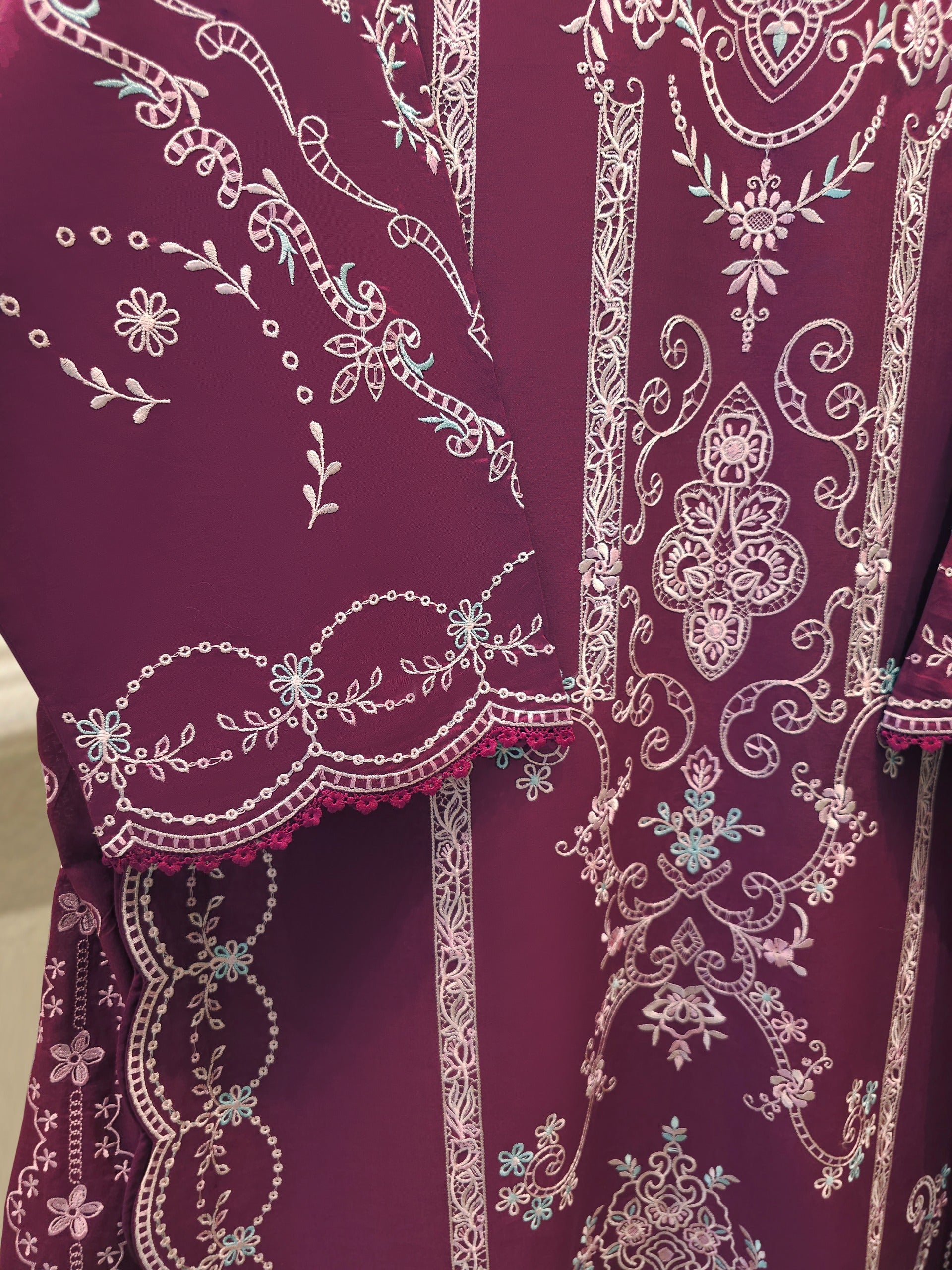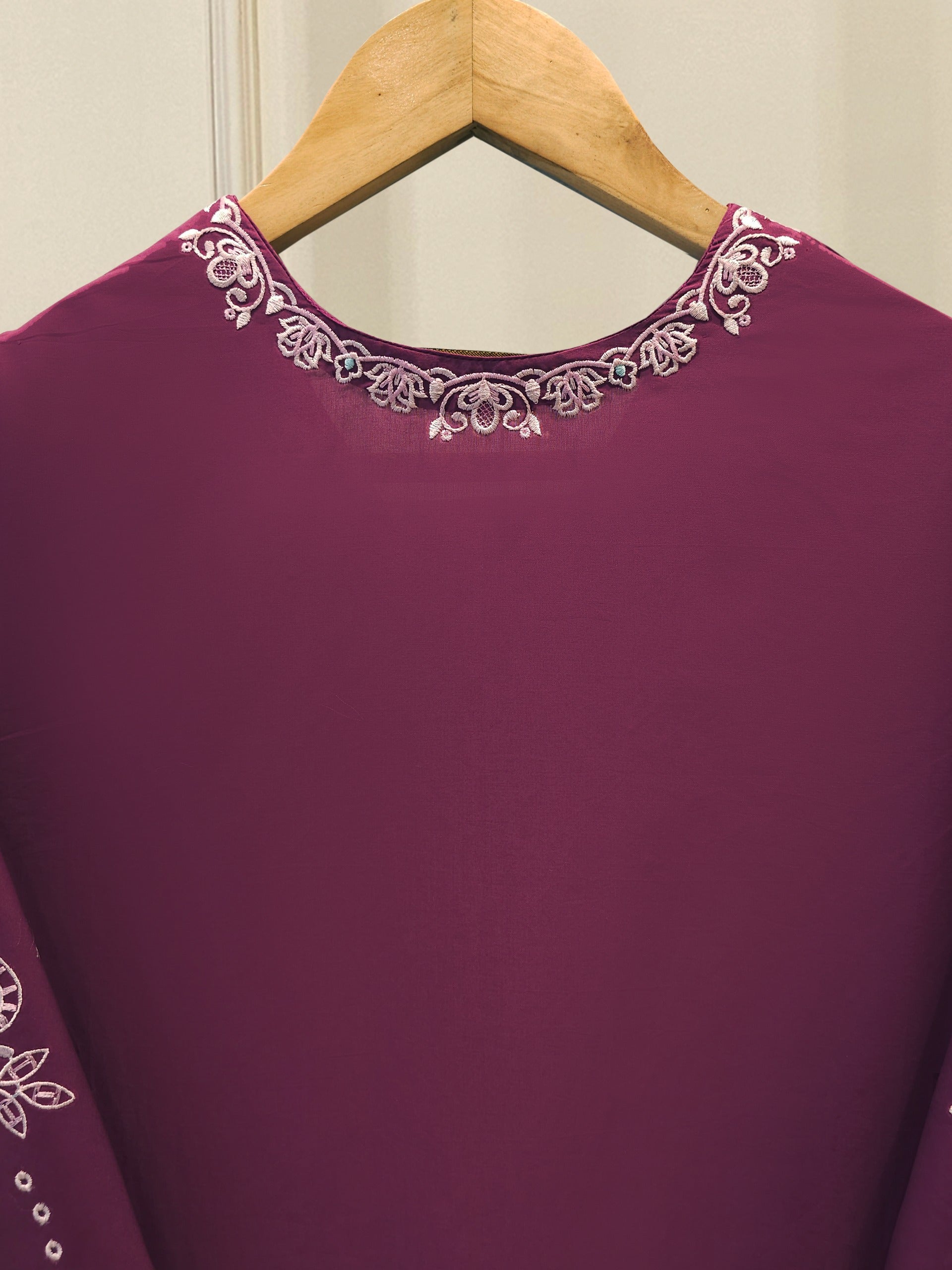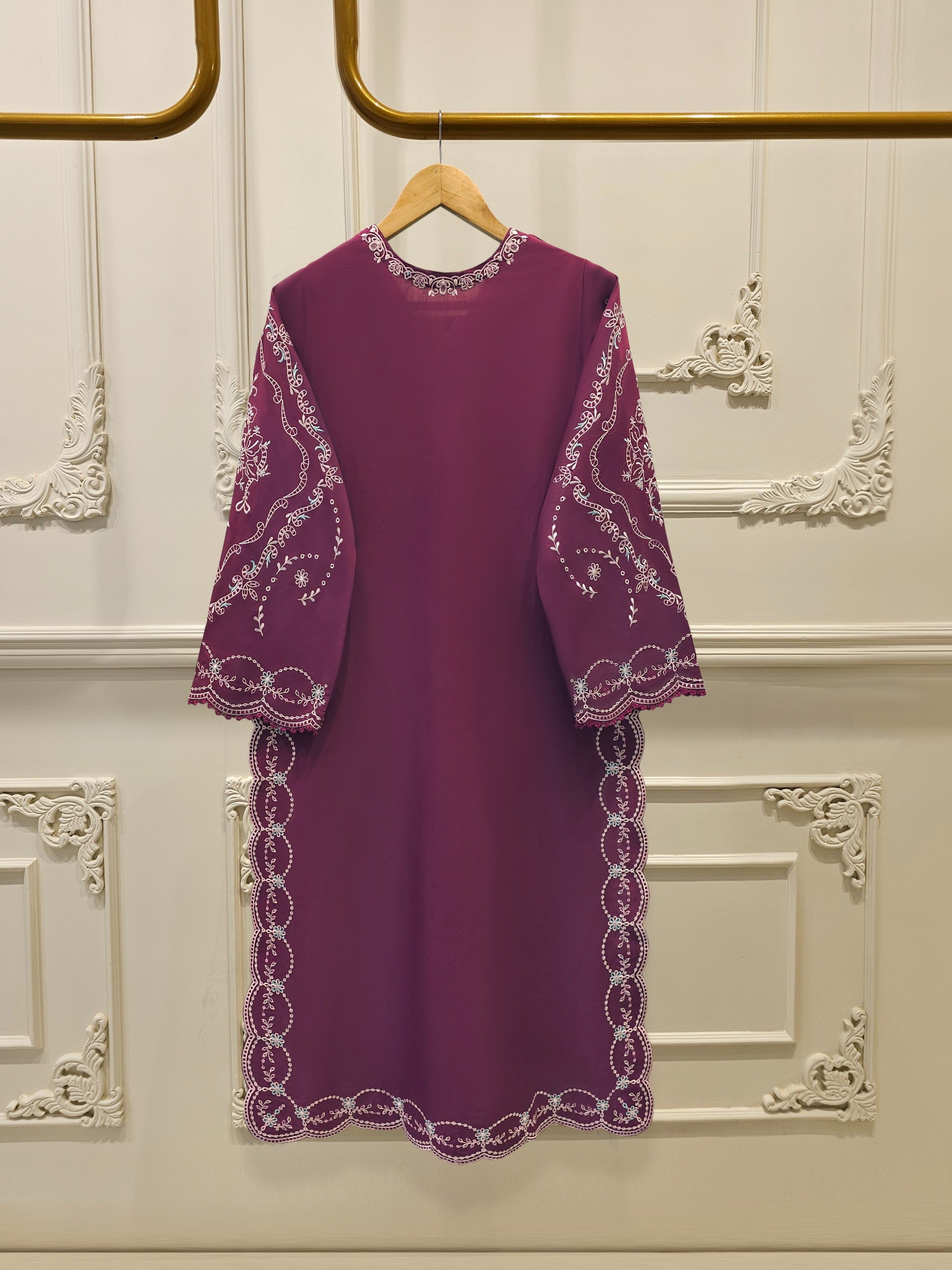 Elevate your summer wardrobe with this beautifully crafted purple lawn shirt, featuring intricate Chikan Kari work on the sleeves and daman. Designed for timeless elegance, this piece blends breathable lawn fabric with traditional craftsmanship, perfect for festive occasions or casual sophistication. Pair it with pants for a complete look.