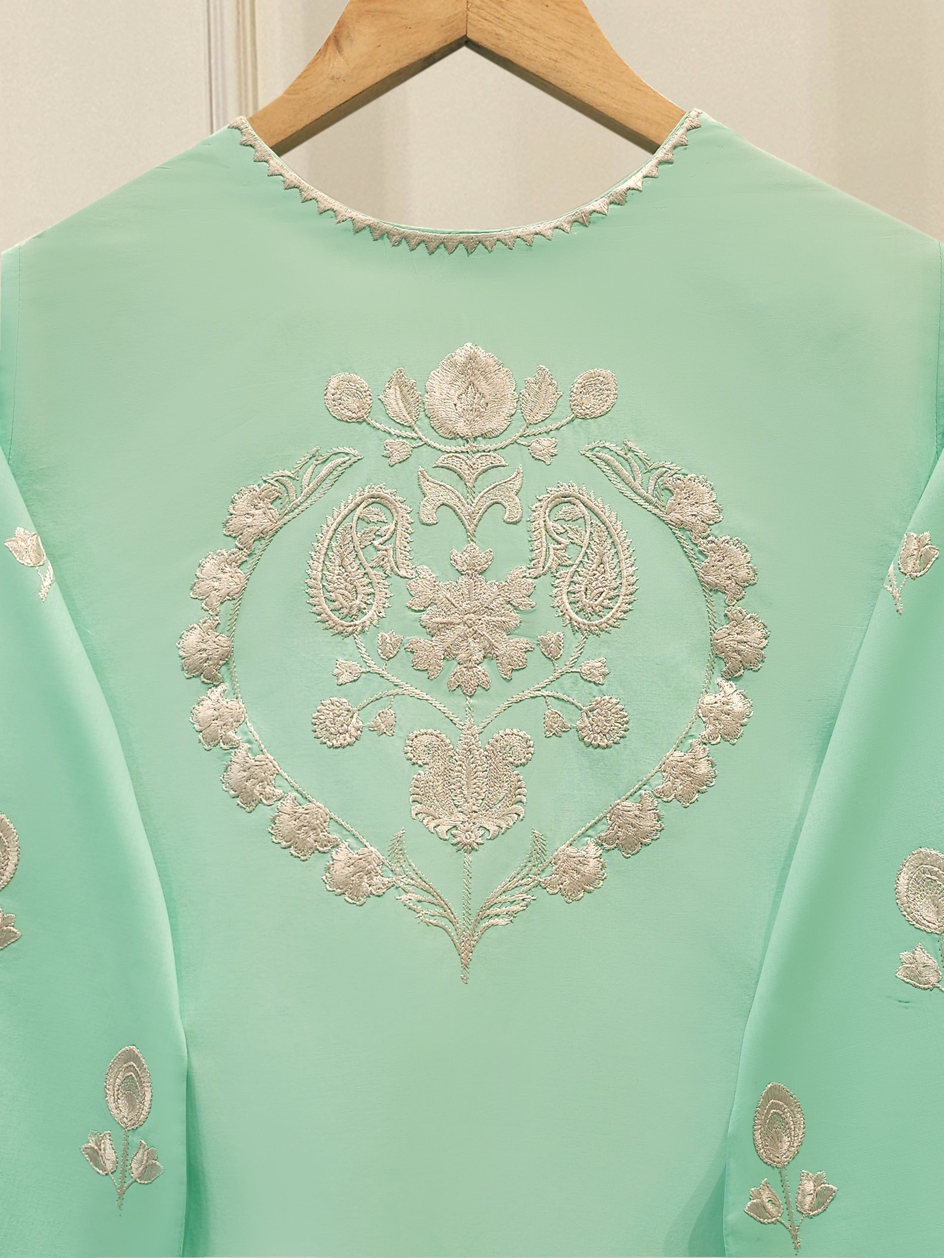 Elevate your summer wardrobe with this beautifully crafted ferozi lawn shirt, featuring intricate Chikan Kari work on the sleeves and daman. Designed for timeless elegance, this piece blends breathable lawn fabric with traditional craftsmanship, perfect for festive occasions or casual sophistication. Pair it with pants for a complete look.
