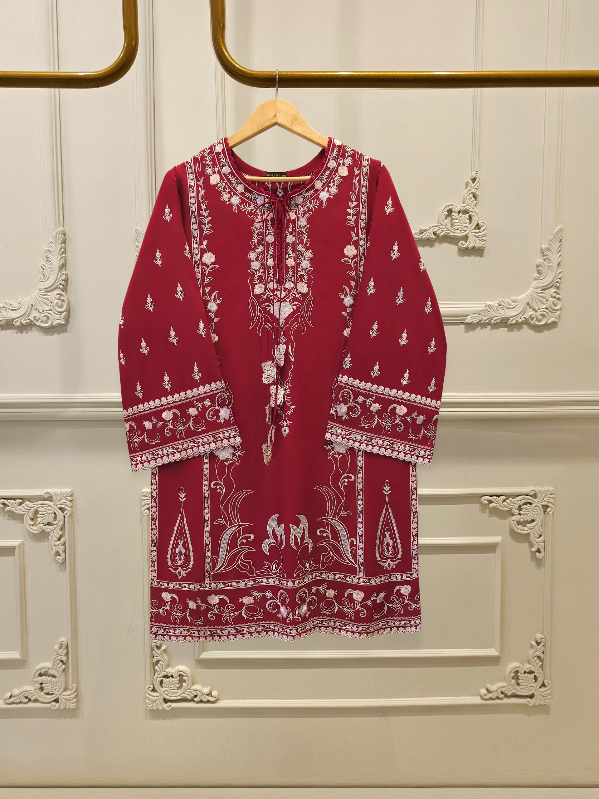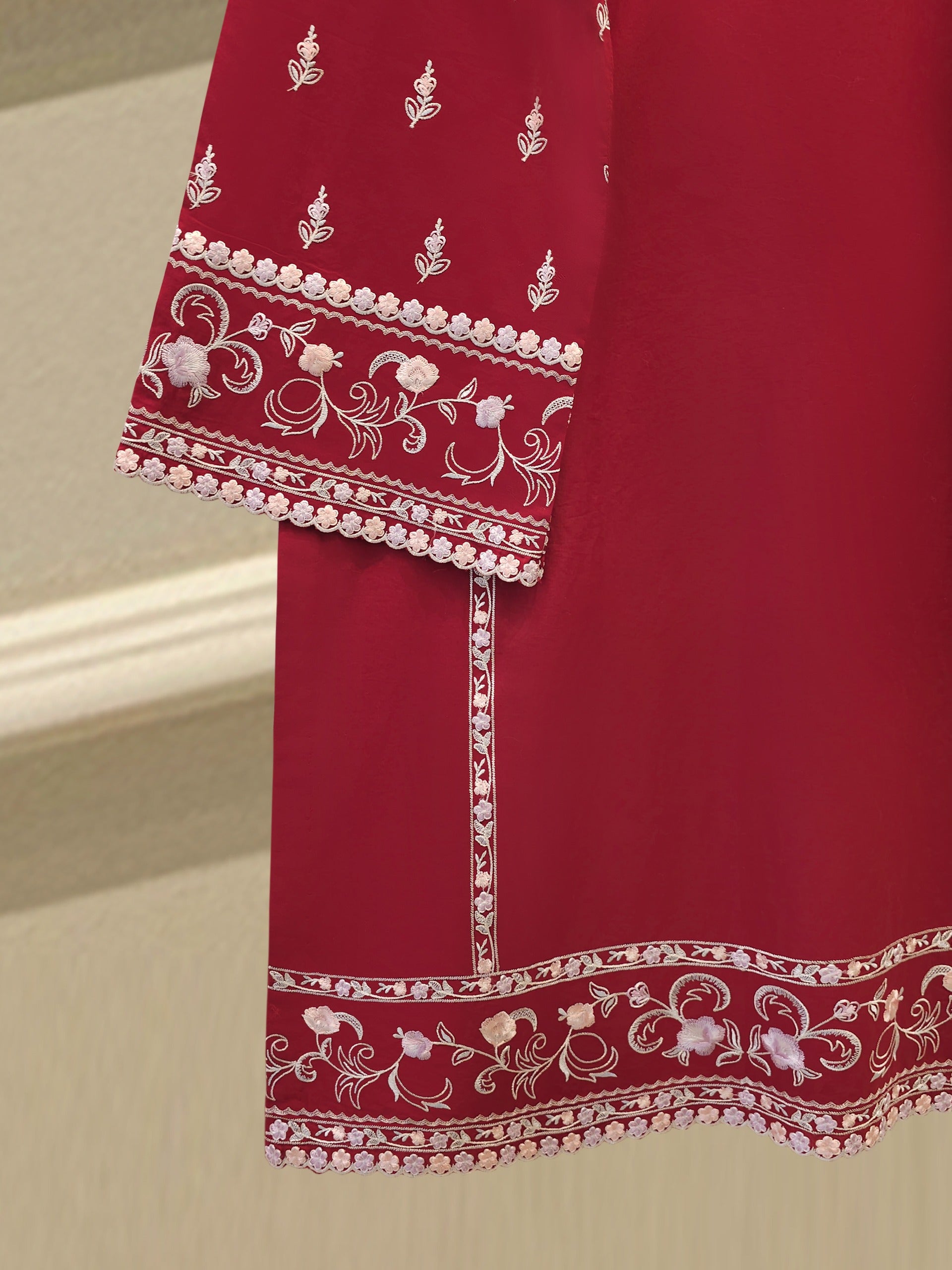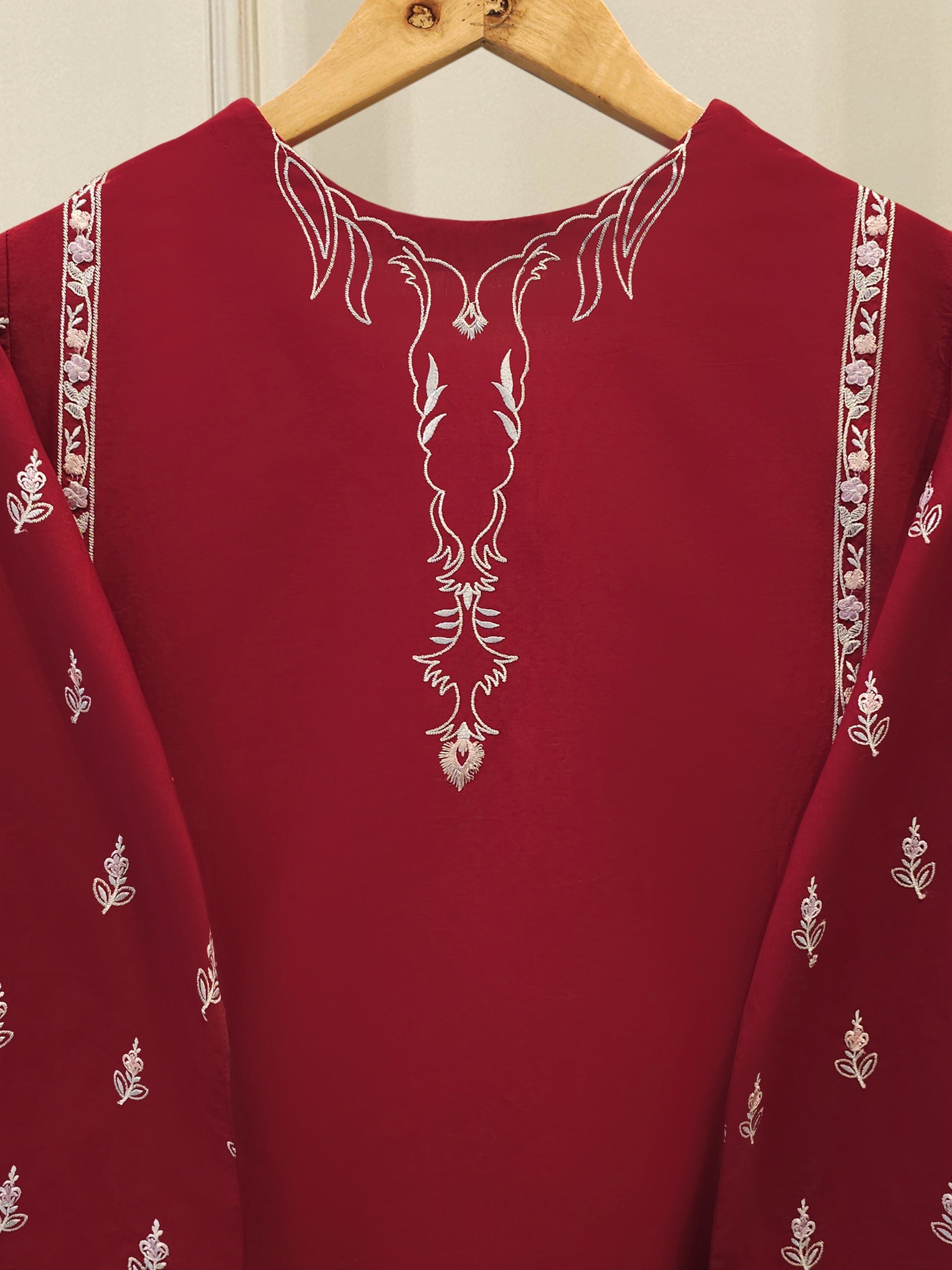 Elevate your summer wardrobe with this beautifully crafted maroon cambric shirt, featuring intricate Chikan Kari work on the sleeves and daman. Designed for timeless elegance, this piece blends breathable lawn fabric with traditional craftsmanship, perfect for festive occasions or casual sophistication. Pair it with pants for a complete look.