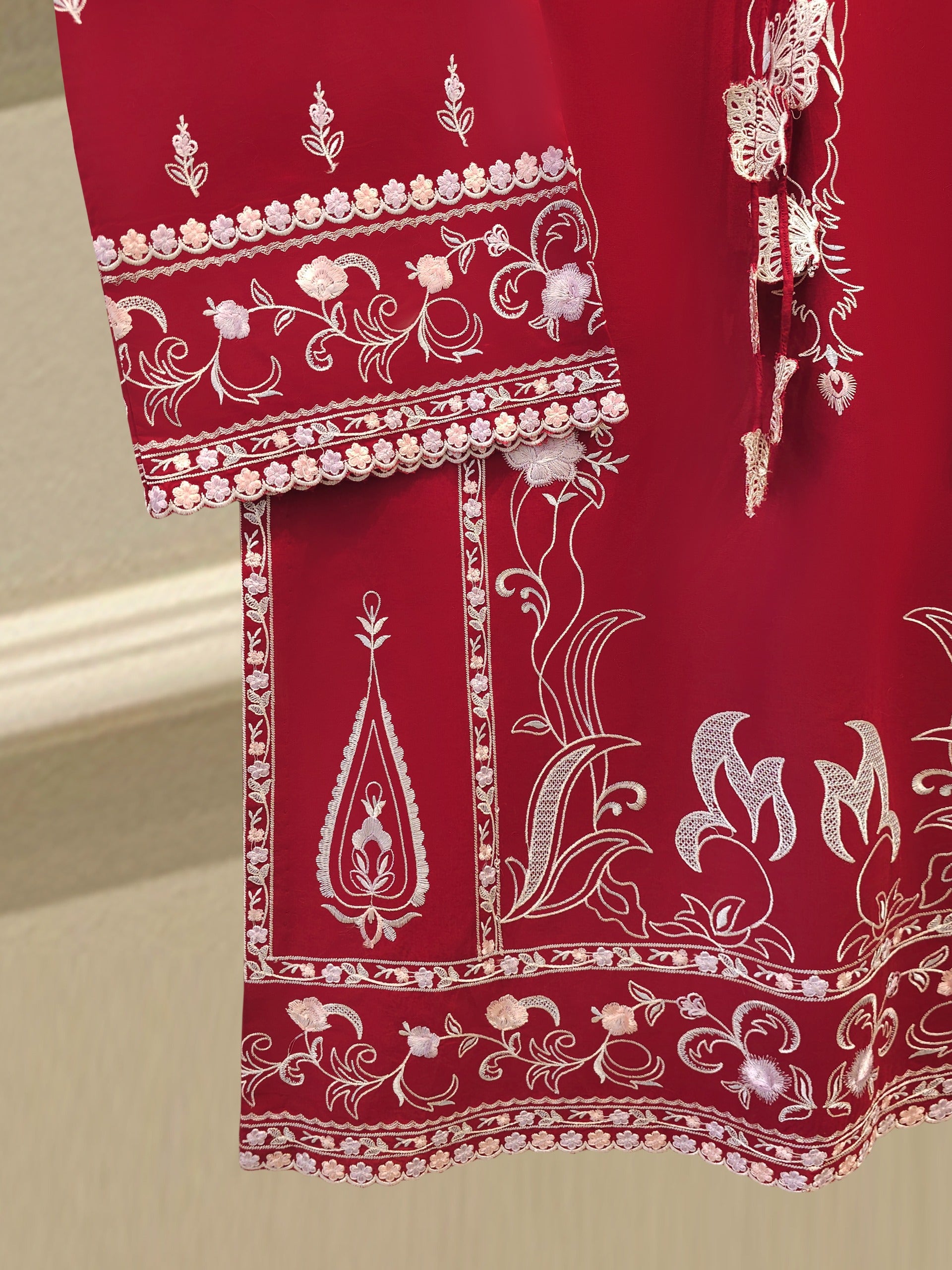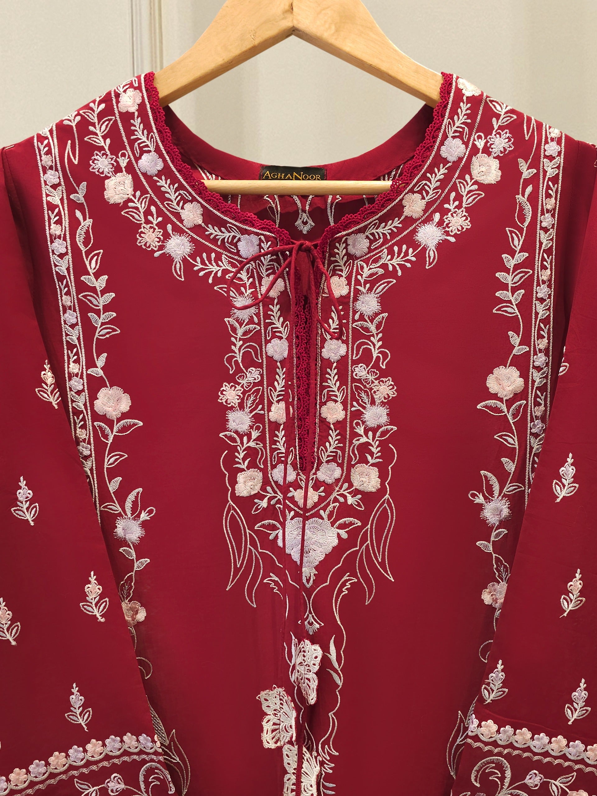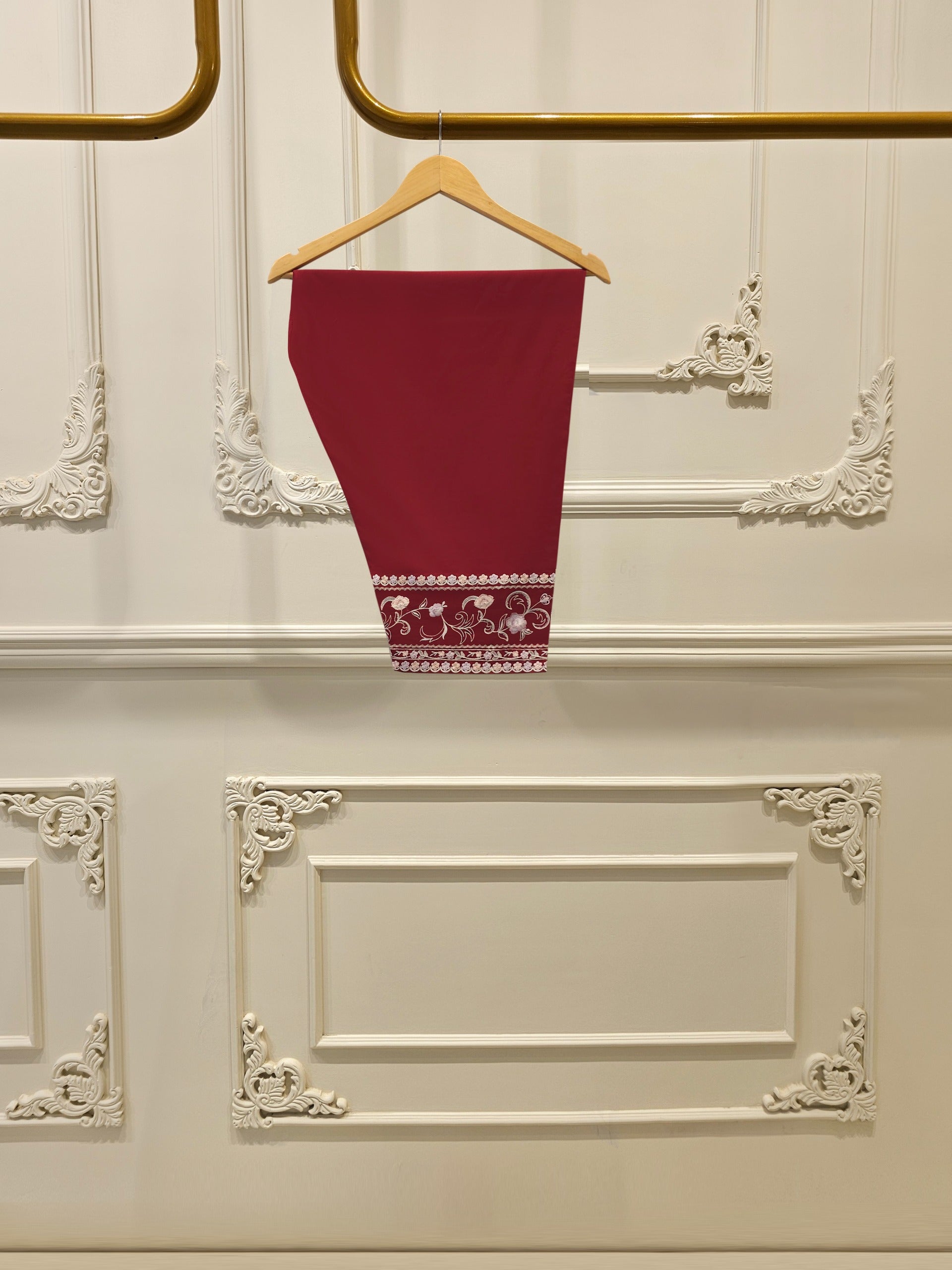 Elevate your summer wardrobe with this beautifully crafted maroon cambric shirt, featuring intricate Chikan Kari work on the sleeves and daman. Designed for timeless elegance, this piece blends breathable lawn fabric with traditional craftsmanship, perfect for festive occasions or casual sophistication. Pair it with pants for a complete look.