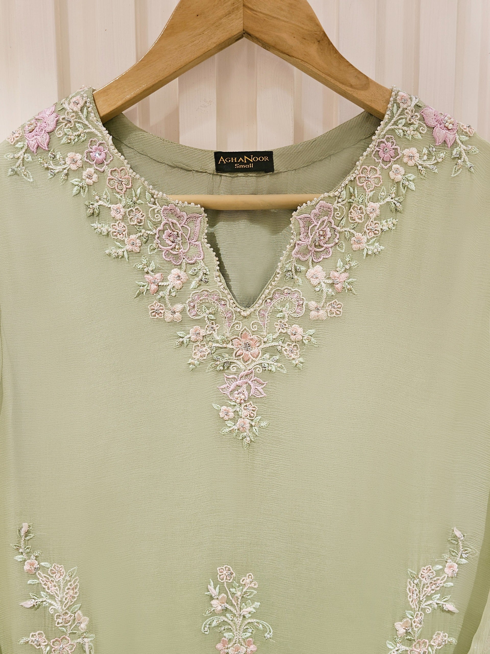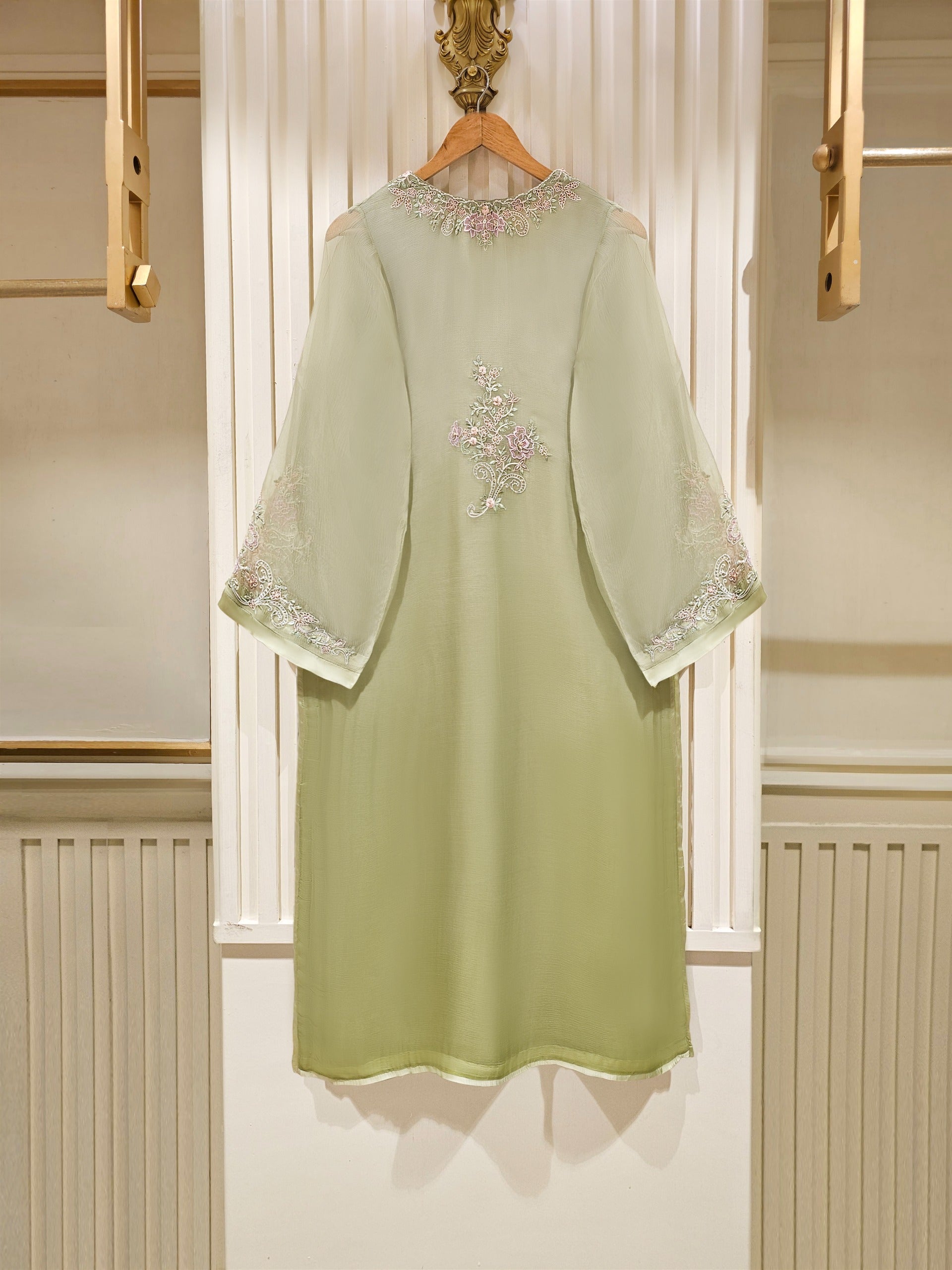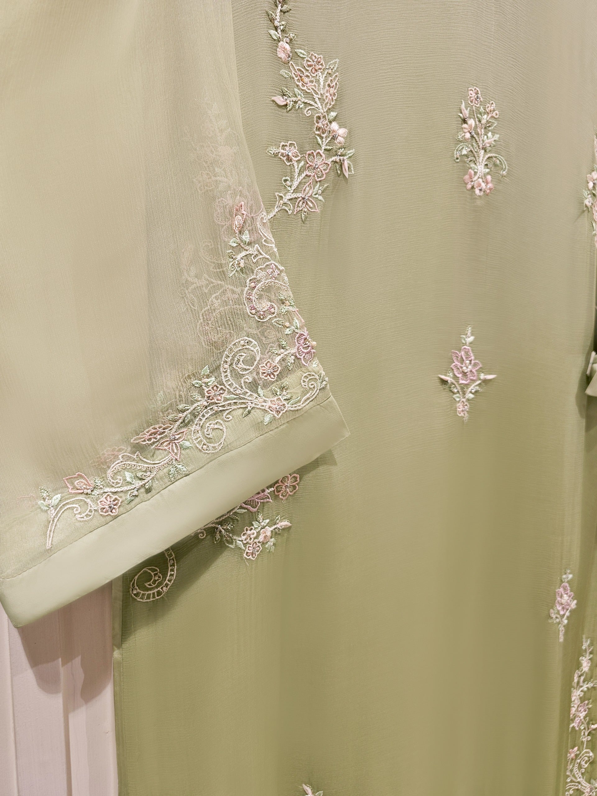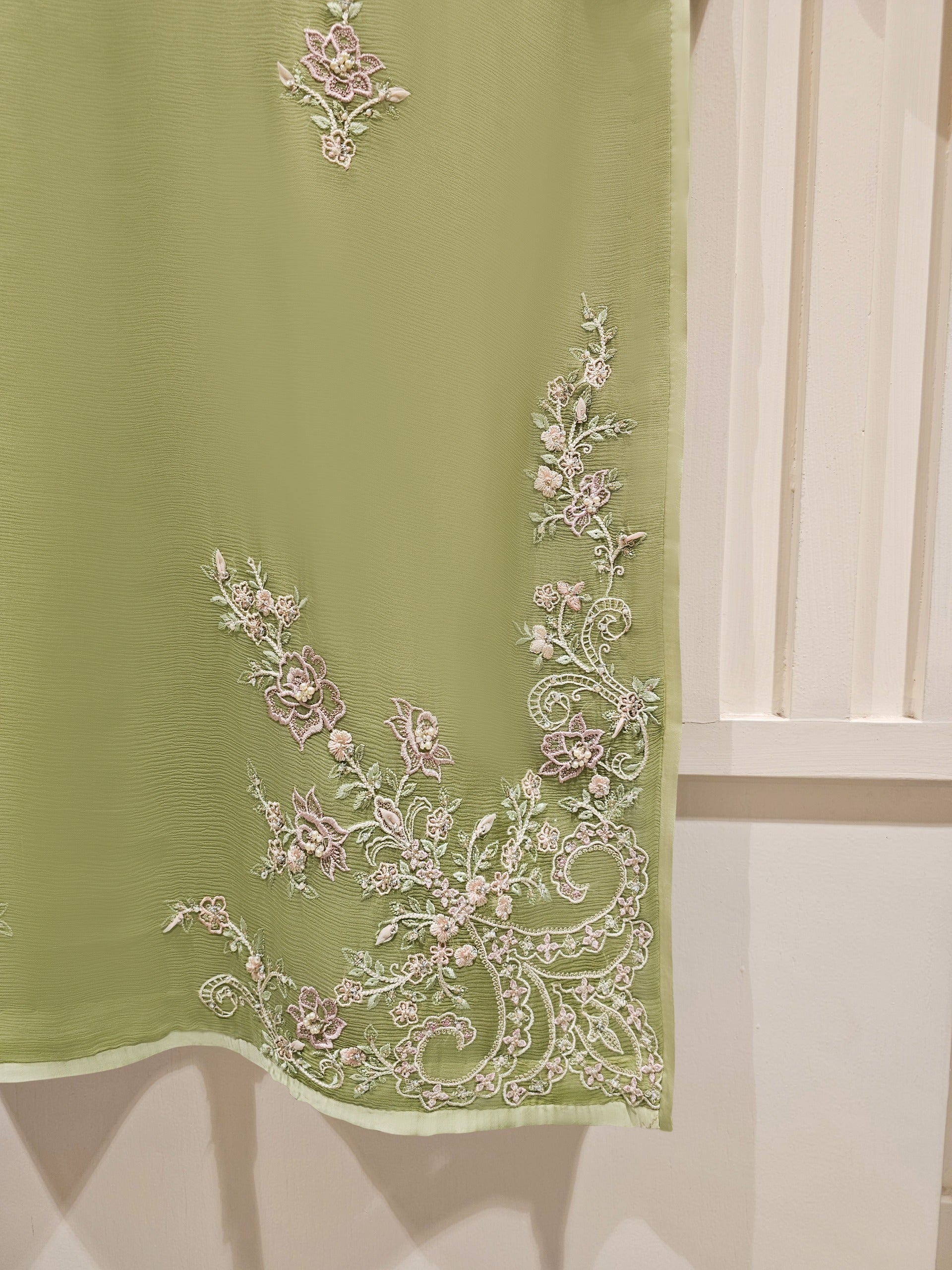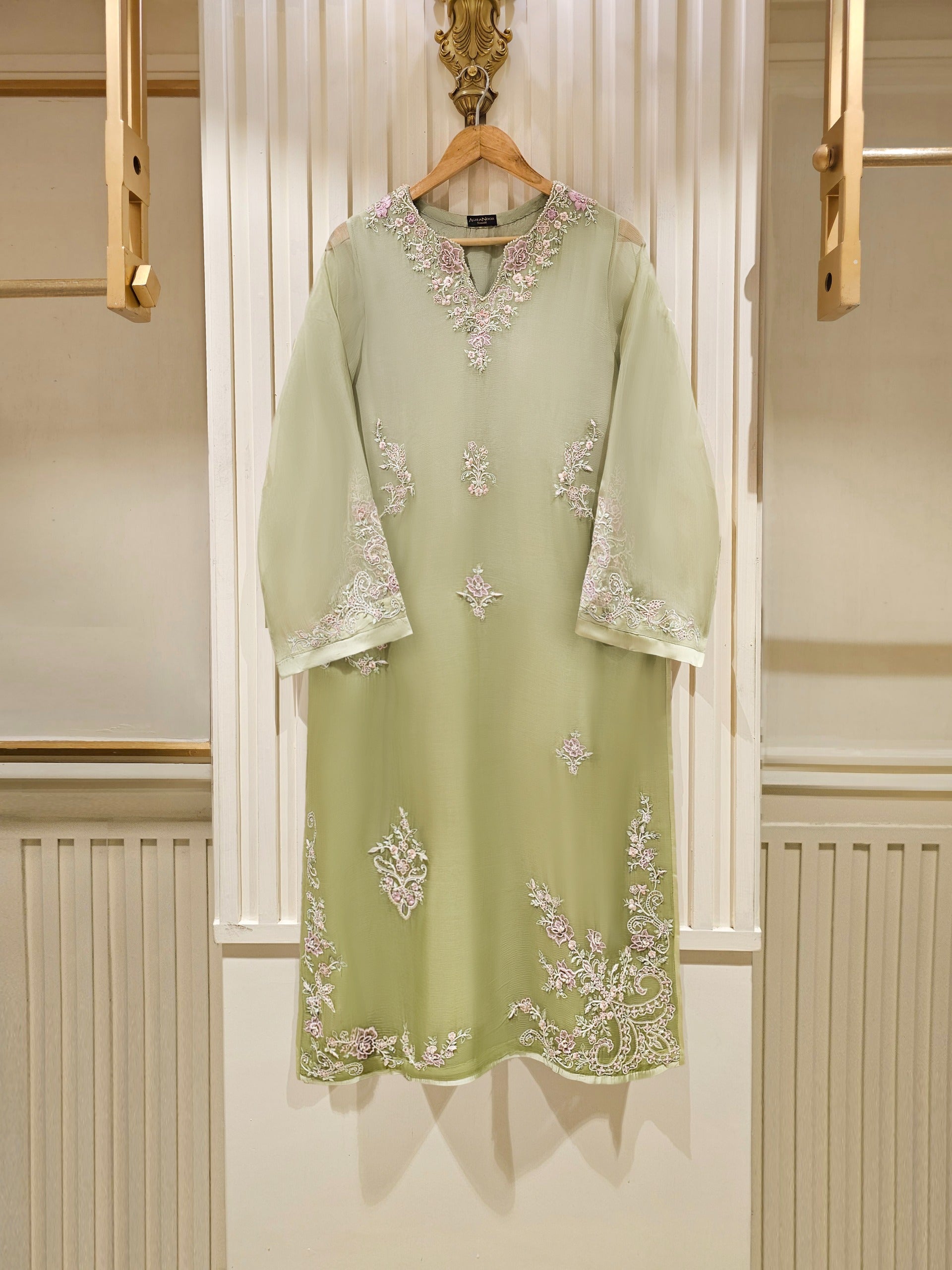 Elevate your style with our pista green embroidered chiffon straight shirt crafted with utmost care and attention to detail. The shirt features intricate embroidery on the front and sleeves, adding a touch of timeless charm.