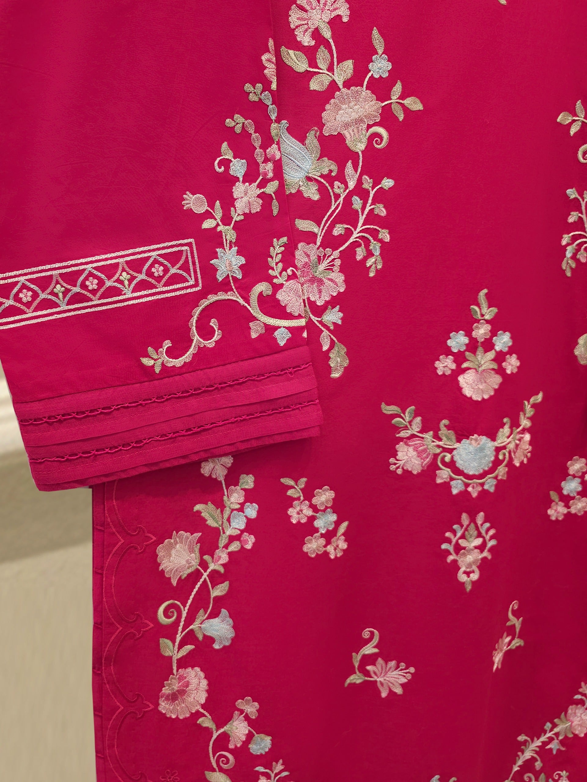 Elevate your summer wardrobe with this beautifully crafted red cambric shirt, featuring intricate Chikan Kari work on the sleeves and daman. Designed for timeless elegance, this piece blends breathable lawn fabric with traditional craftsmanship, perfect for festive occasions or casual sophistication. Pair it with pants for a complete look.