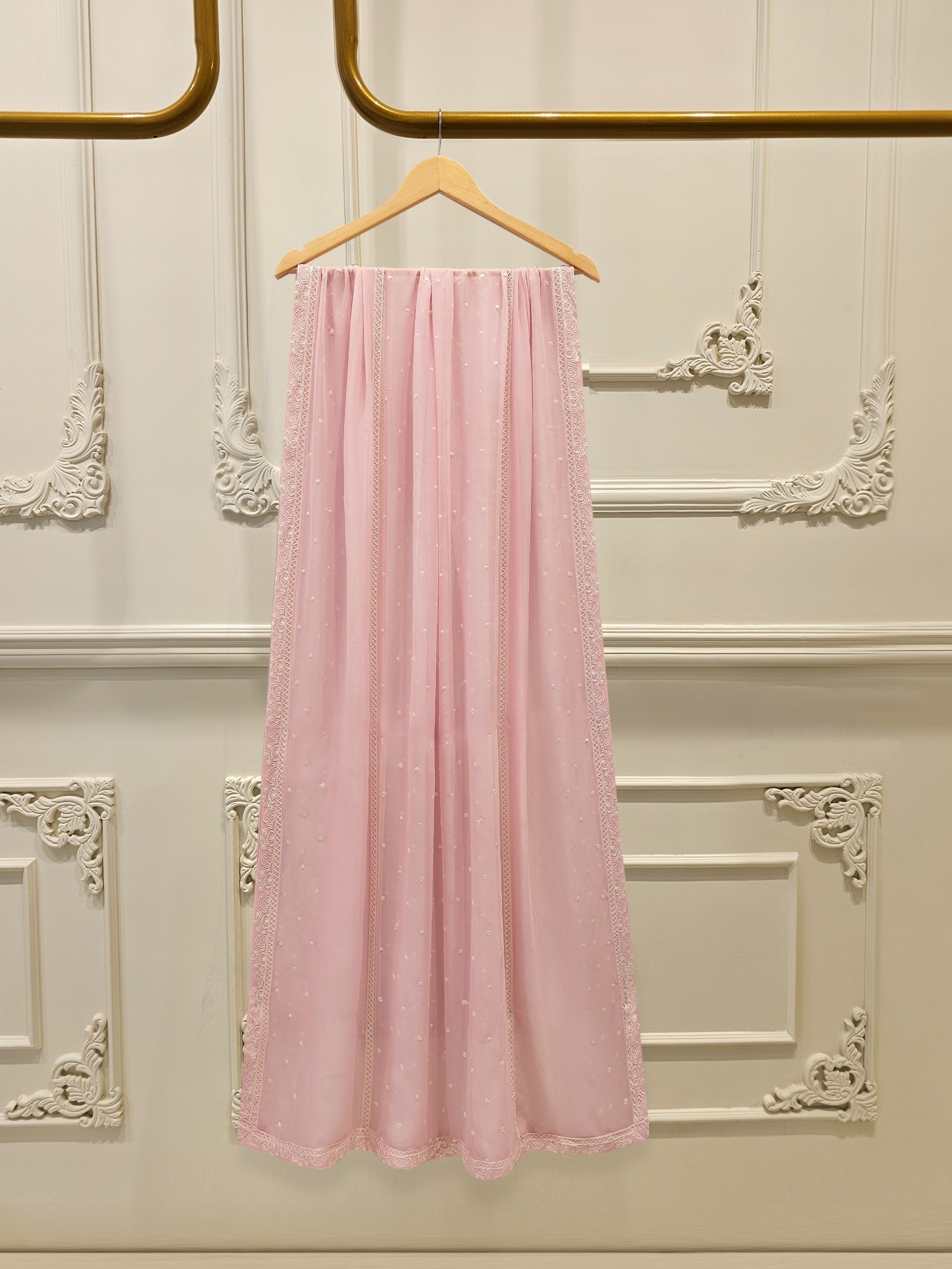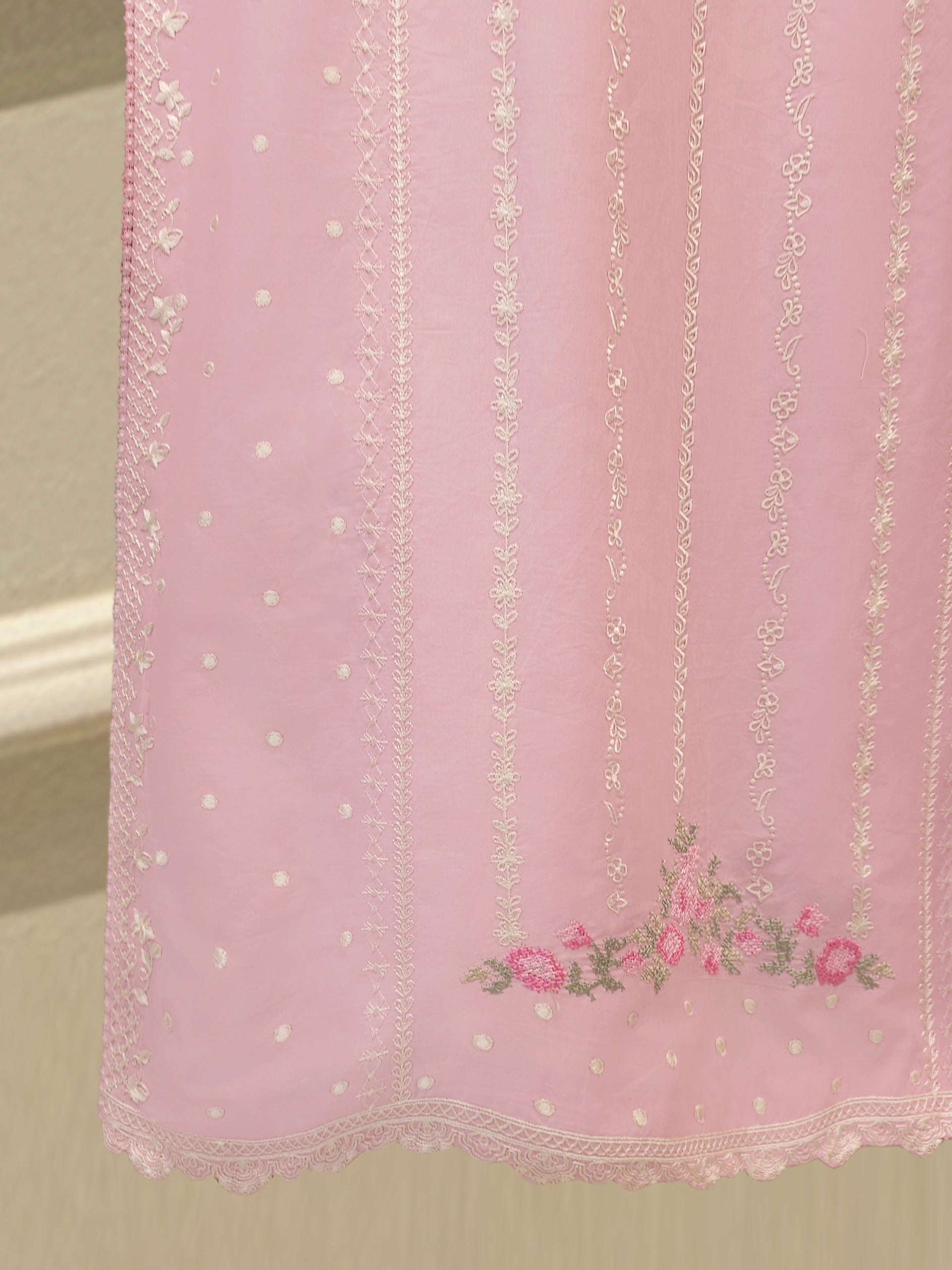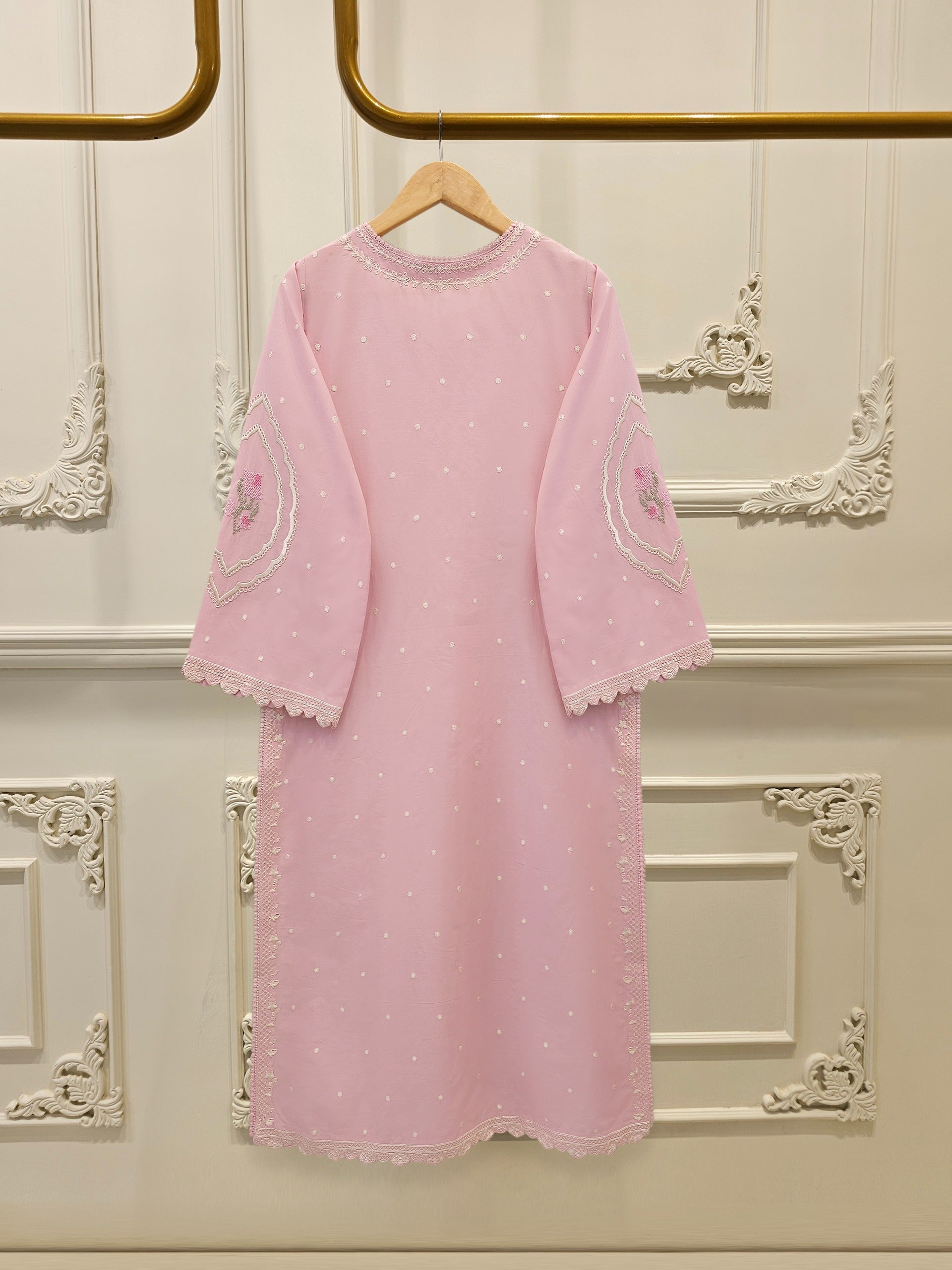 Elevate your summer wardrobe with this beautifully crafted pink cambric shirt, featuring intricate Chikan Kari work on the sleeves and daman. Designed for timeless elegance, this piece blends breathable lawn fabric with traditional craftsmanship, perfect for festive occasions or casual sophistication. Pair it with pants for a complete look.
