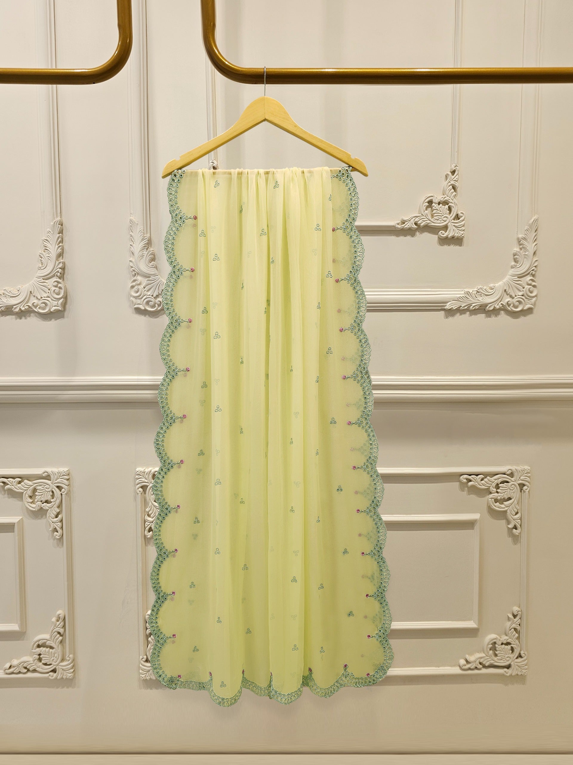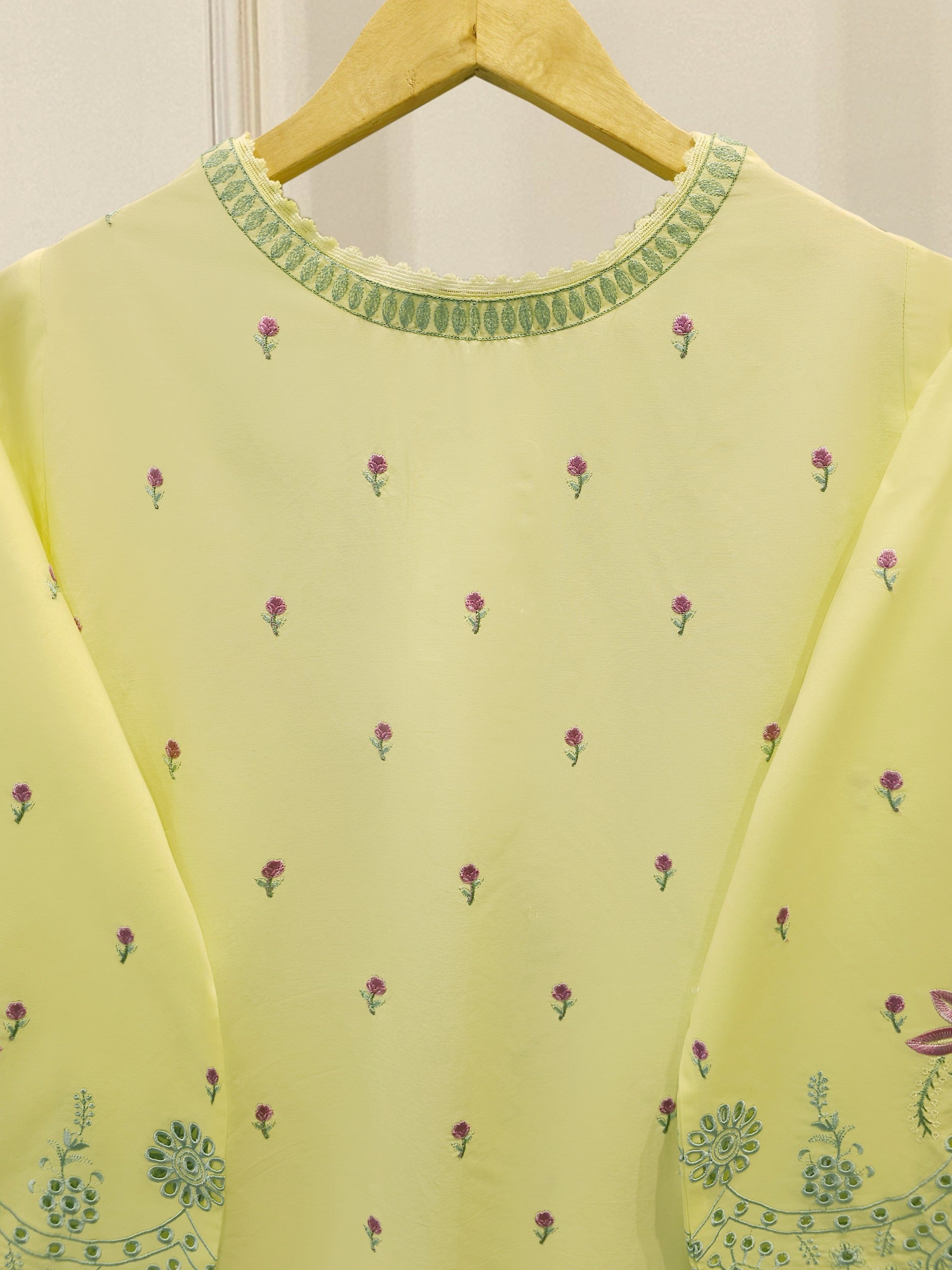 Elevate your summer wardrobe with this beautifully crafted yellow cambric shirt, featuring intricate Chikan Kari work on the sleeves and daman. Designed for timeless elegance, this piece blends breathable lawn fabric with traditional craftsmanship, perfect for festive occasions or casual sophistication. Pair it with pants for a complete look.