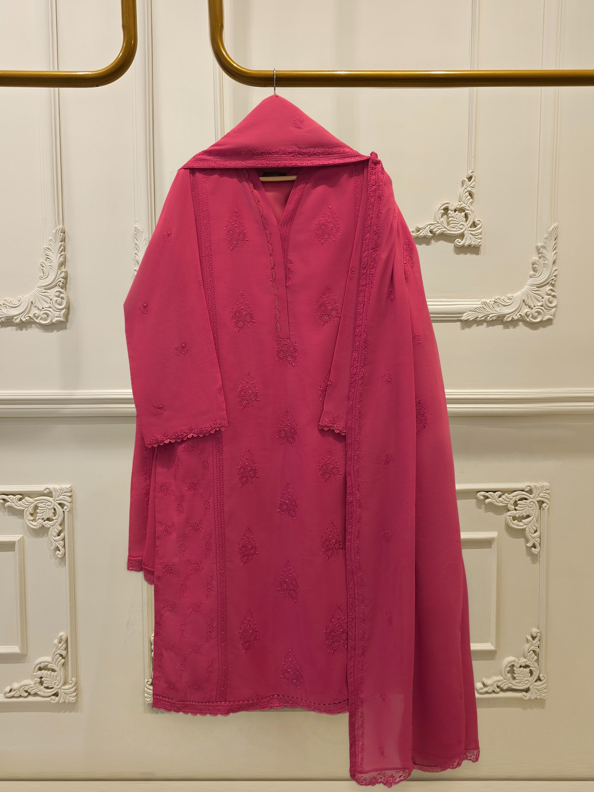 A Swiss voile suit is an elegant and lightweight outfit made from fine, breathable Swiss voile fabric. It typically includes a shirt, trousers, and a matching dupatta, offering a soft texture and airy feel that’s perfect for warm weather.