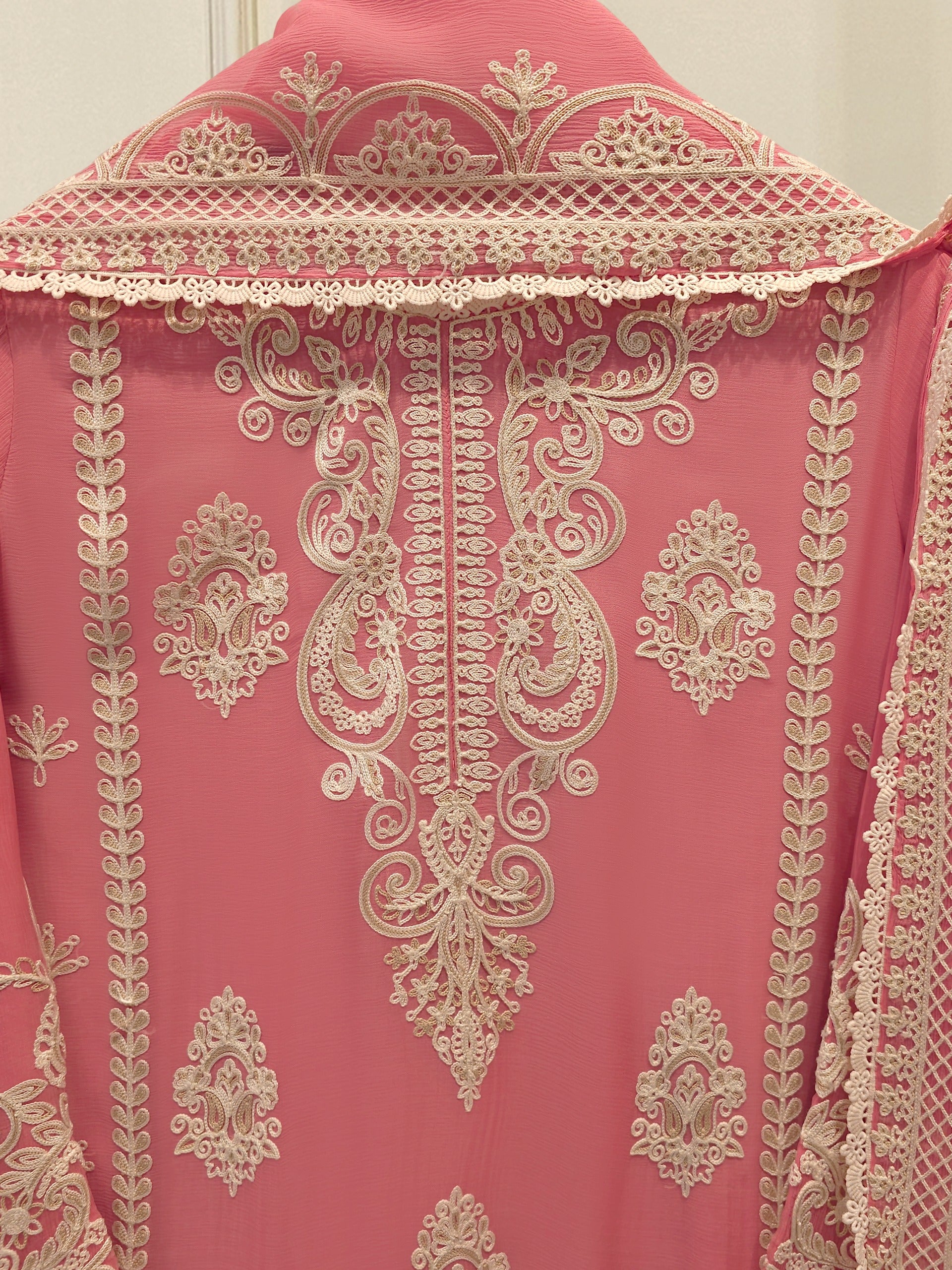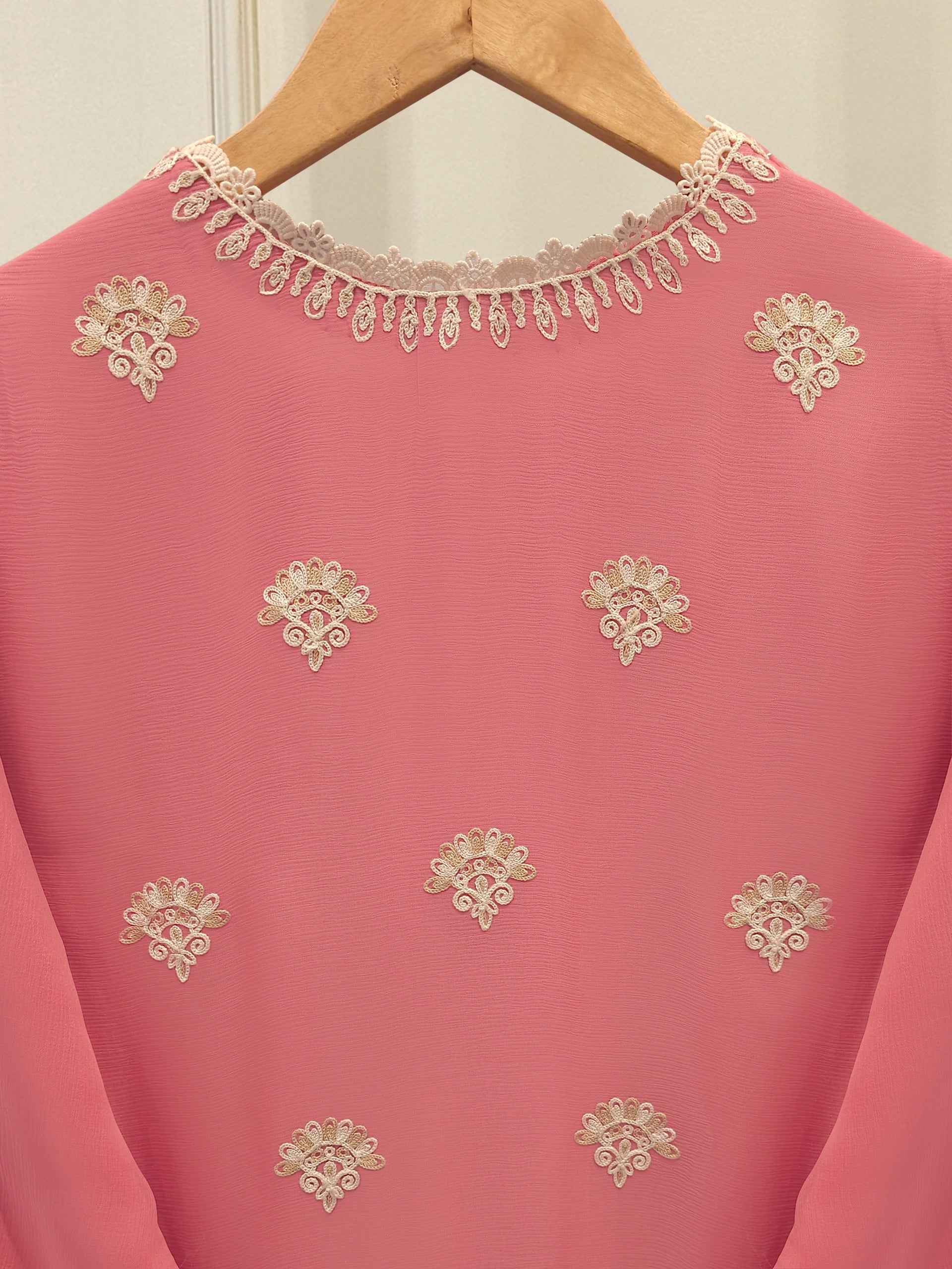 Elevate your style with our beige embroidered chiffon straight shirt crafted with utmost care and attention to detail. The shirt features intricate embroidery on the front and sleeves, adding a touch of timeless charm.