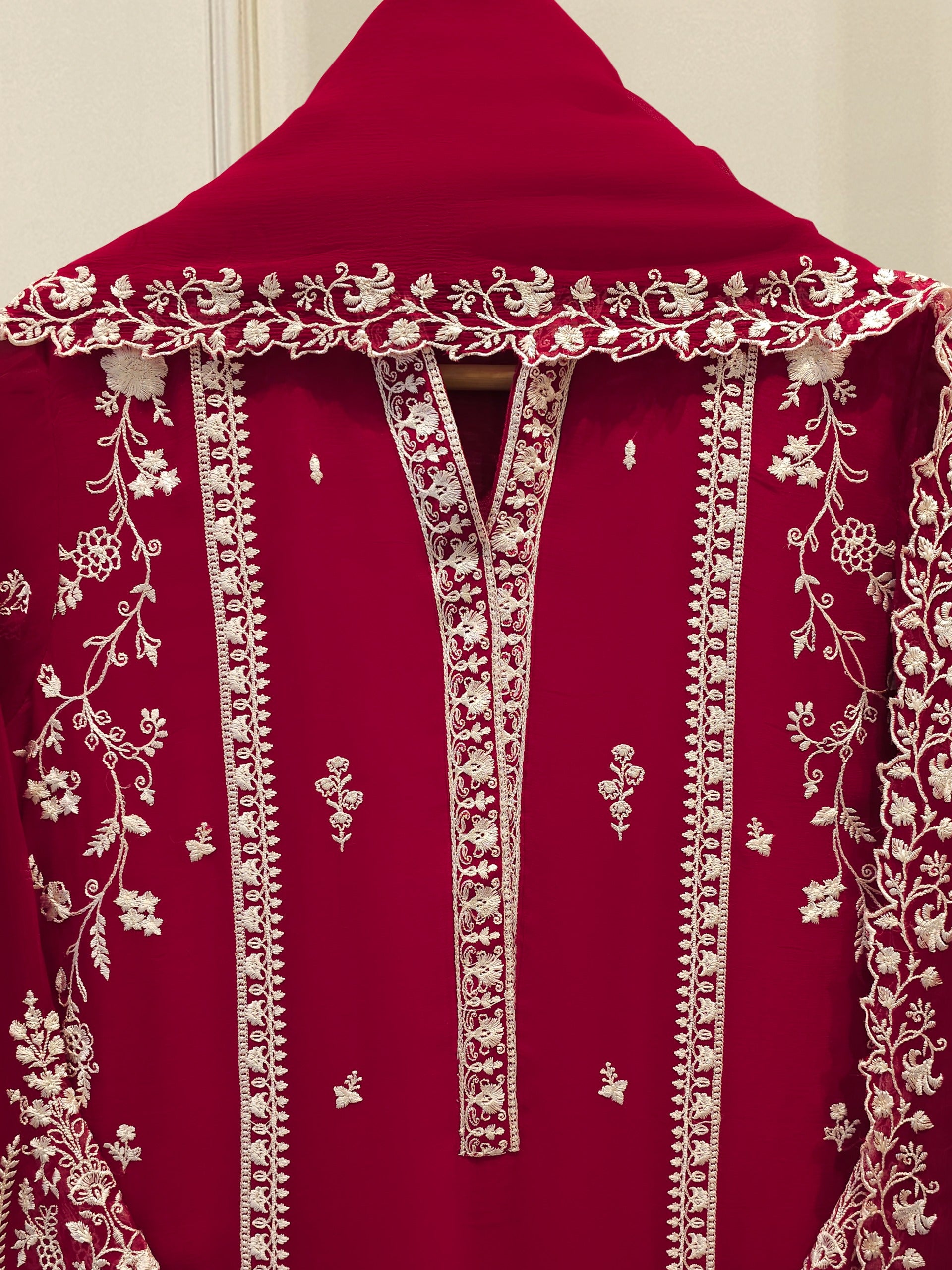 Elevate your style with our maroon embroidered chiffon straight shirt crafted with utmost care and attention to detail. The shirt features intricate embroidery on the front and sleeves, adding a touch of timeless charm.