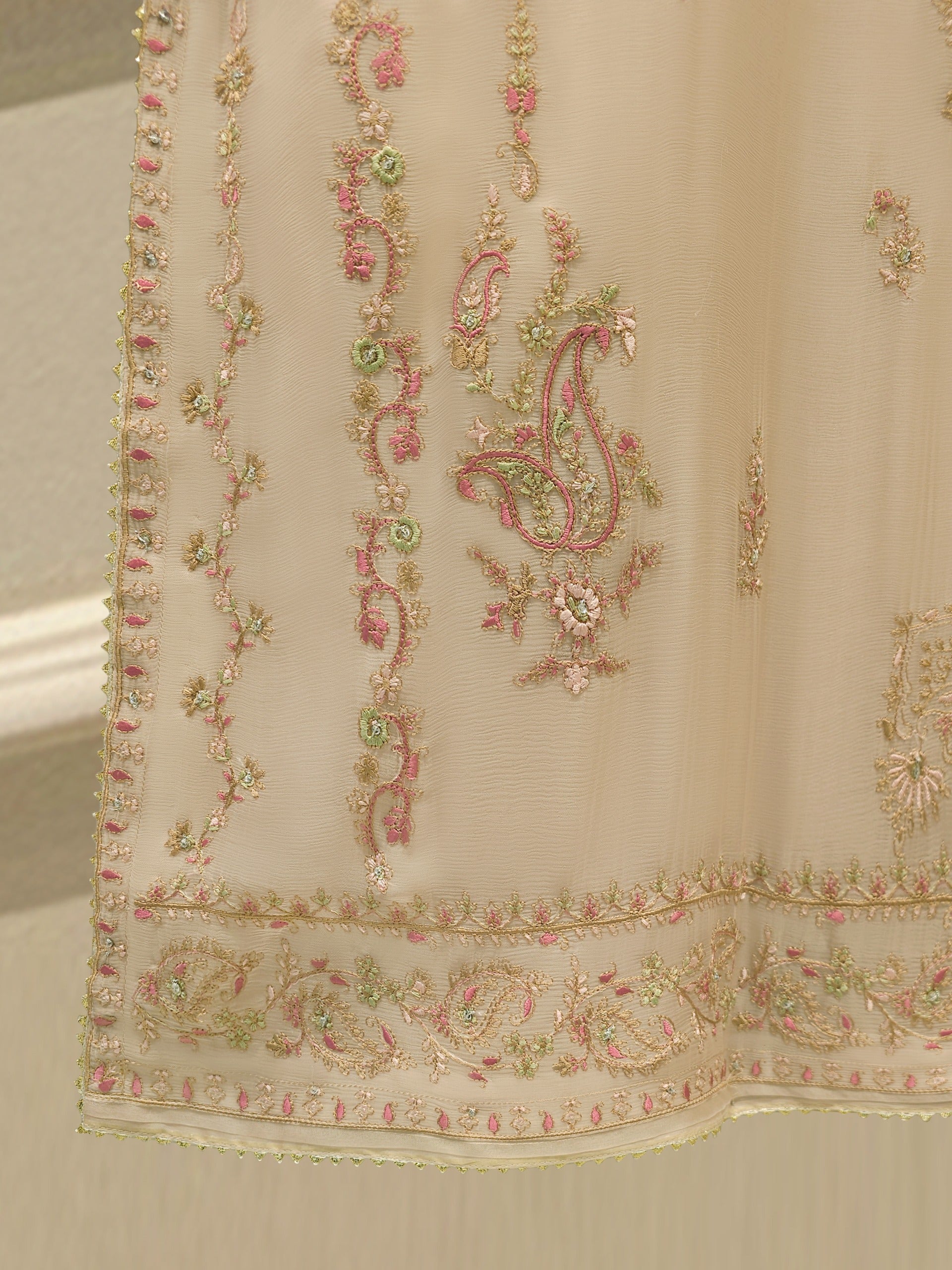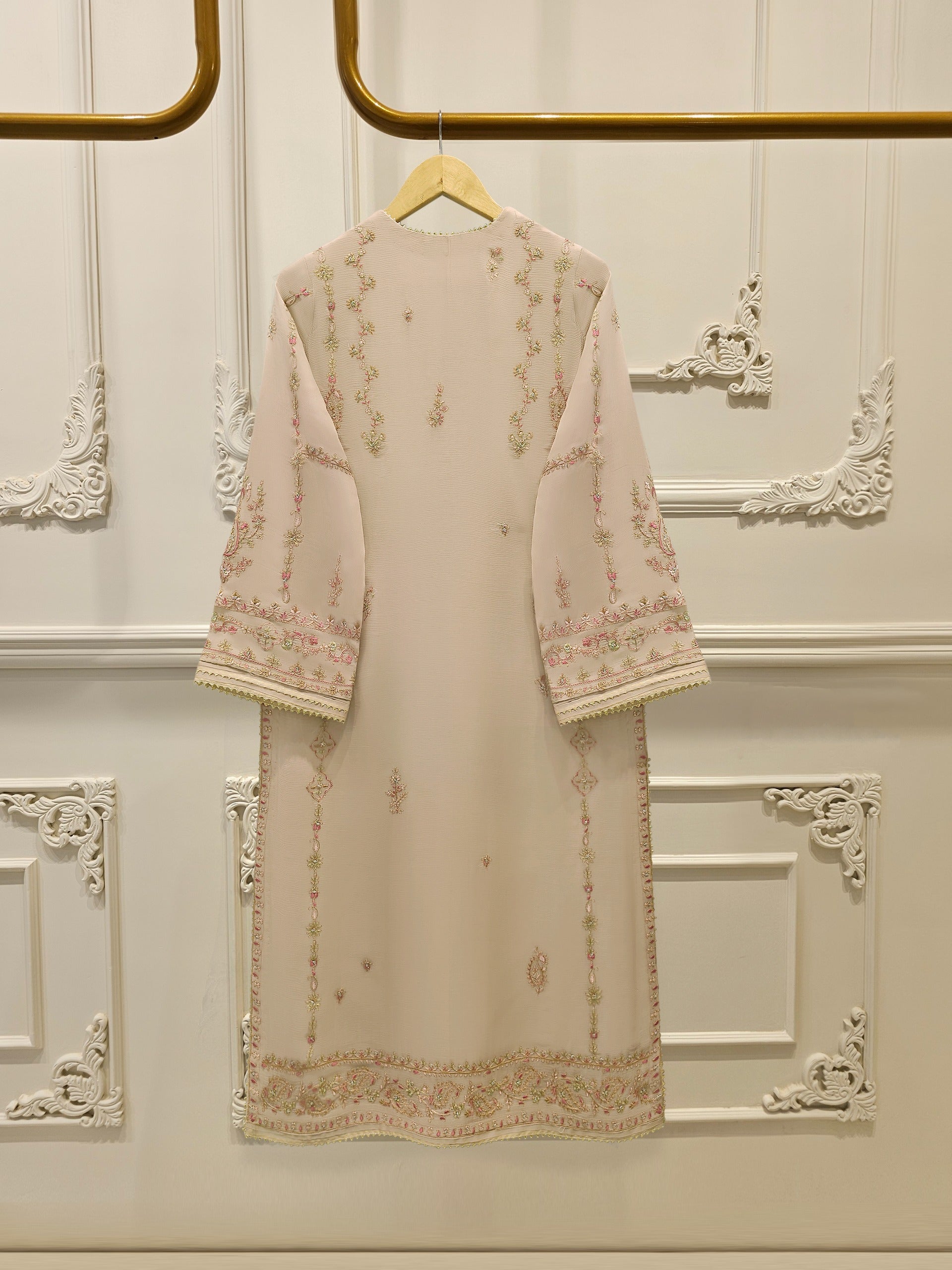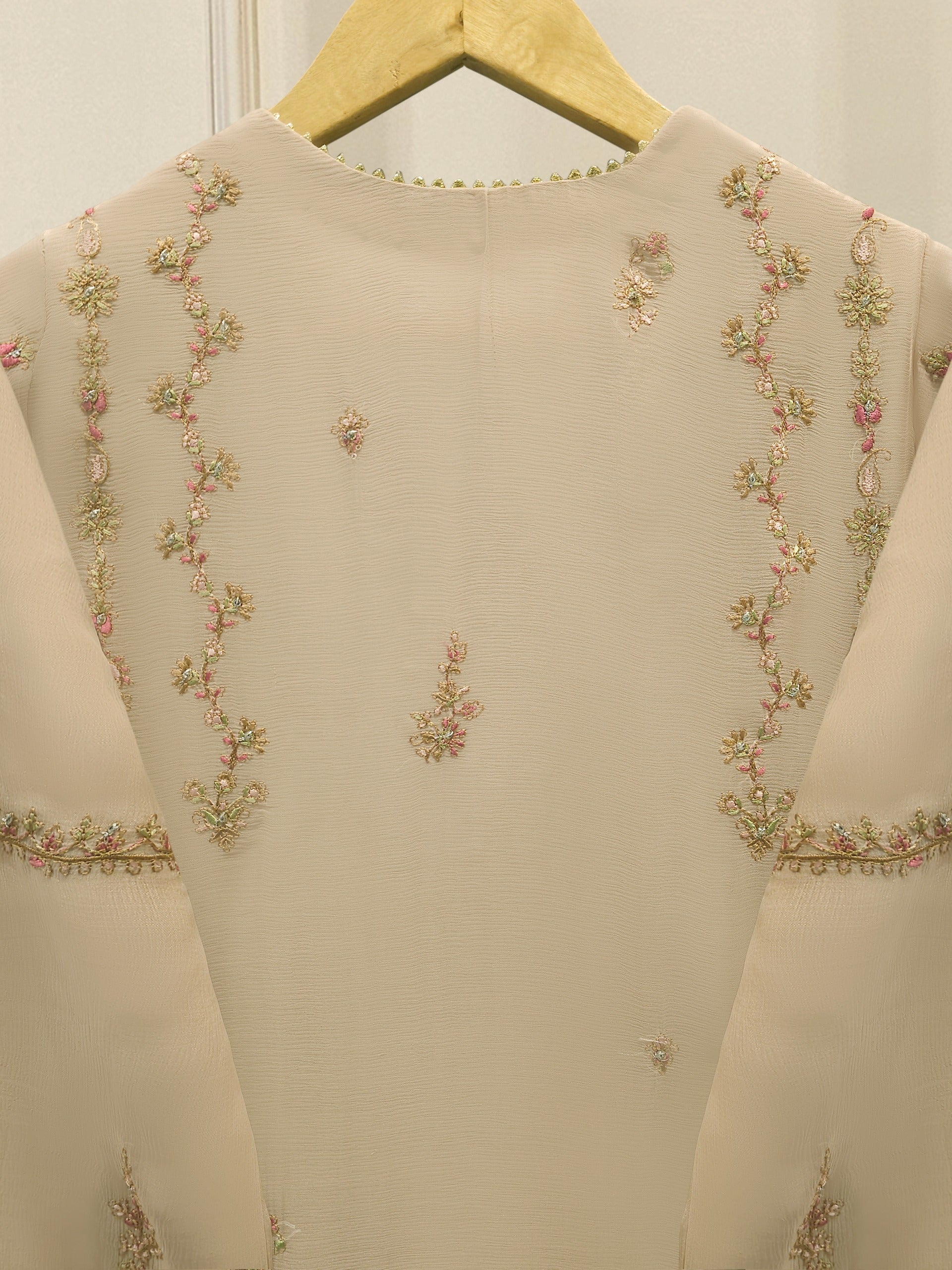 Elevate your style with our beige embroidered chiffon straight shirt crafted with utmost care and attention to detail. The shirt features intricate embroidery on the front and sleeves, adding a touch of timeless charm.