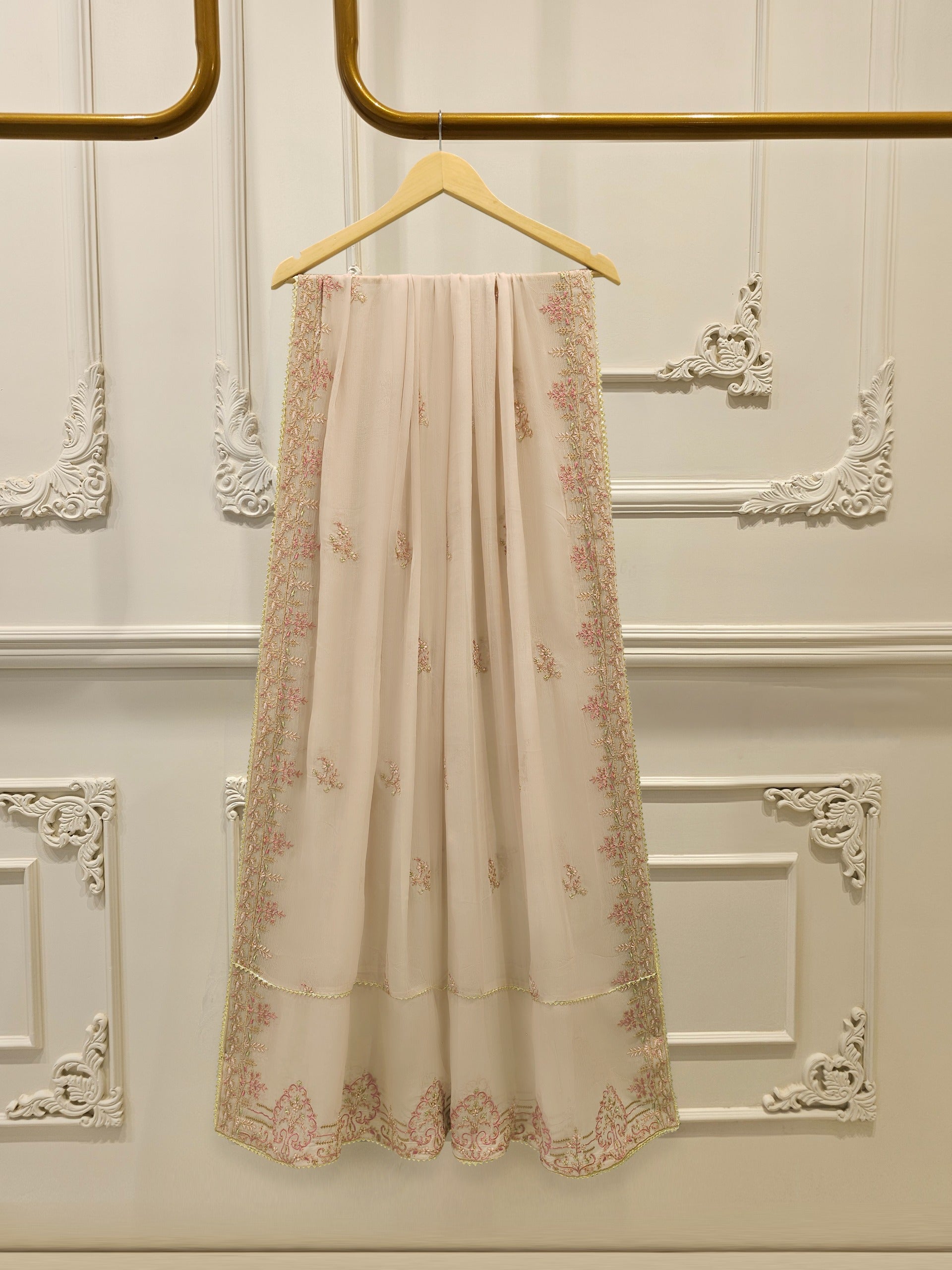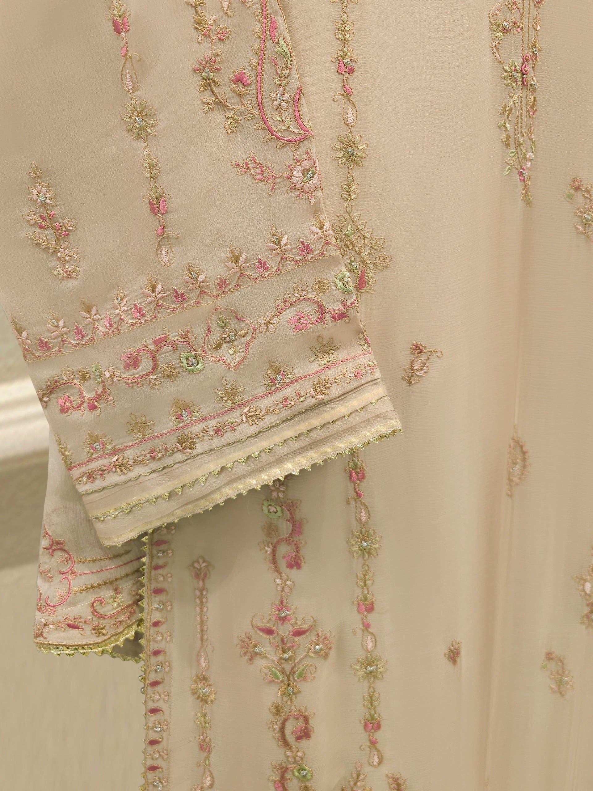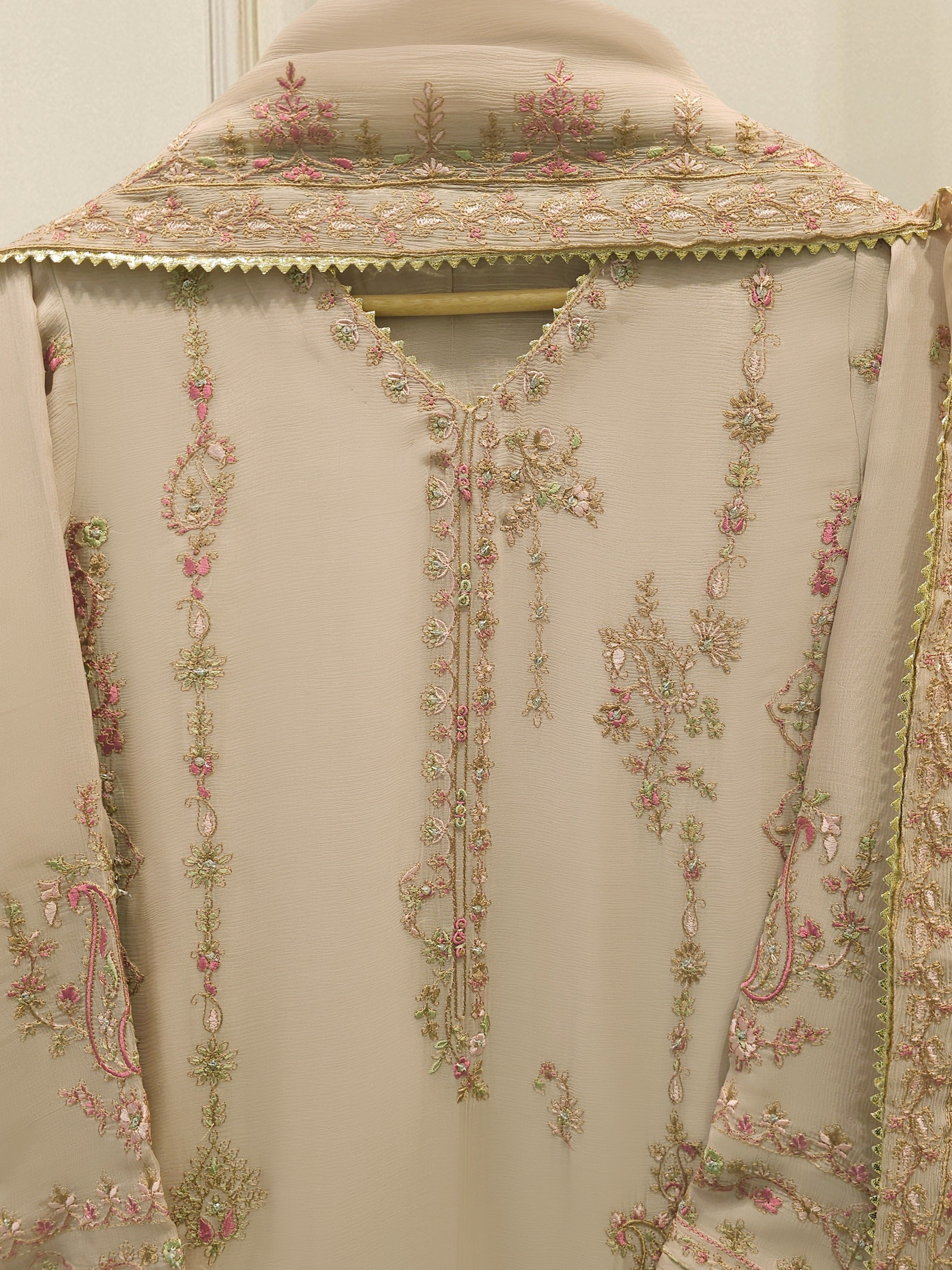Elevate your style with our beige embroidered chiffon straight shirt crafted with utmost care and attention to detail. The shirt features intricate embroidery on the front and sleeves, adding a touch of timeless charm.