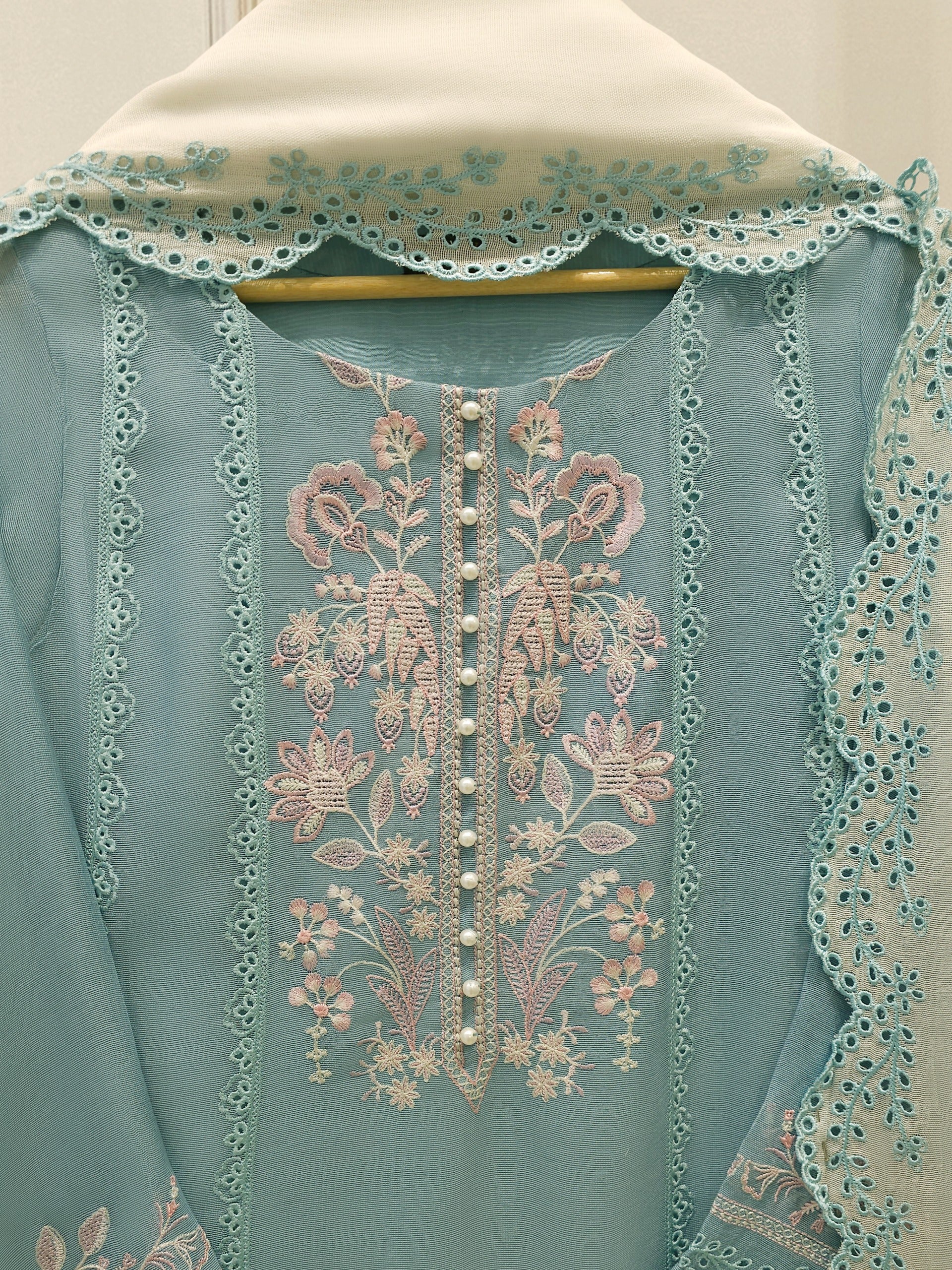 Introducing our elegant embroidered cotton net shirt with pants a perfect choice for those who appreciate intricate detailing and graceful style.a lightweight net shirt, comfortable cotton bottoms, and a matching dupatta. Soft, breathable fabric with delicate detailing makes it perfect for everyday wear or casual occasions.