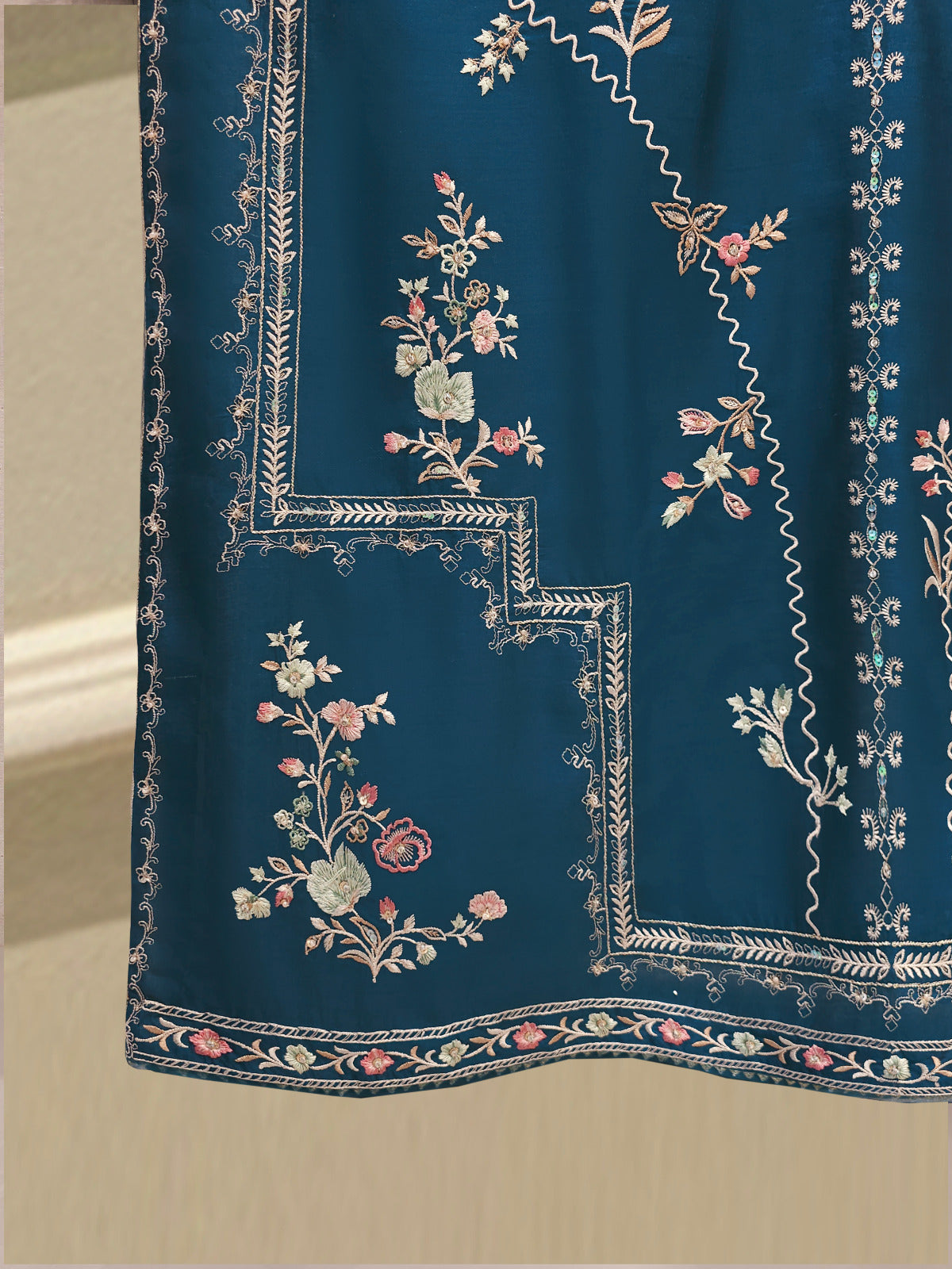 Elevate your style blue white embroidered khadii silk straight shirt crafted with utmost care and attention to detail. The shirt features intricate embroidery on the front and sleeves, adding a touch of timeless charm.