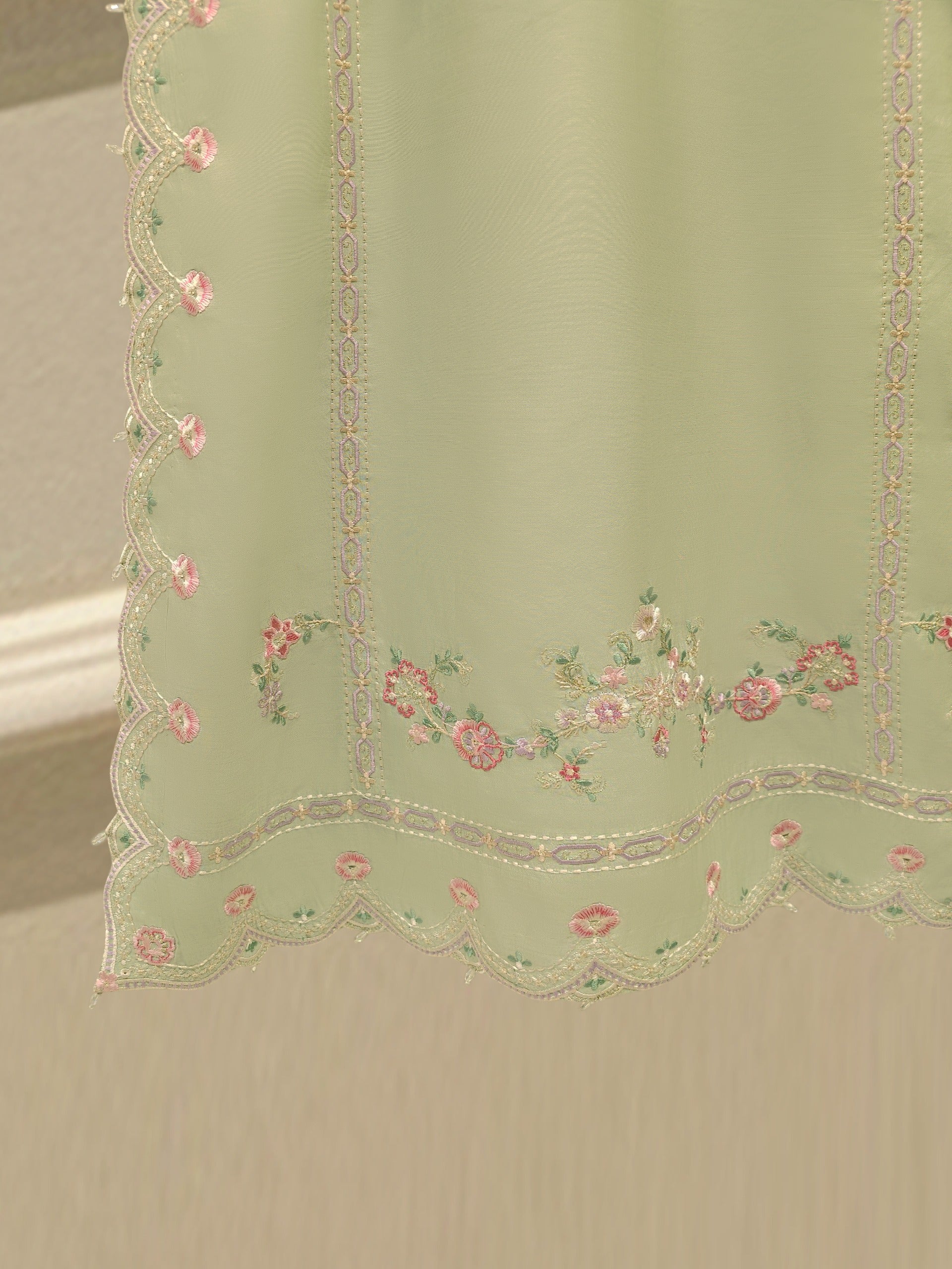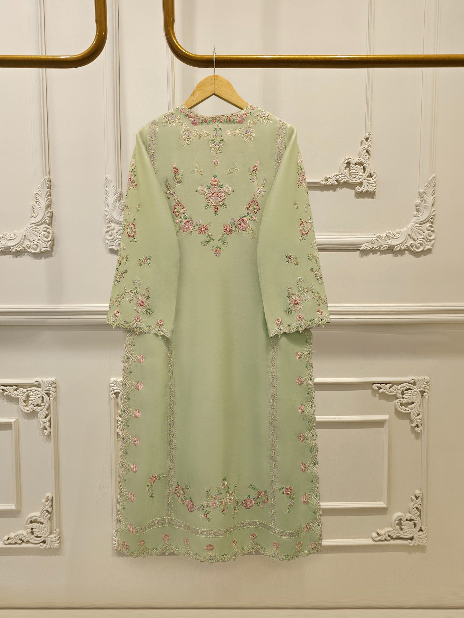 Elevate your style pista green embroidered khadii silk straight shirt crafted with utmost care and attention to detail. The shirt features intricate embroidery on the front and sleeves, adding a touch of timeless charm.