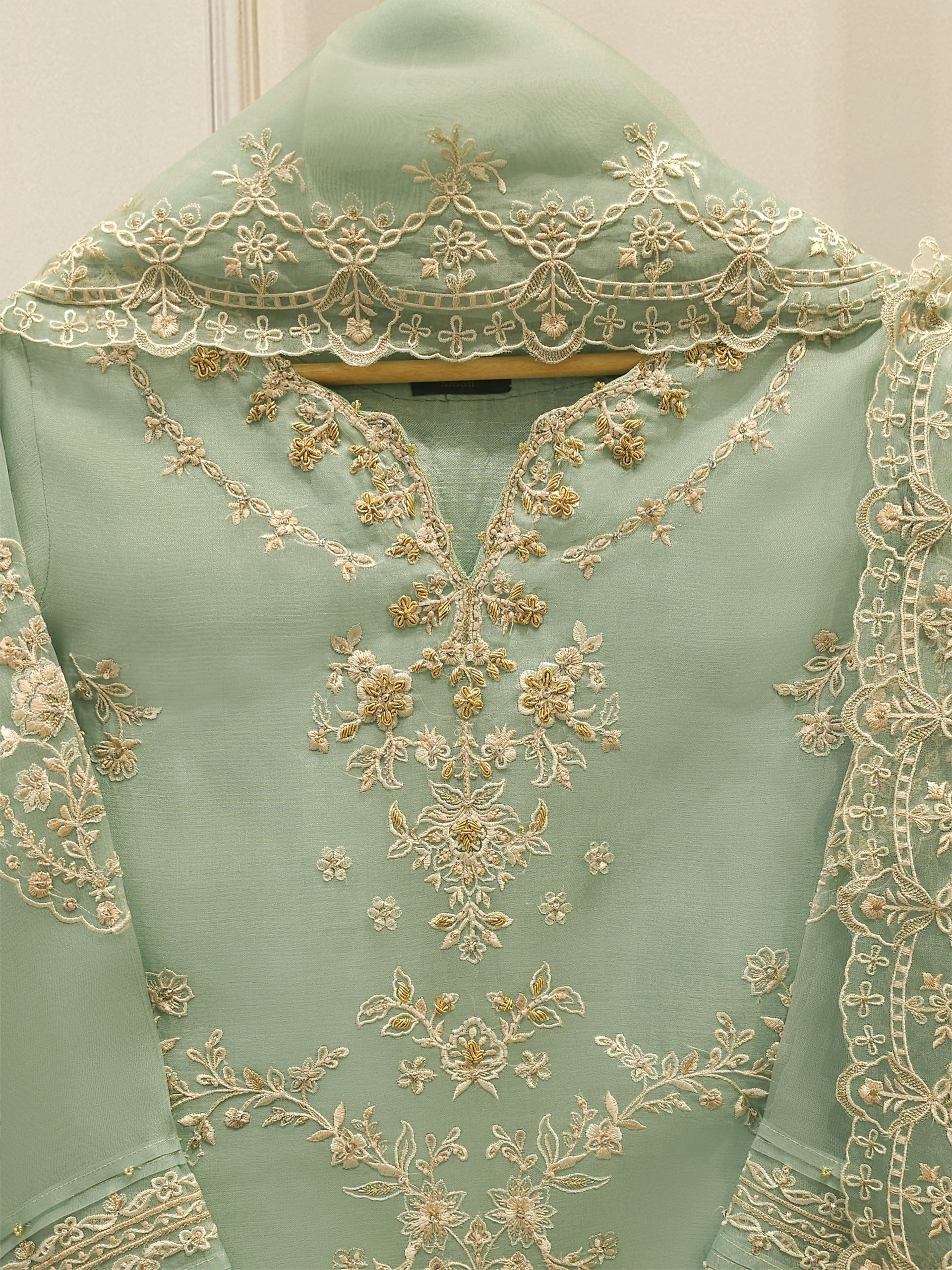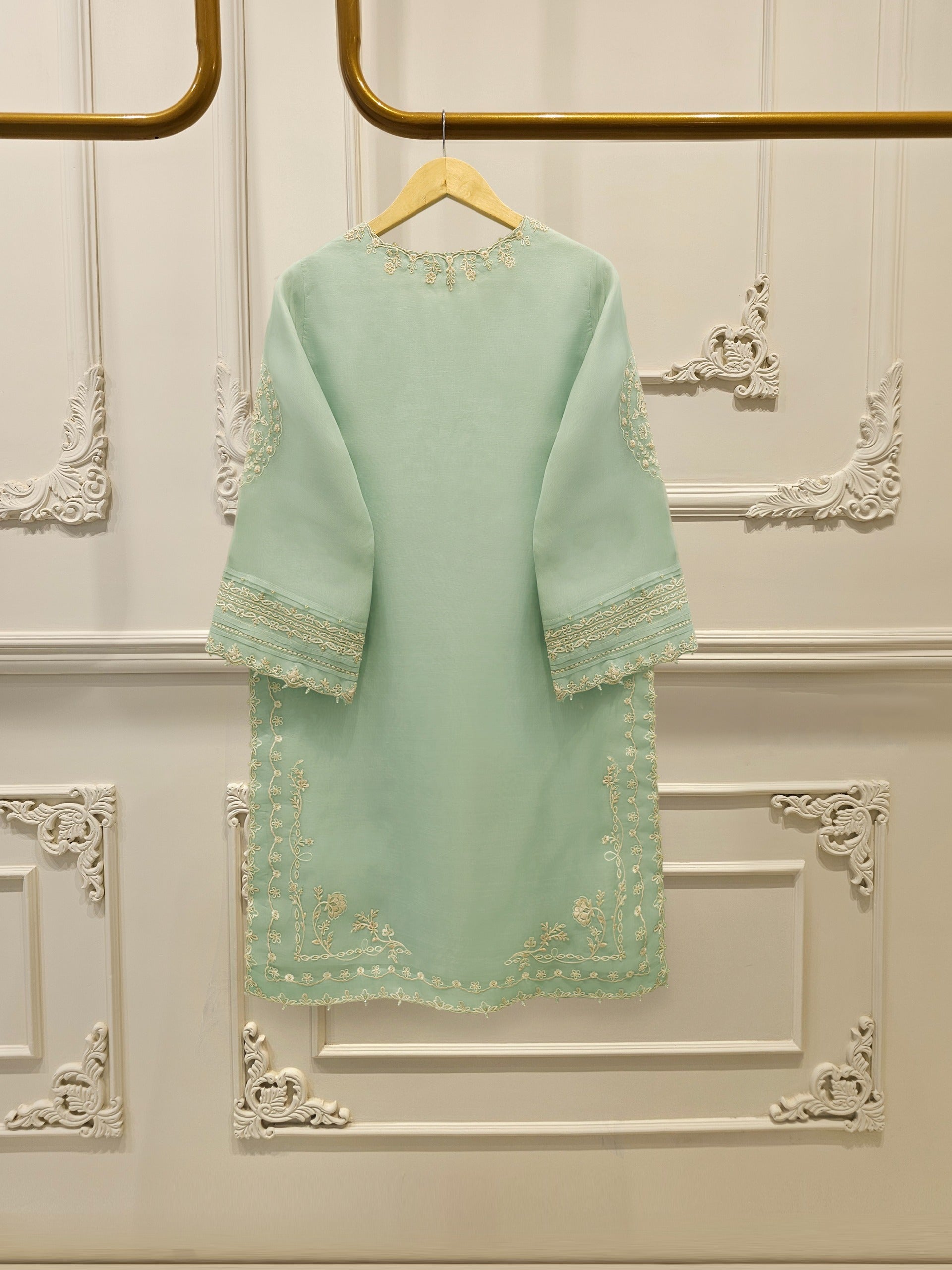 Elevate your style with sea green embroidered organza straight shirt crafted with utmost care and attention to detail. The shirt features intricate embroidery on the front and sleeves, adding a touch of timeless charm.