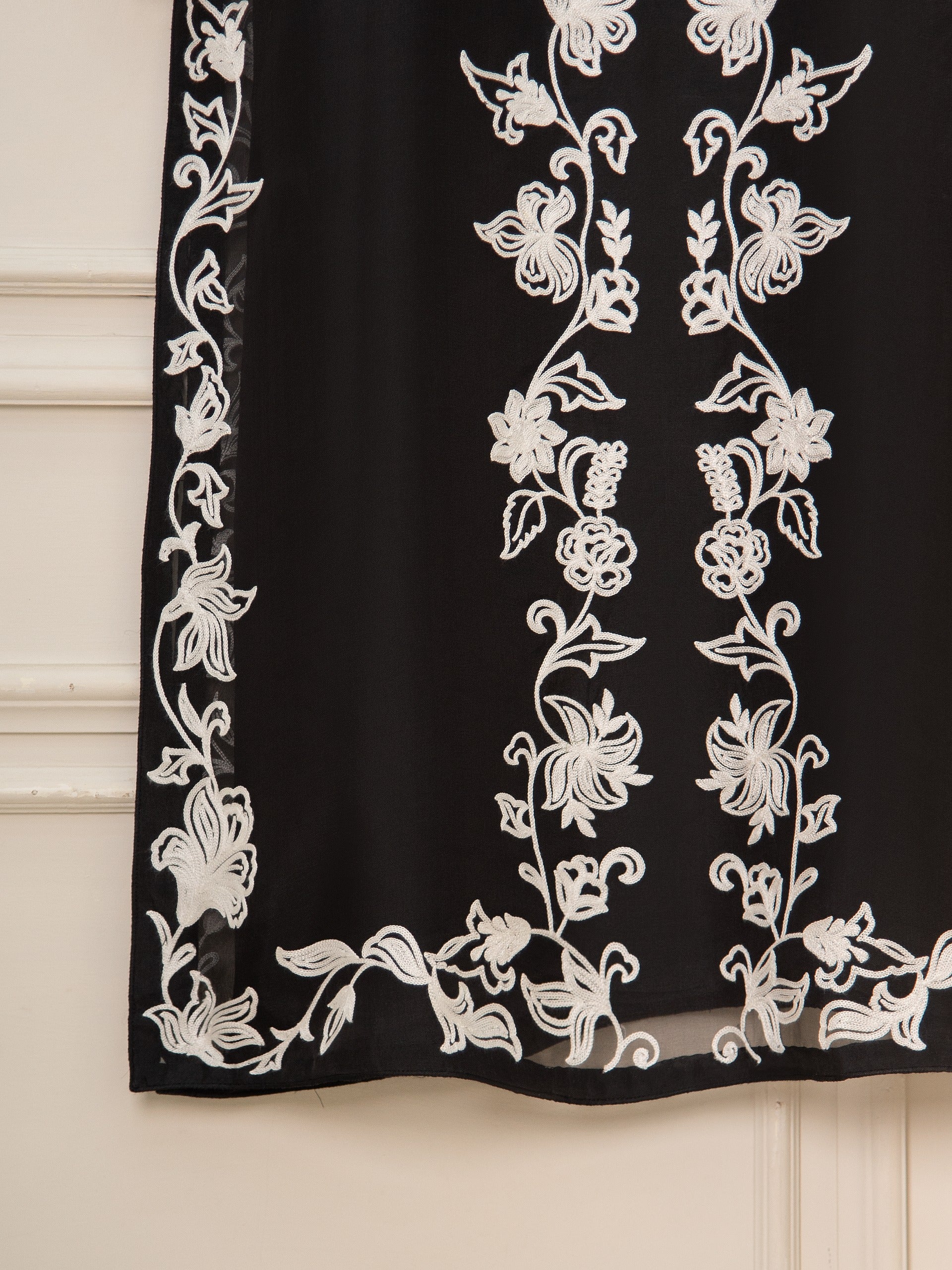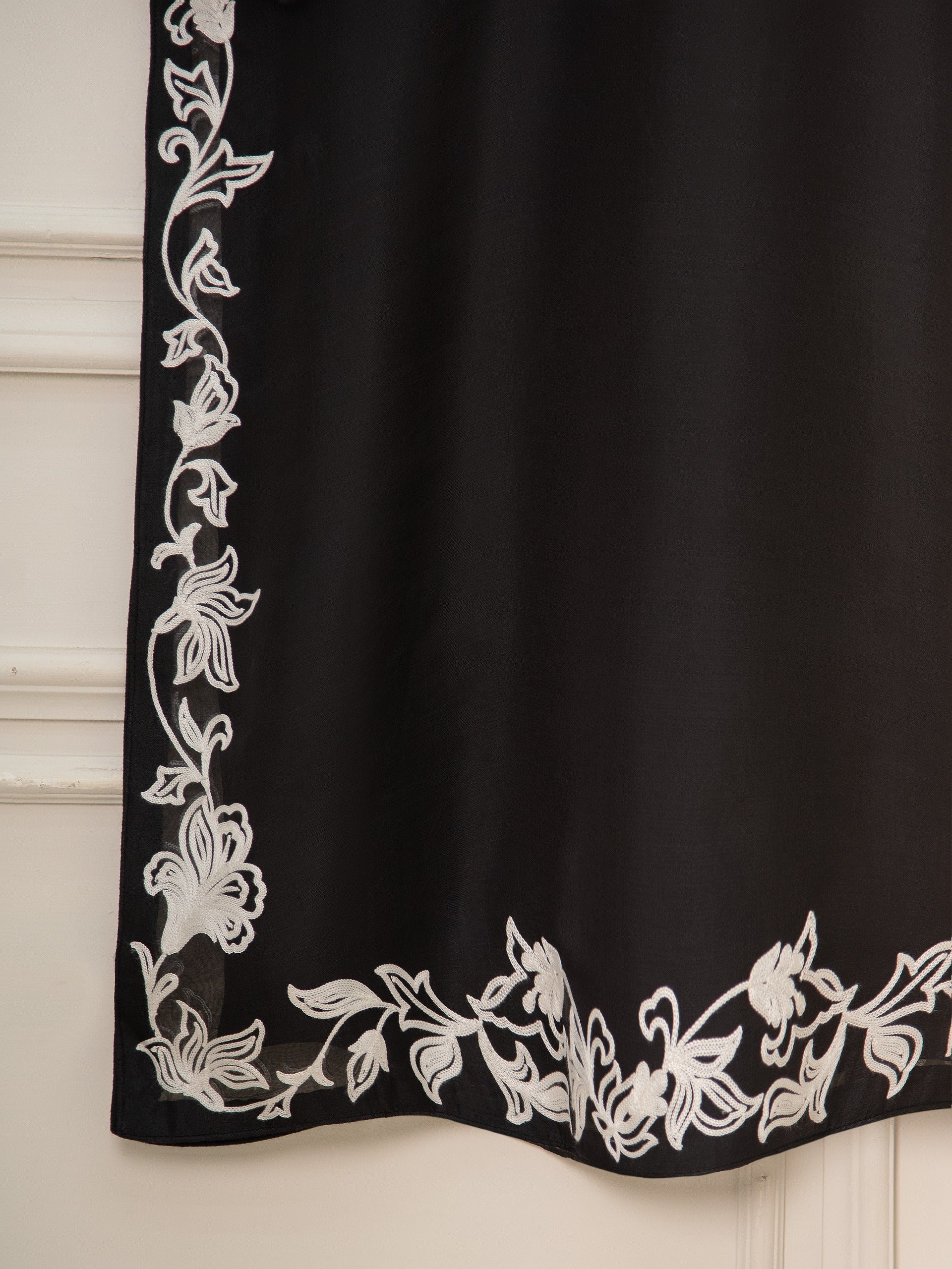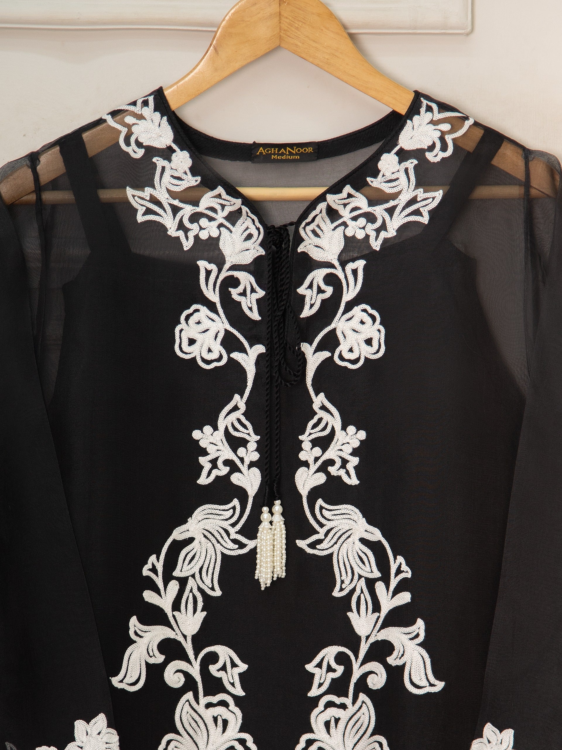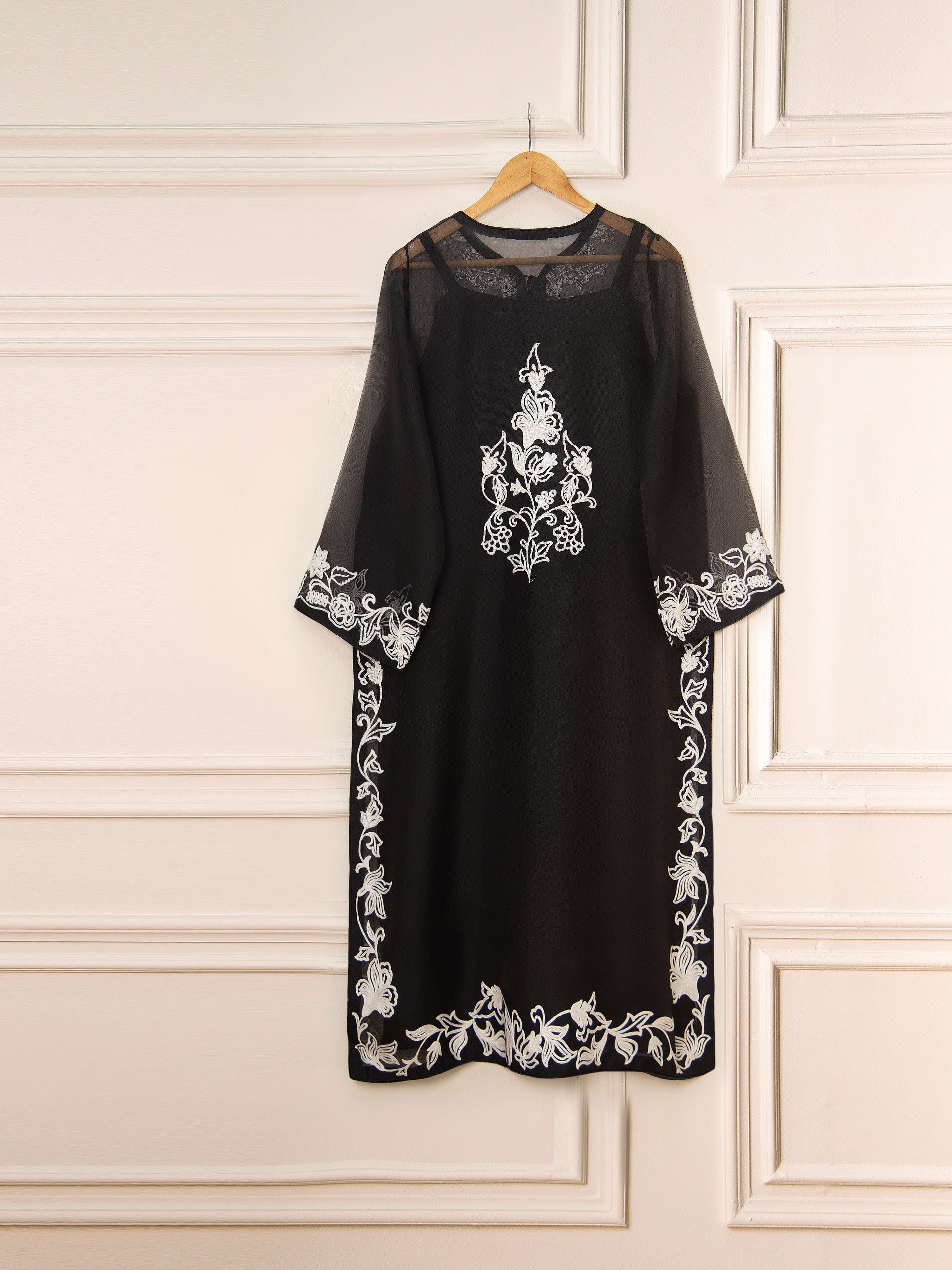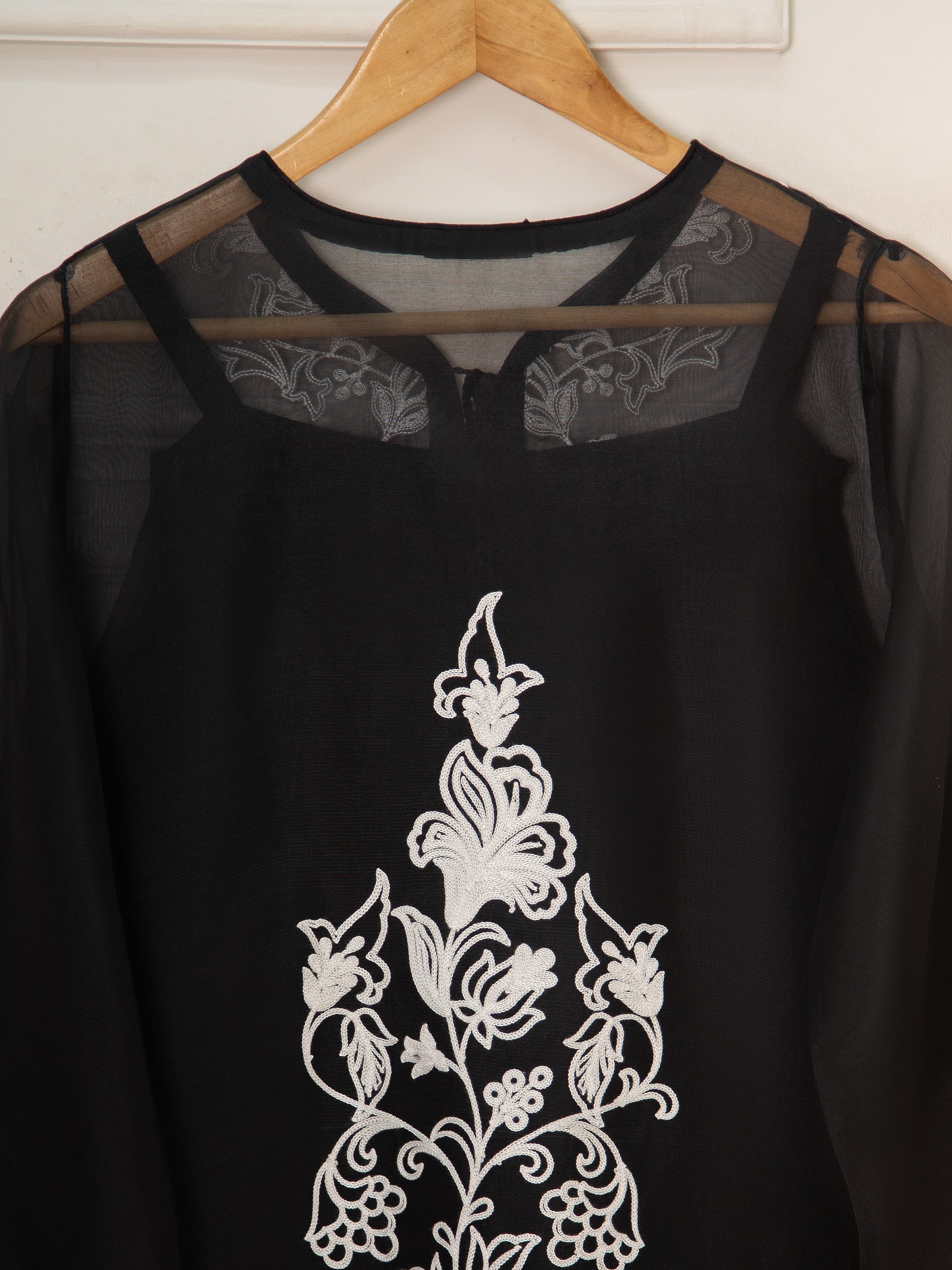 Elevate your style with our black embroidered organza straight shirt crafted with utmost care and attention to detail. The shirt features intricate embroidery on the front and sleeves, adding a touch of timeless charm.