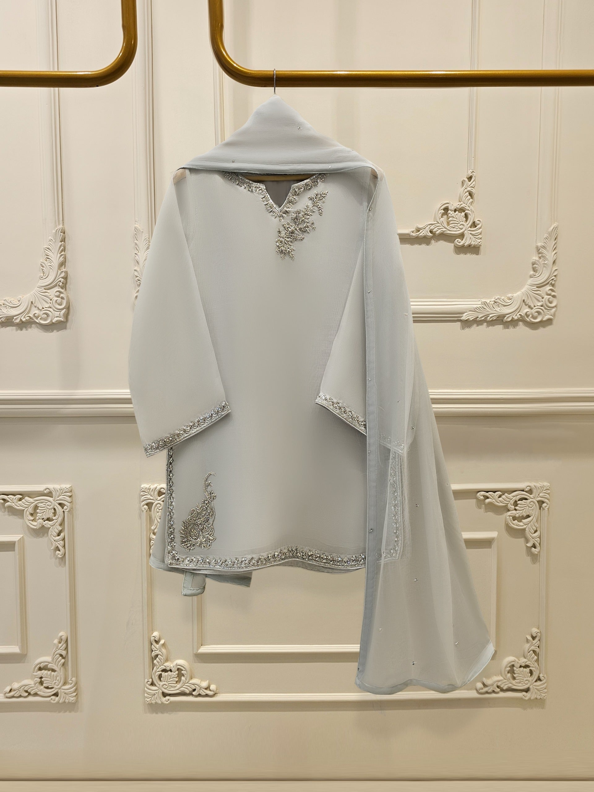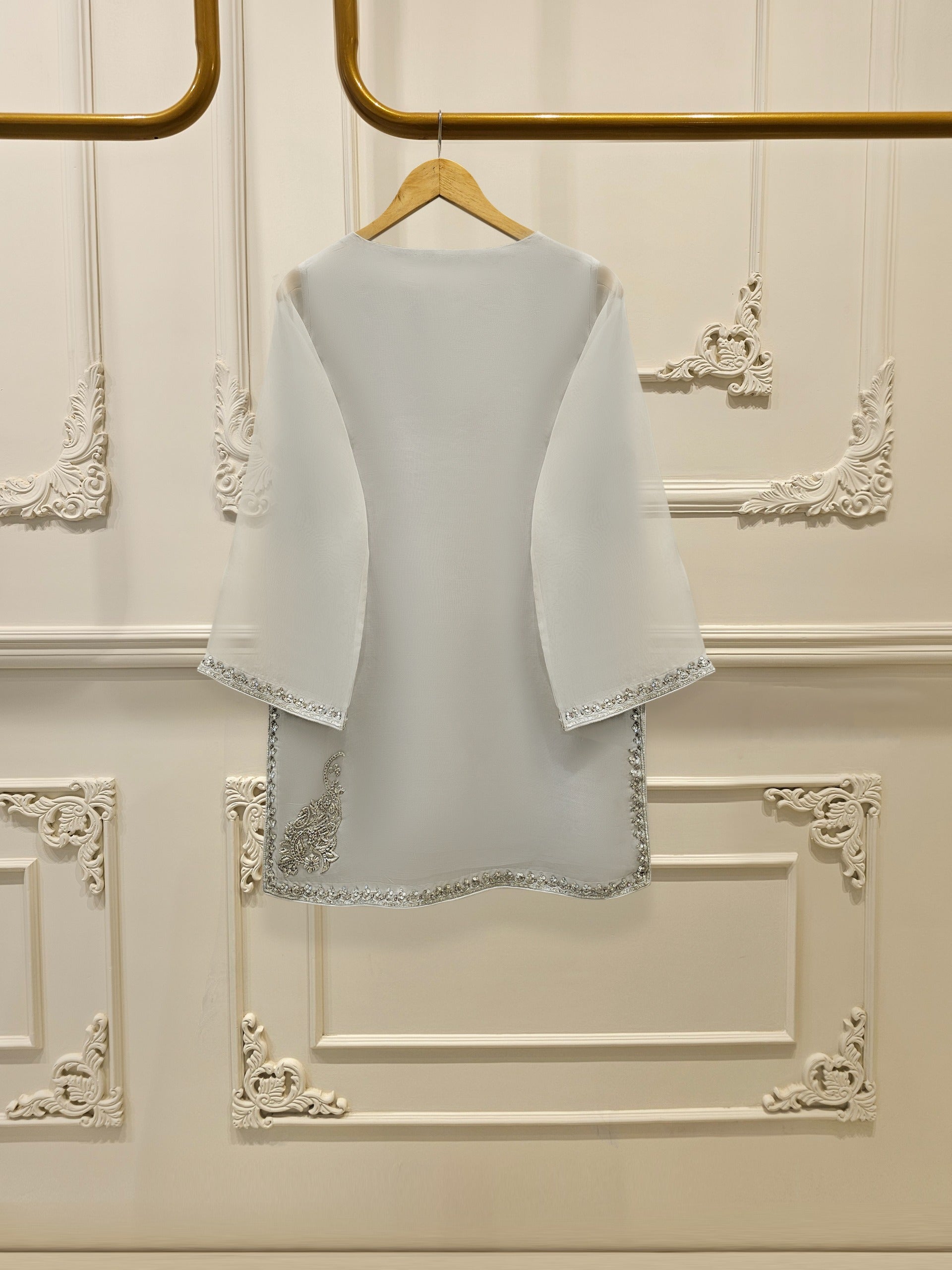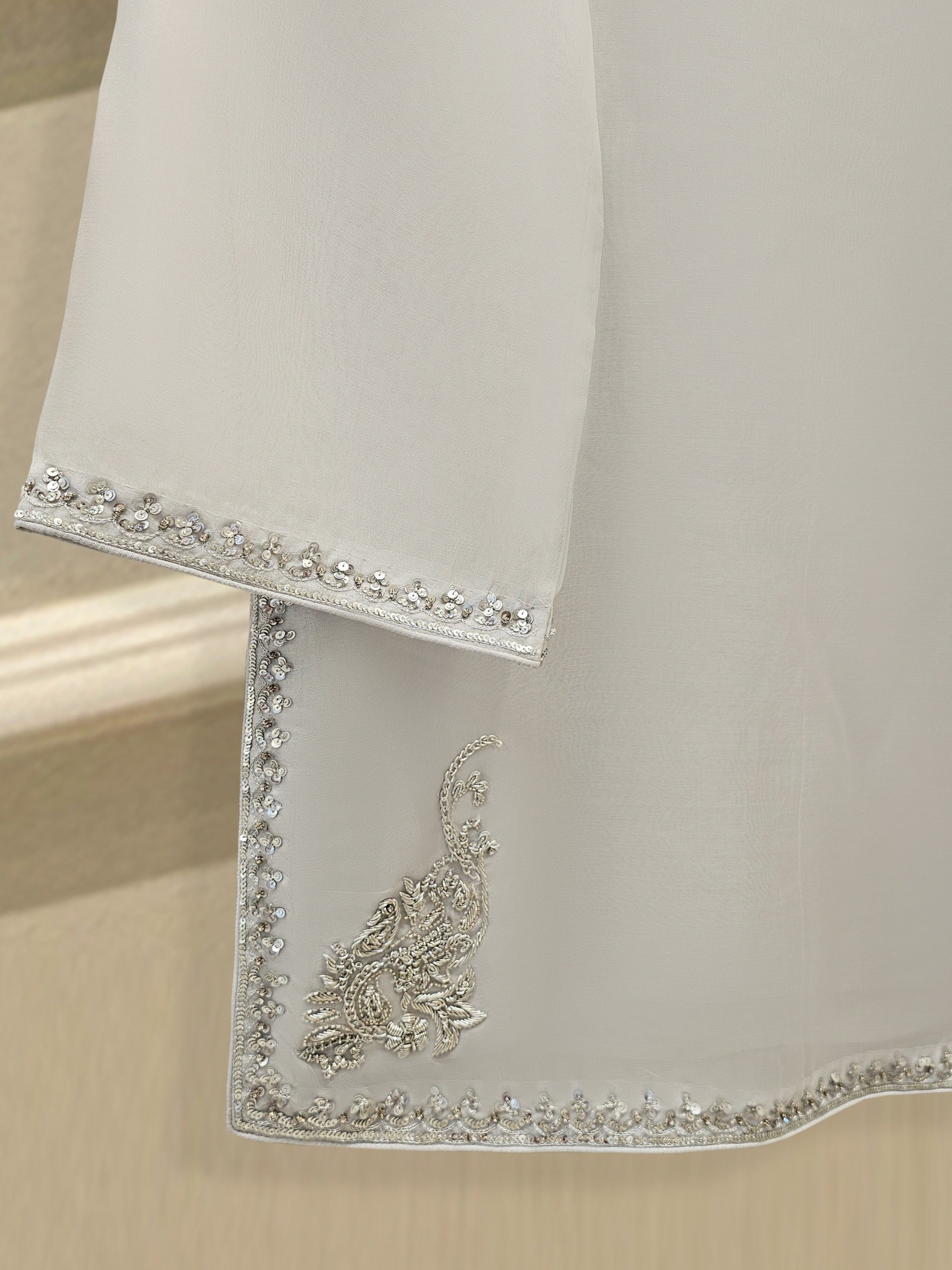 Elevate your style with our grey embroidered organza straight shirt crafted with utmost care and attention to detail. The shirt features intricate embroidery on the front and sleeves, adding a touch of timeless charm.