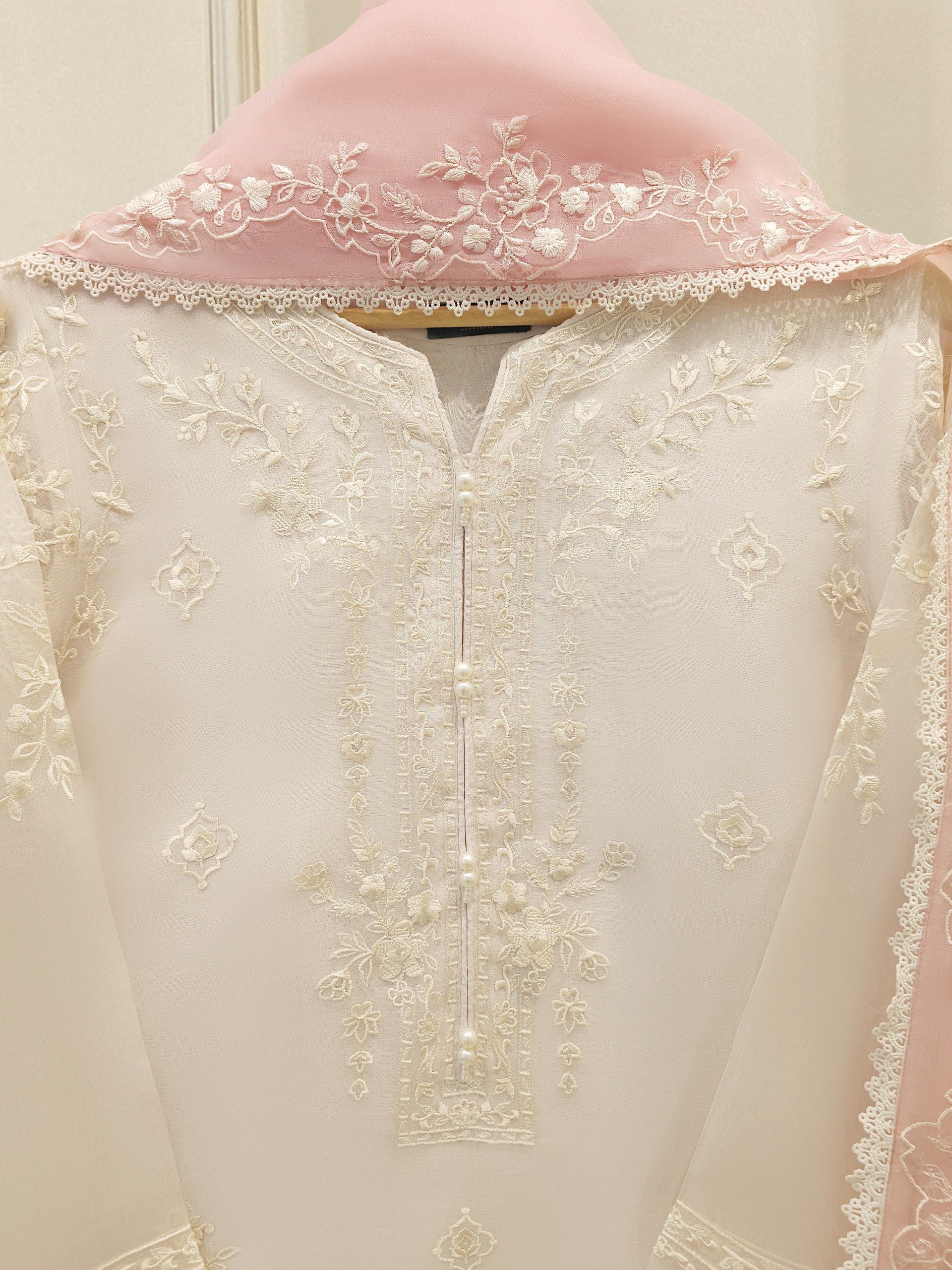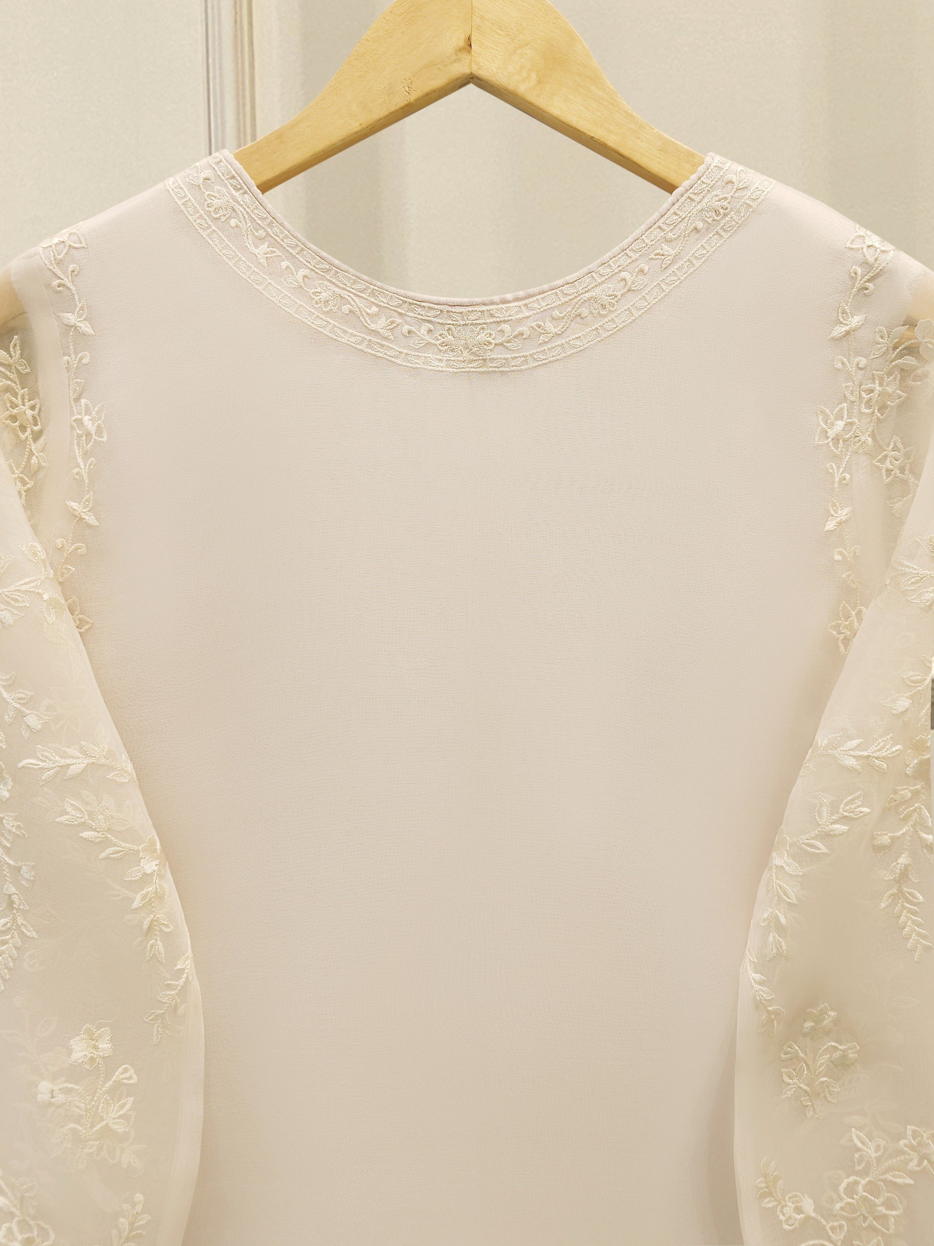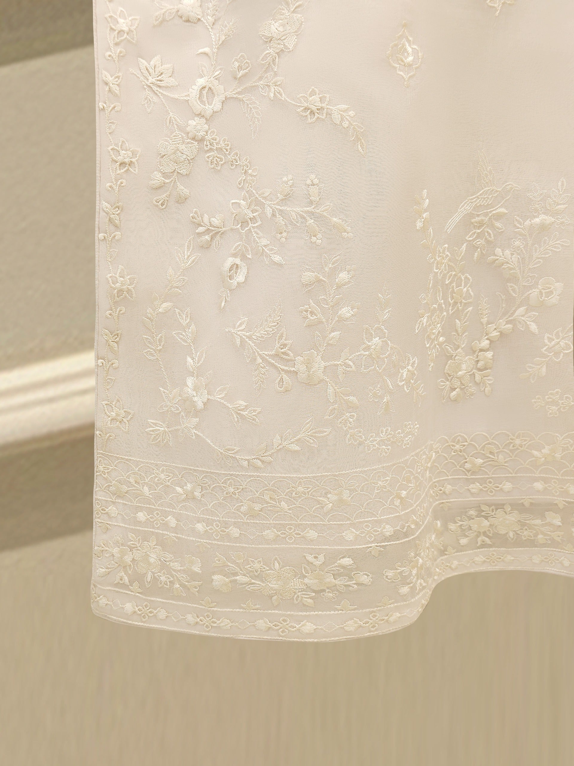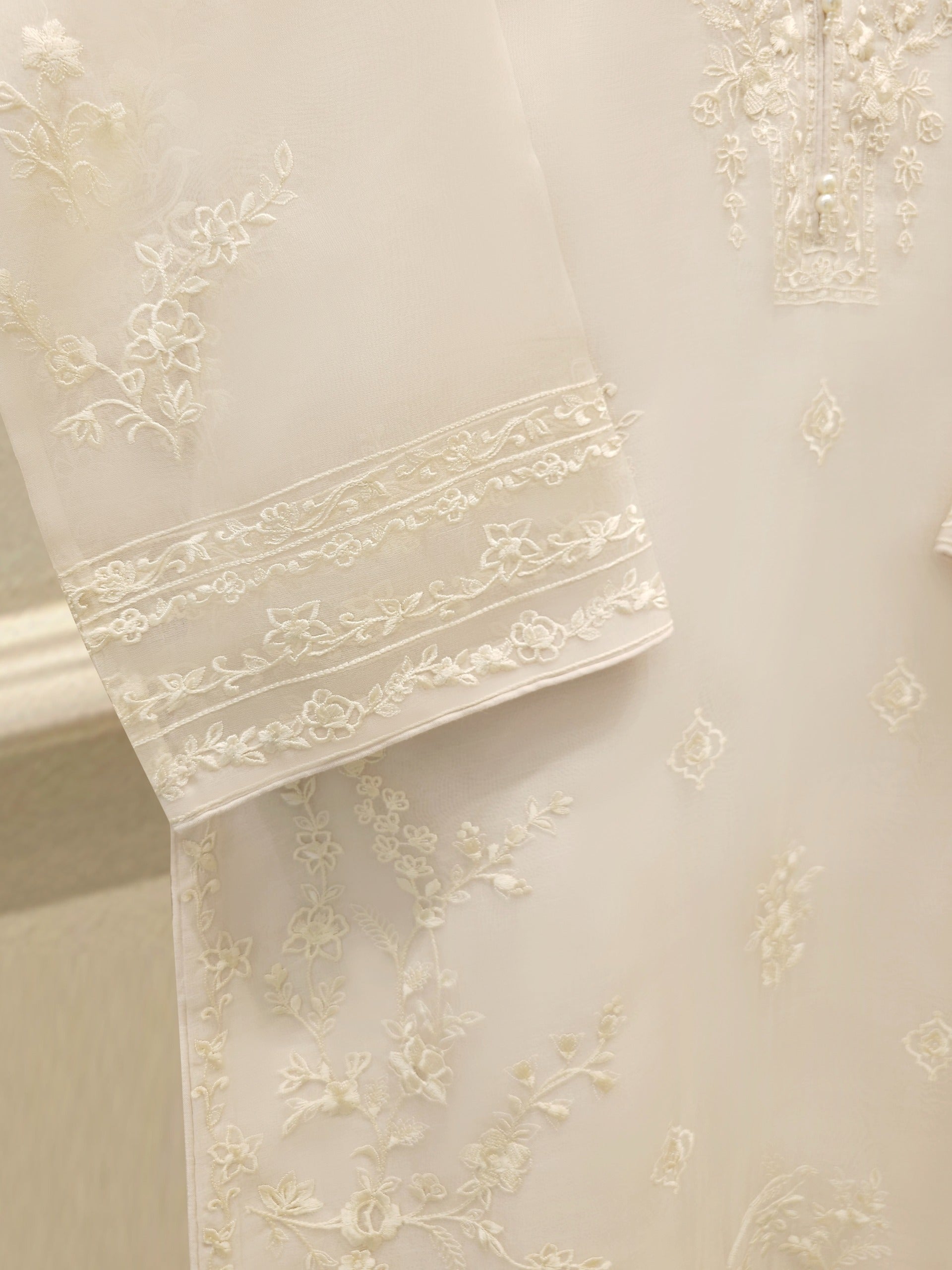 Elevate your style with our off white embroidered organza straight shirt crafted with utmost care and attention to detail. The shirt features intricate embroidery on the front and sleeves, adding a touch of timeless charm.