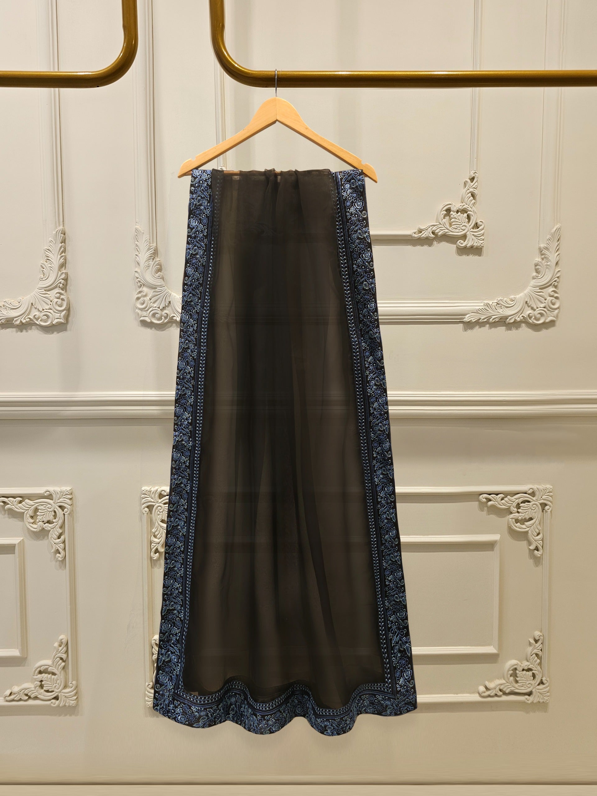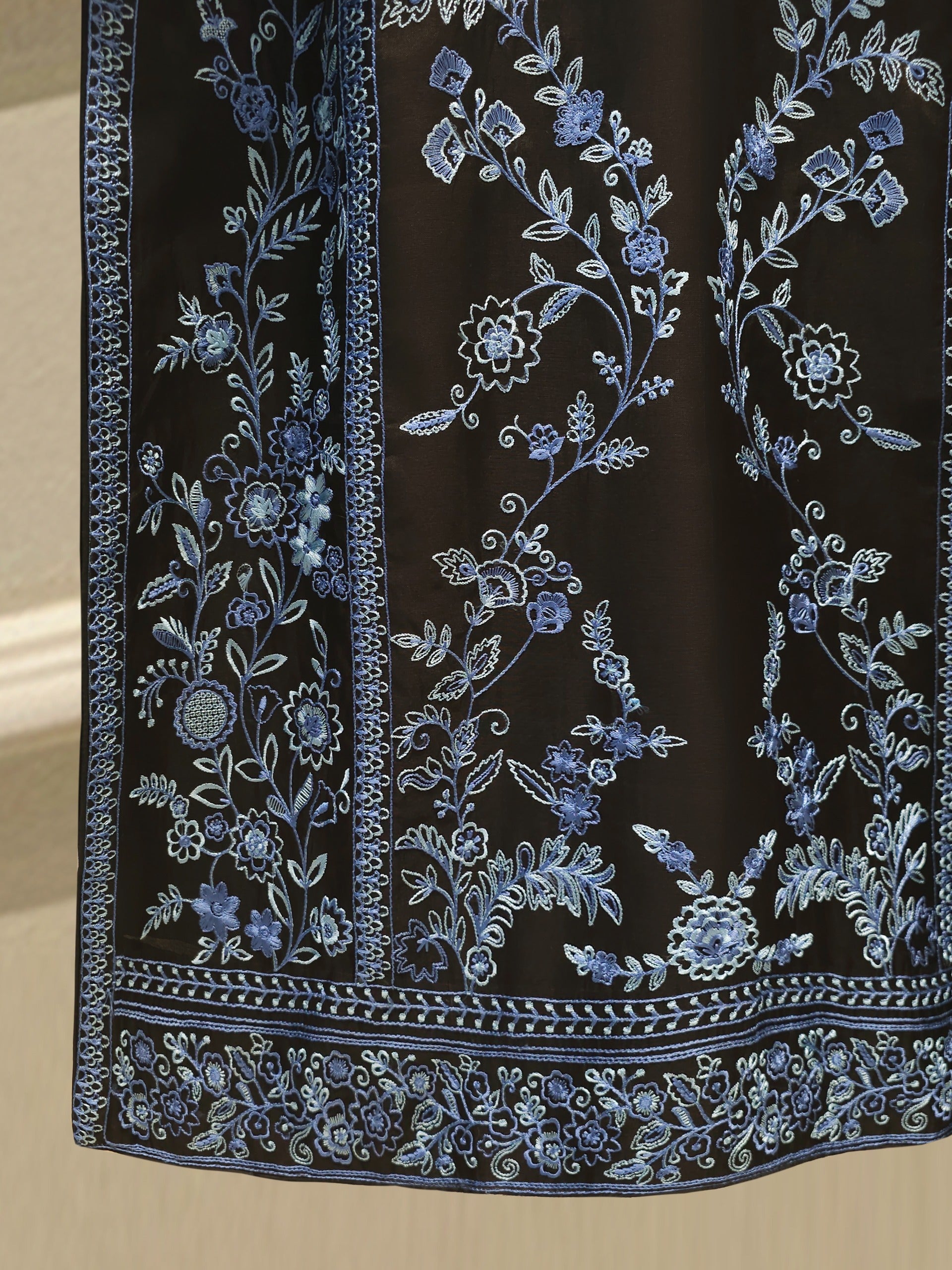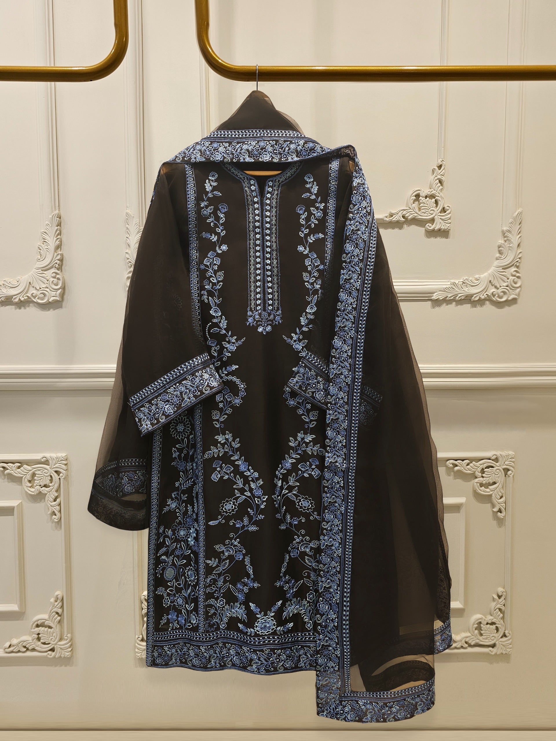 Elevate your style with our black embroidered organza straight shirt crafted with utmost care and attention to detail. The shirt features intricate embroidery on the front and sleeves, adding a touch of timeless charm.