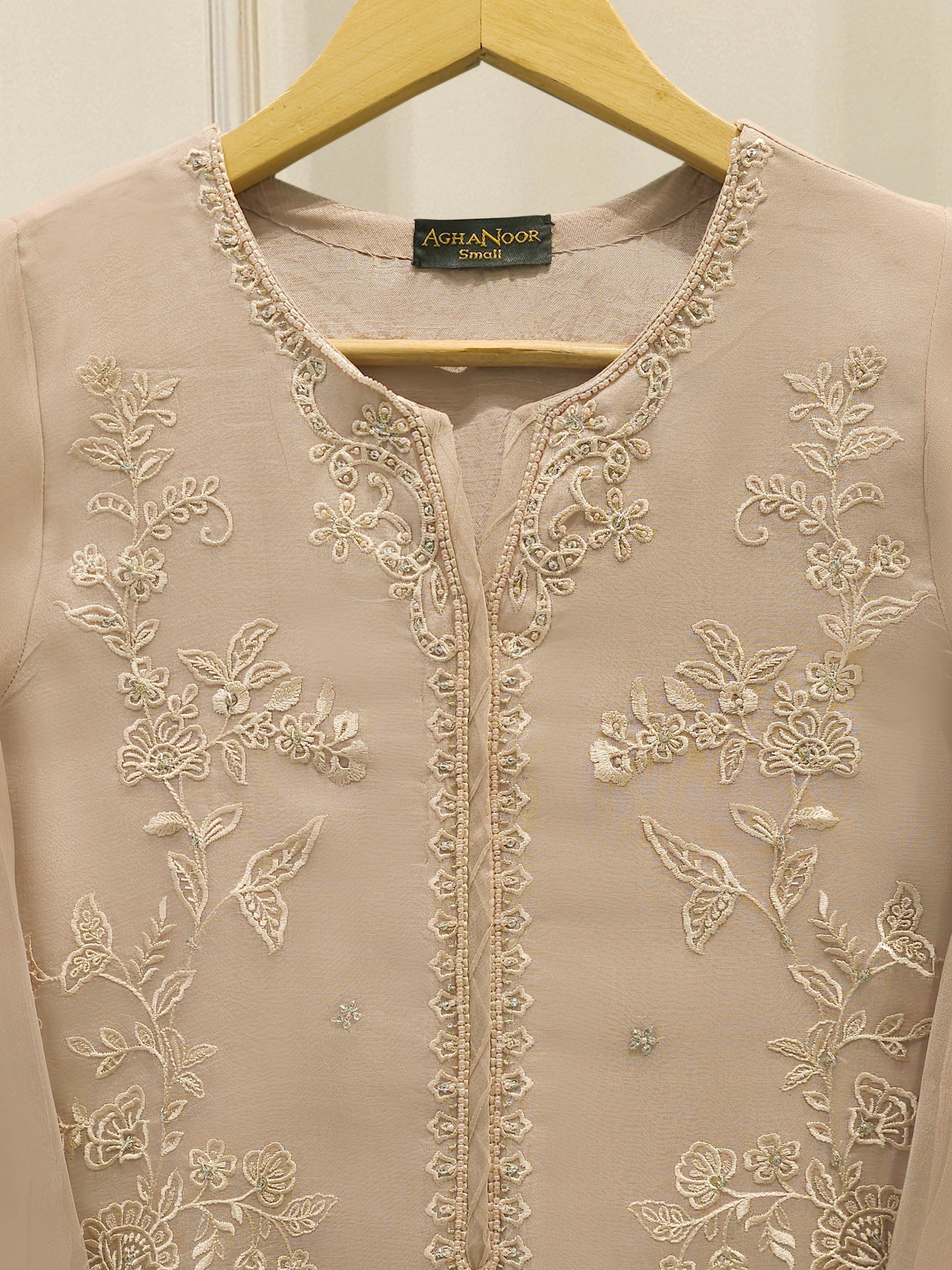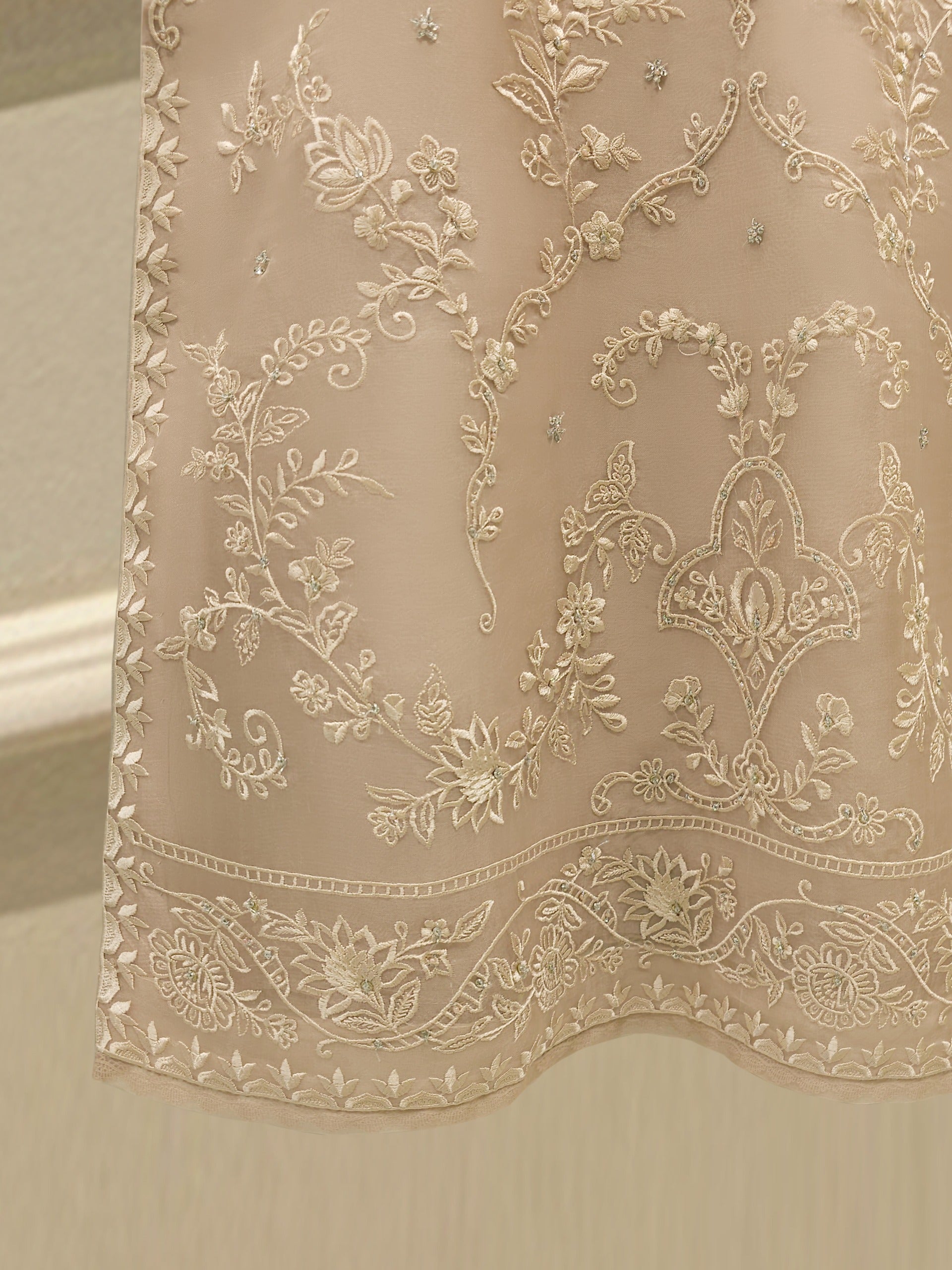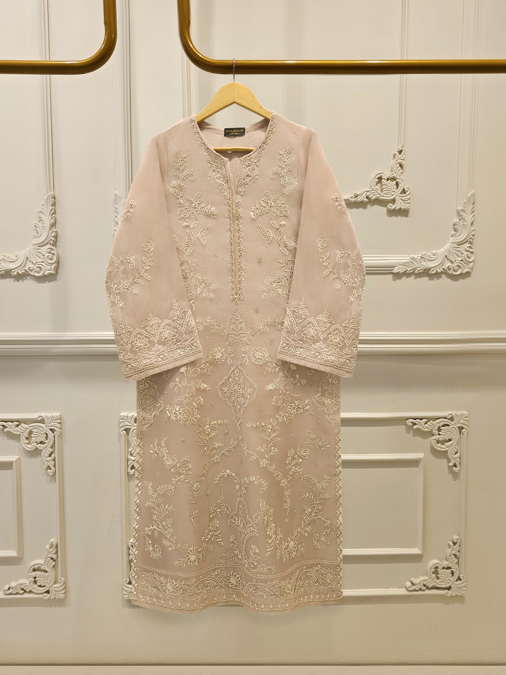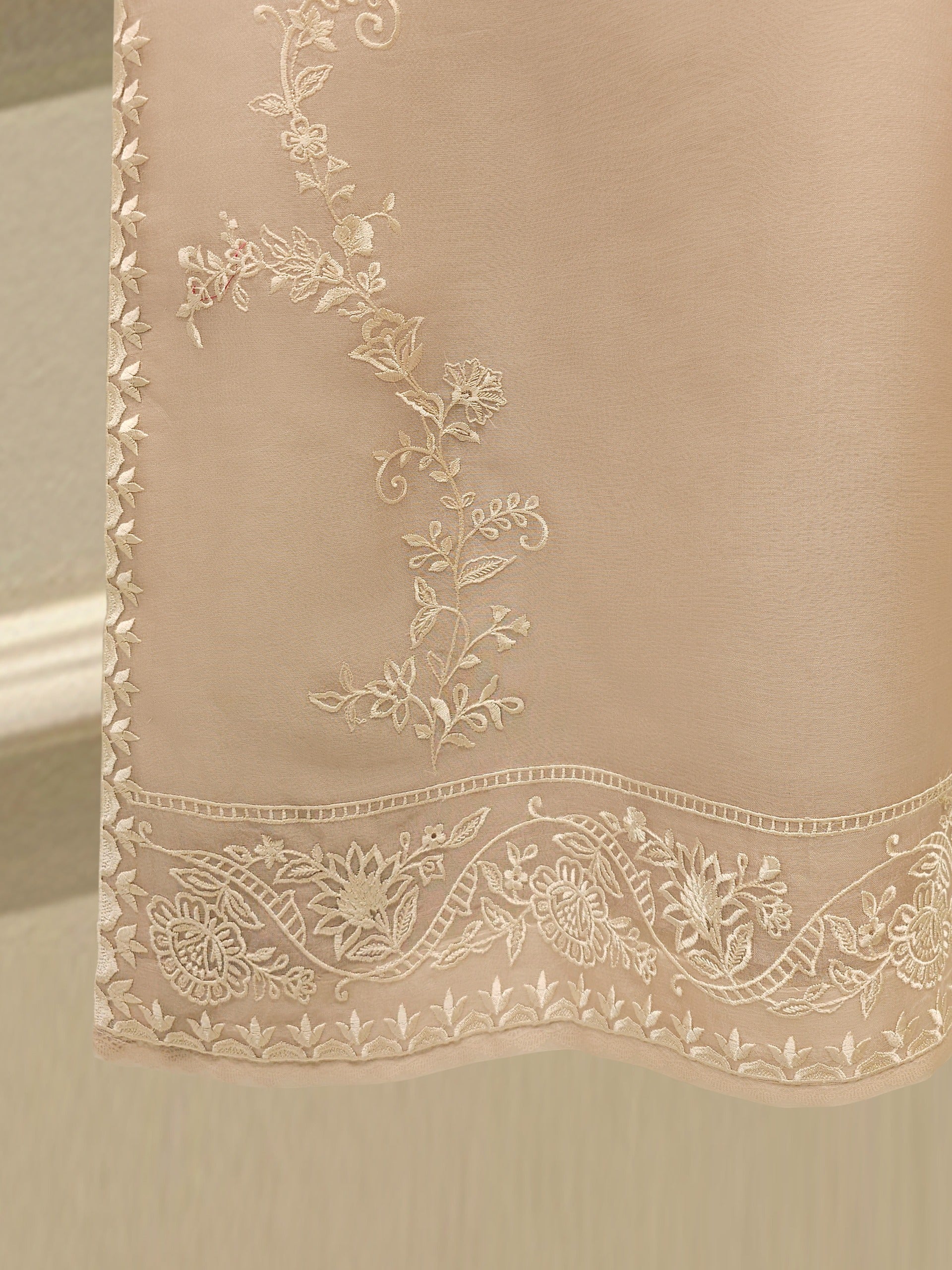 Elevate your style with beige embroidered organza straight shirt crafted with utmost care and attention to detail. The shirt features intricate embroidery on the front and sleeves, adding a touch of timeless charm.
