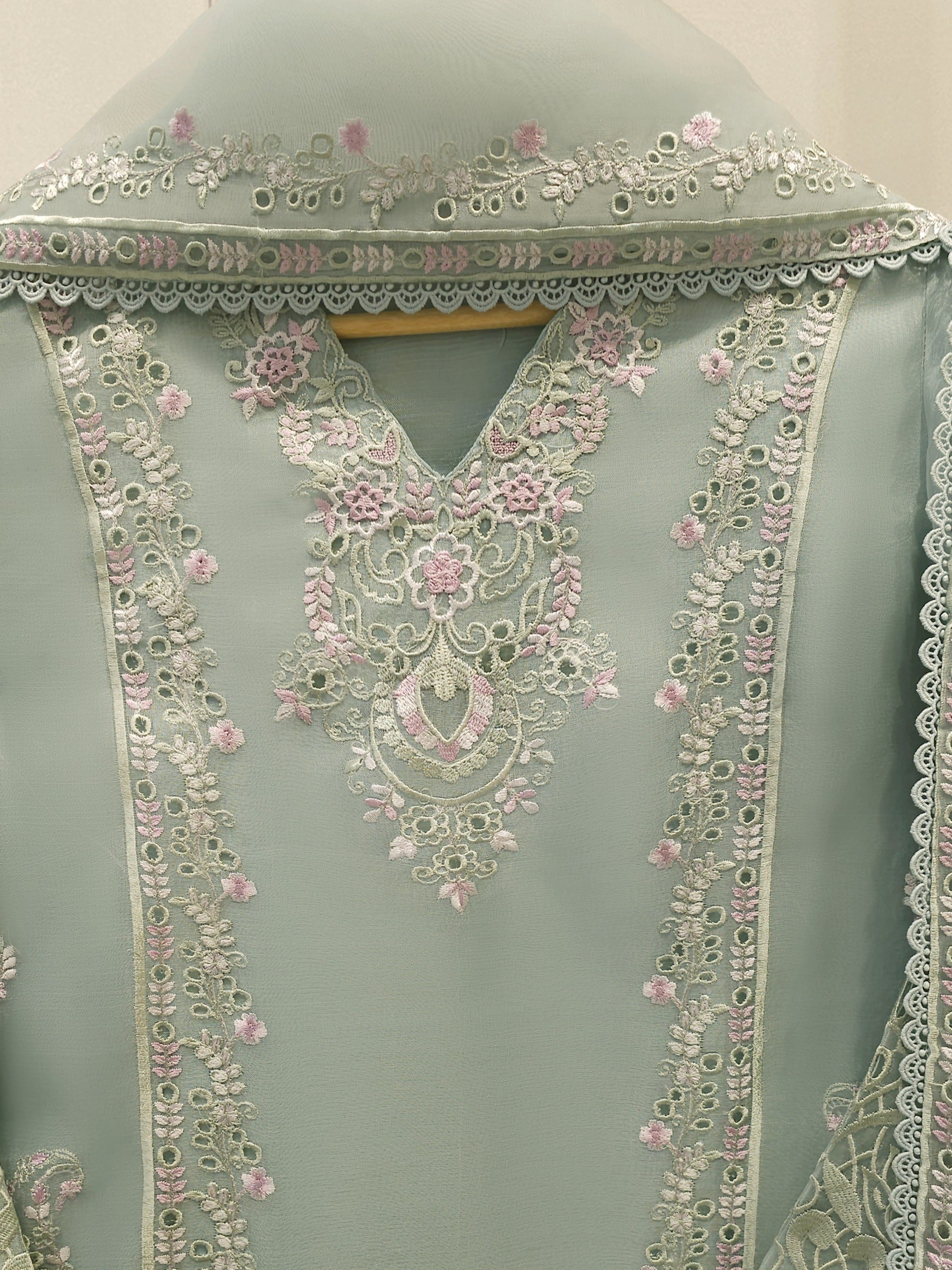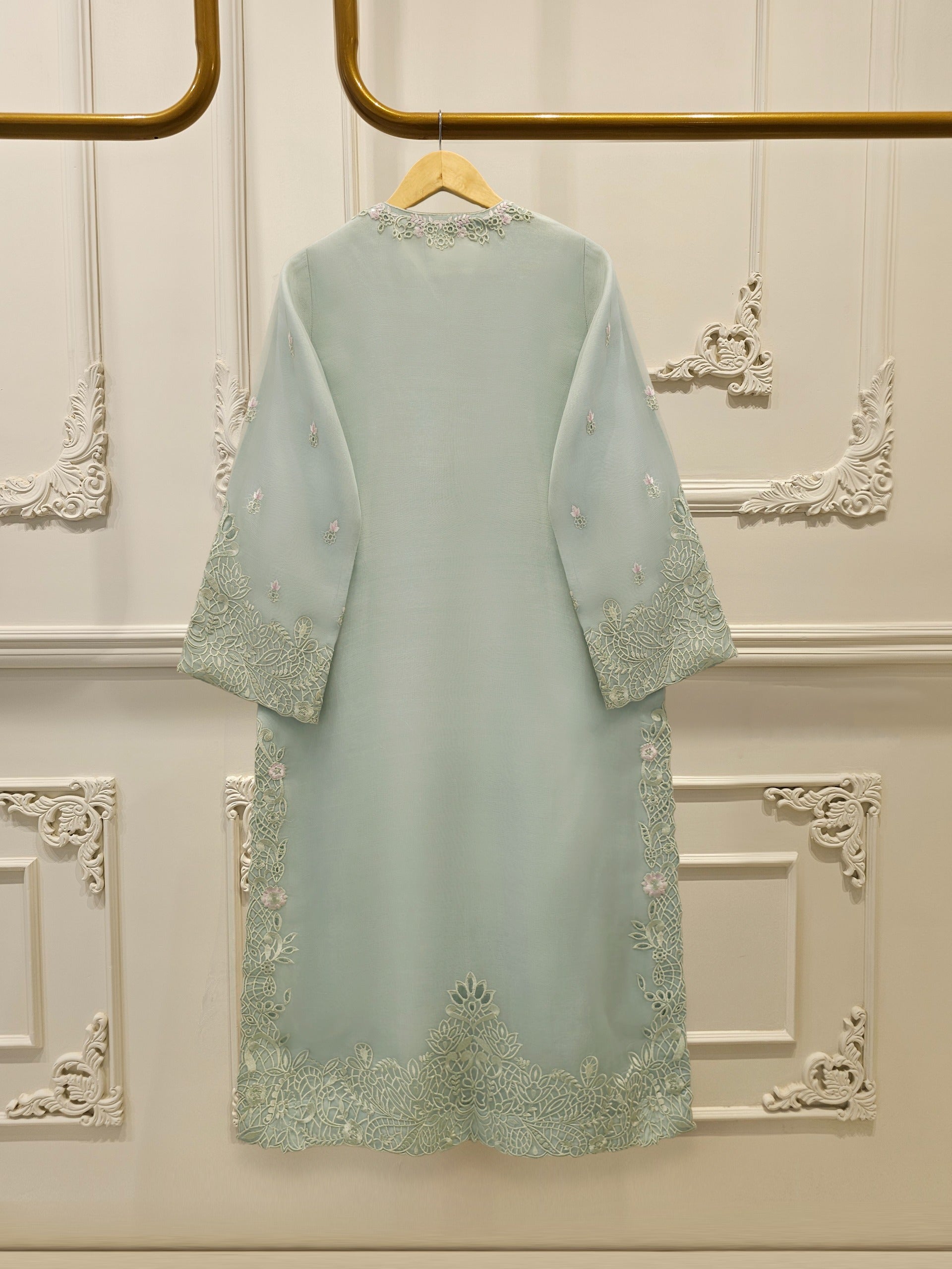Elevate your style with sea green embroidered organza straight shirt crafted with utmost care and attention to detail. The shirt features intricate embroidery on the front and sleeves, adding a touch of timeless charm.