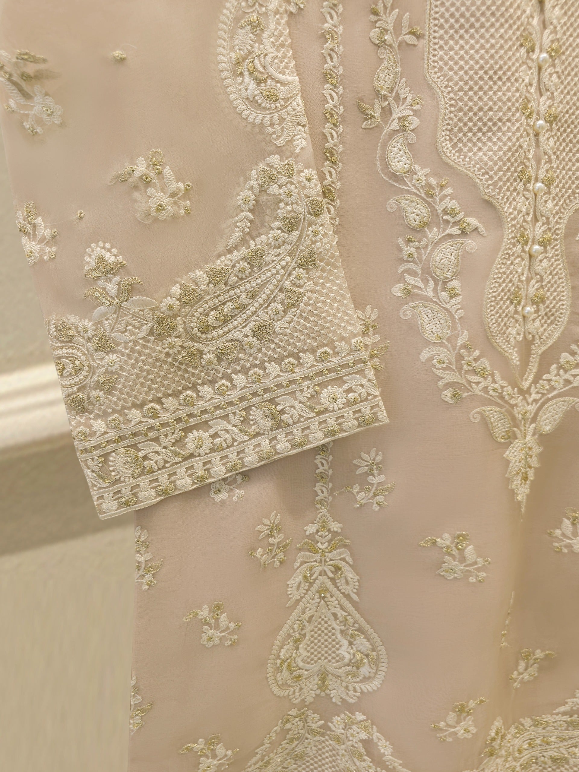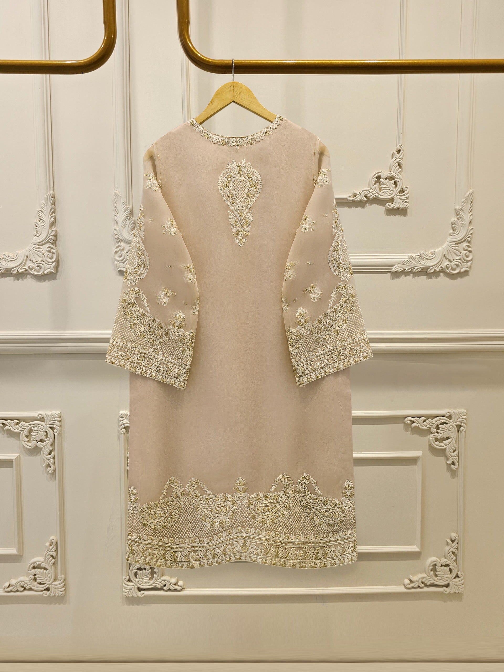 Elevate your style with sea beige embroidered organza straight shirt crafted with utmost care and attention to detail. The shirt features intricate embroidery on the front and sleeves, adding a touch of timeless charm.