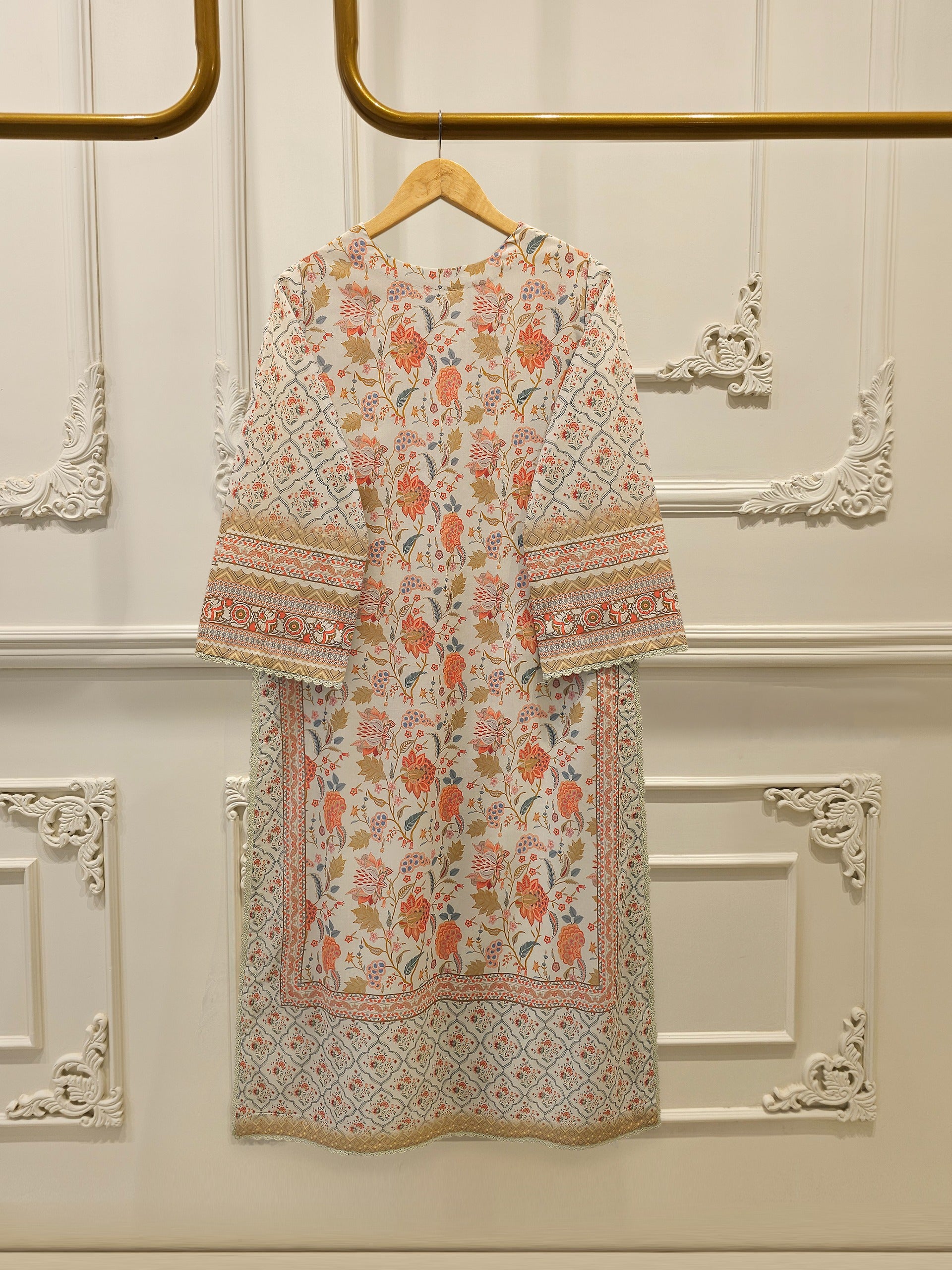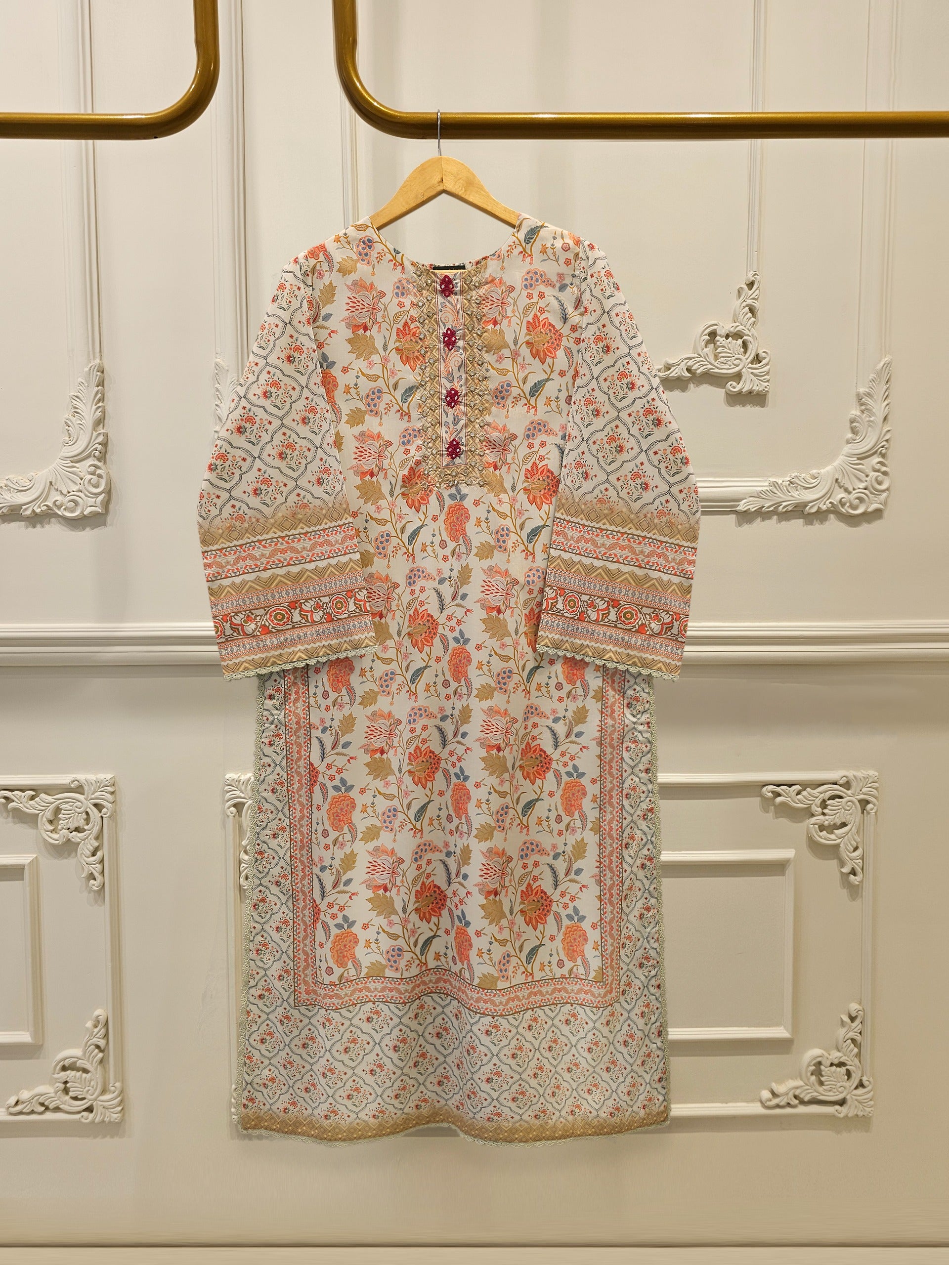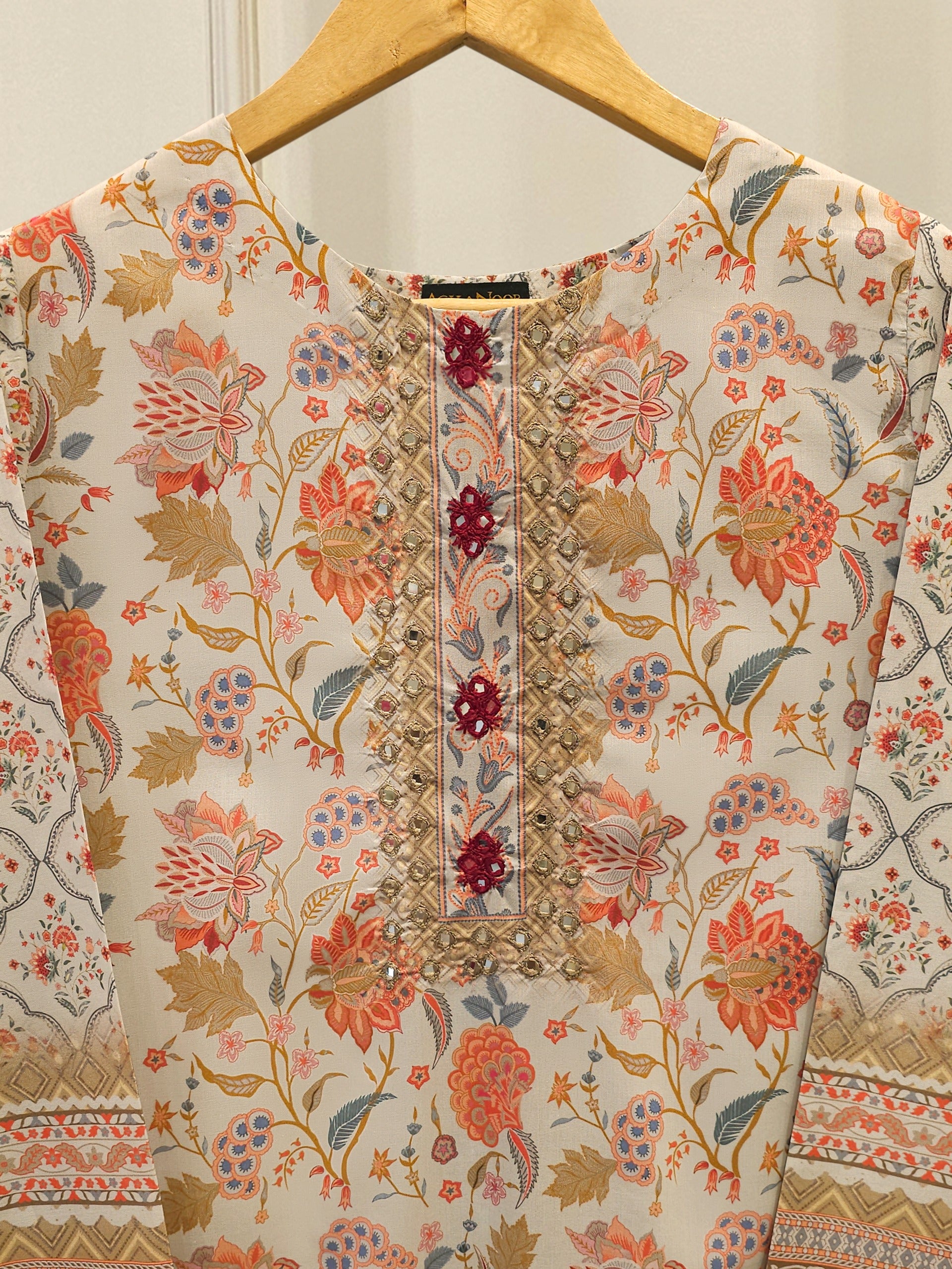 Elevate your summer wardrobe with this beautifully crafted multi cambric shirt, featuring intricate Chikan Kari work on the sleeves and daman. Designed for timeless elegance, this piece blends breathable lawn fabric with traditional craftsmanship, perfect for festive occasions or casual sophistication.