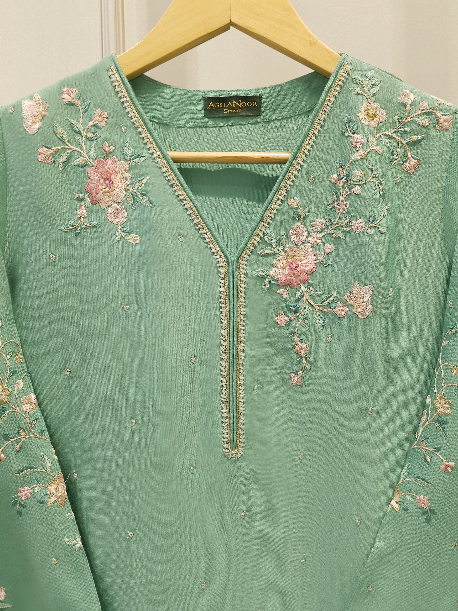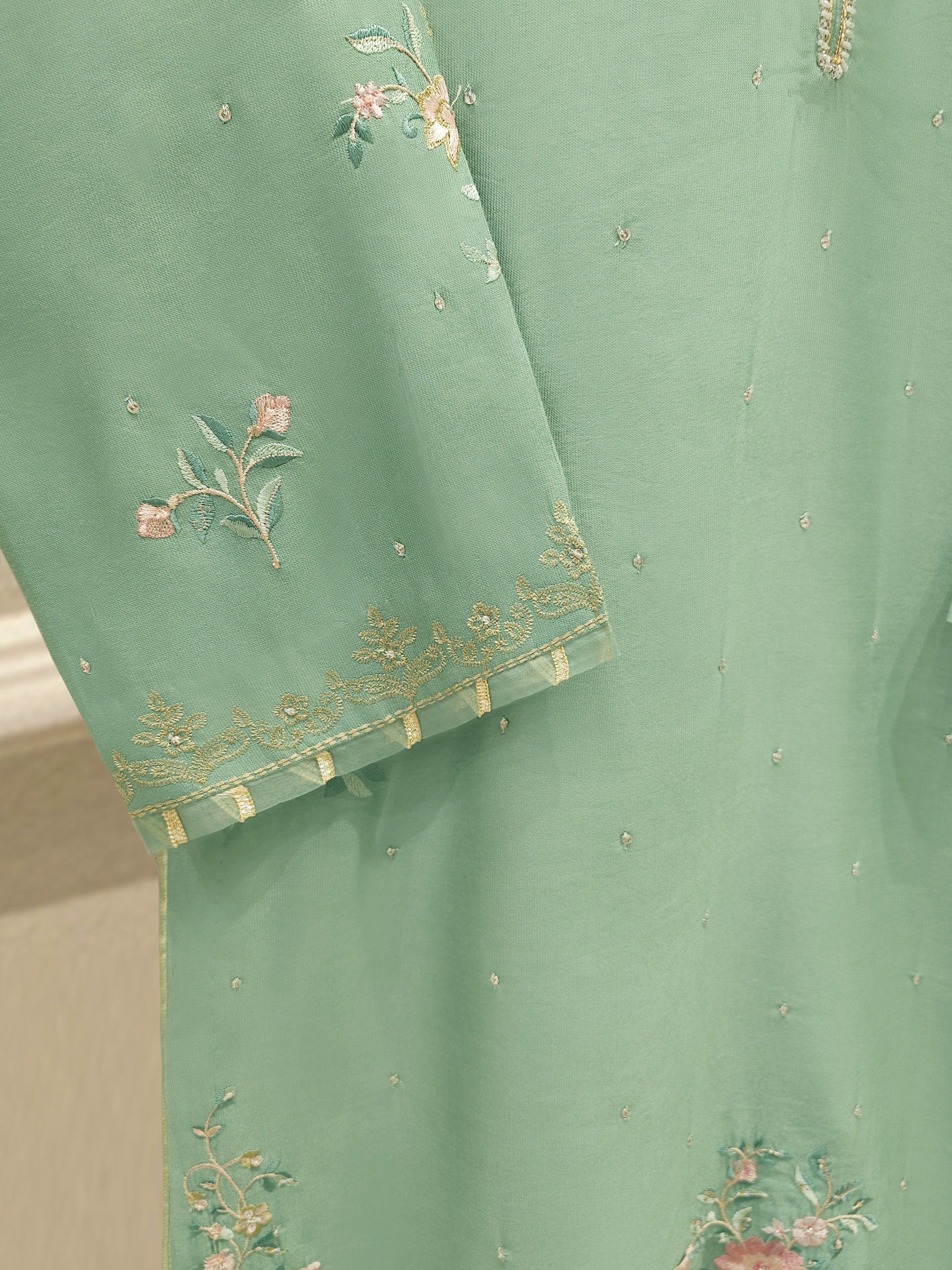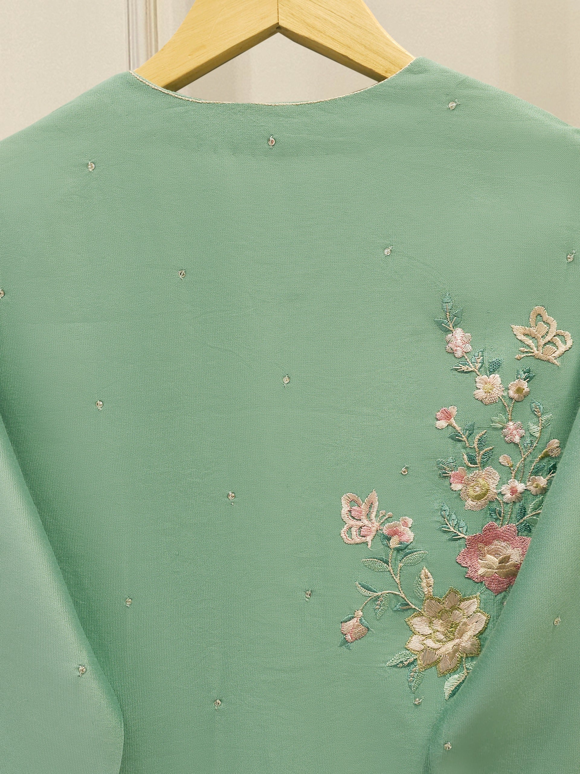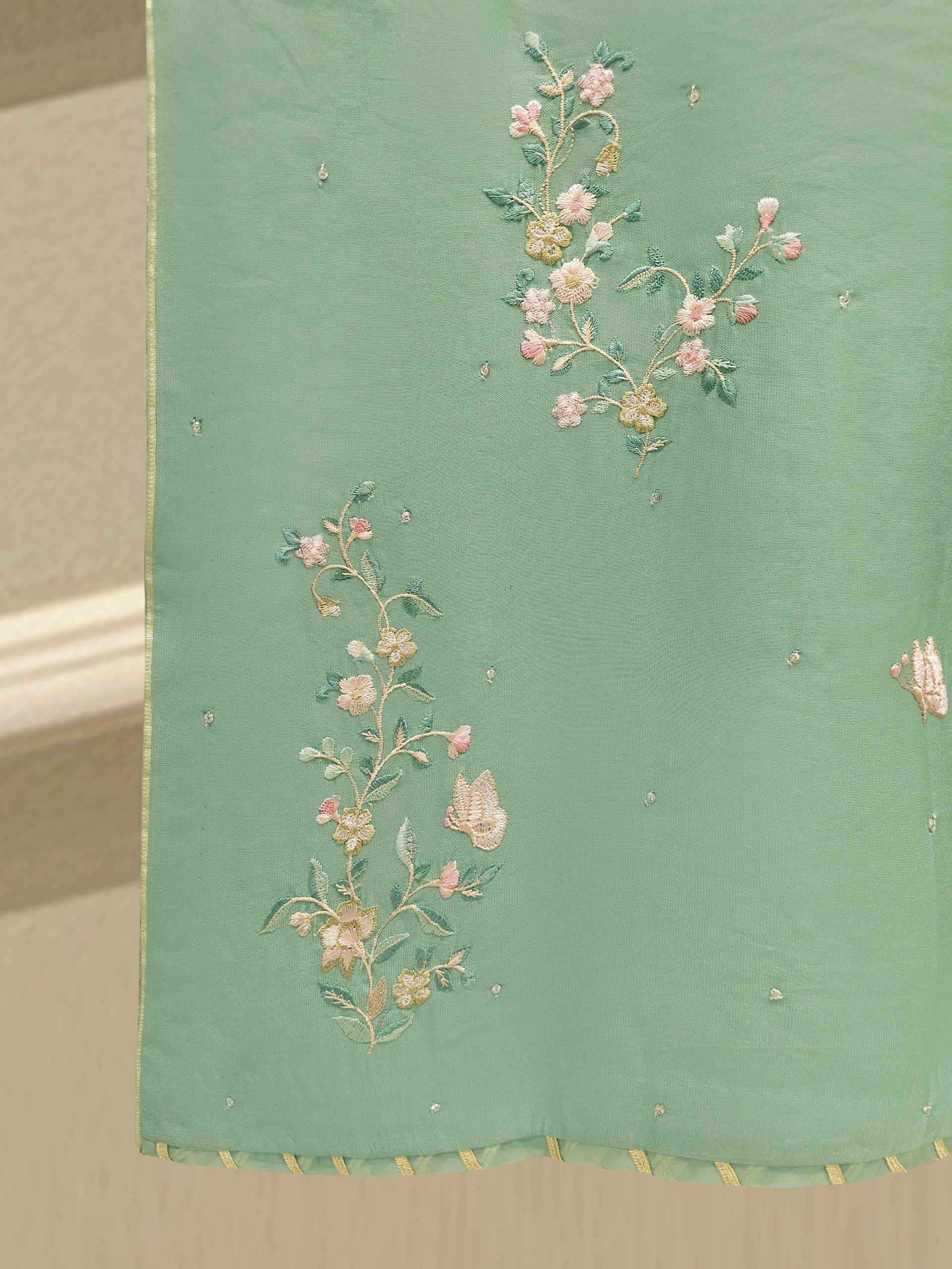 Elegant silk net shirt in a soothing mint green shade, beautifully adorned with delicate floral embroidery.