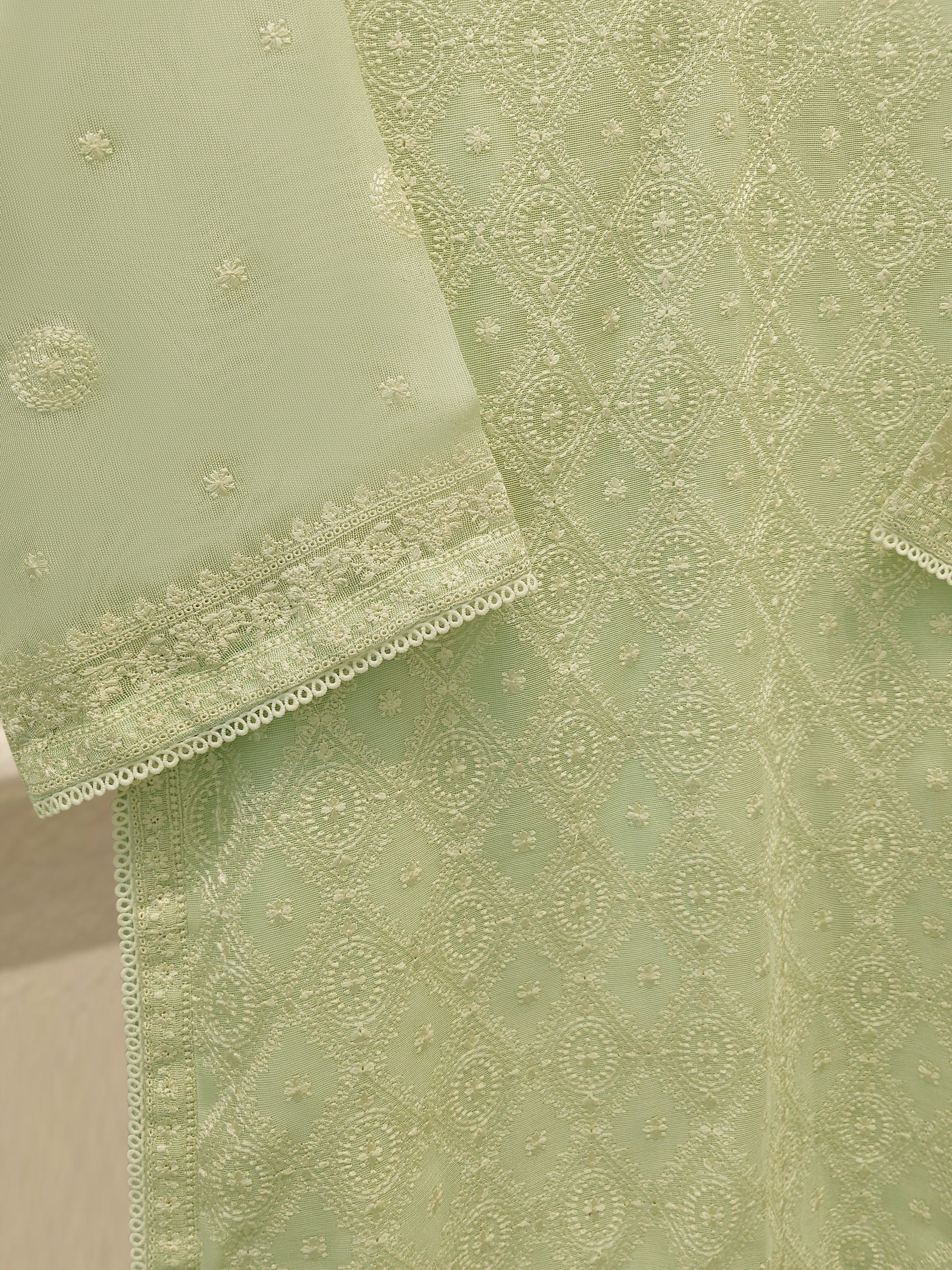 A three-piece cotton net unstitched suit is a graceful and breathable outfit choice, perfect for warm weather and semi-formal occasions. The set typically includes a cotton net shirt fabric, a matching trouser fabric, and dupatta. The lightweight cotton net material offers a soft, airy feel while showcasing elegant embroidery or delicate patterns.